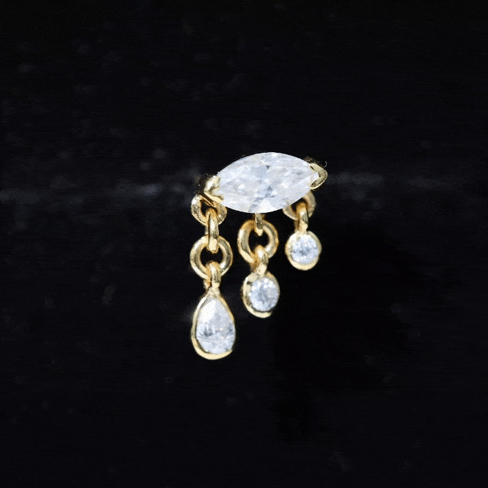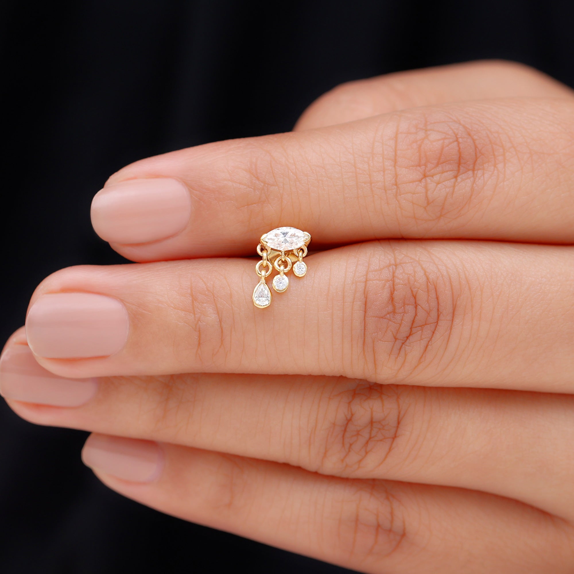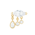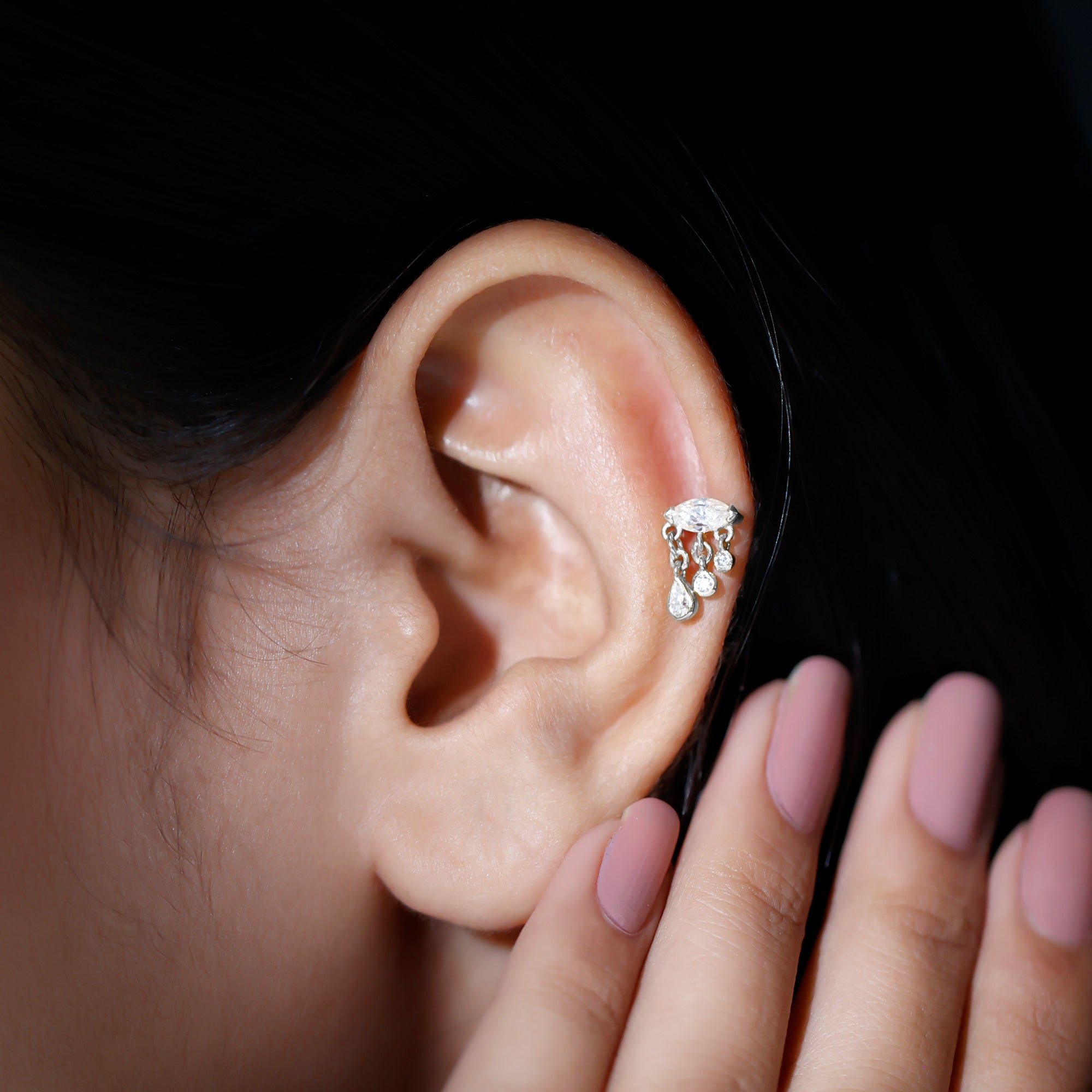 Bring a little extra sparkle to your ear style with this Moissanite Helix Earring. At the top sits a marquise cut moissanite set in a east west style, giving the Dangle Cartilage Earring a unique and stylish touch. From it, a pear cut and round cut moissanite gently hangs, creating a soft swinging effect that catches the light beautifully with every turn of your head. You can place it on your helix, cartilage, or upper lobe, and it still looks elegant and balanced. The flat-back closure keeps the ear piercing earring secure and comfortable, making it easy to wear throughout the day without irritation. Crafted with bright D-VS1 quality moissanites, the piece is full of brilliance. Whether you are heading out with friends, going to an event, or just updating your everyday ear stack, this Marquise Helix Earring adds charm and personality instantly. Lightweight, secure, and beautifully detailed, this Moissanite Dangle Earring is perfect for anyone who loves jewelry with movement and a bit of flair.