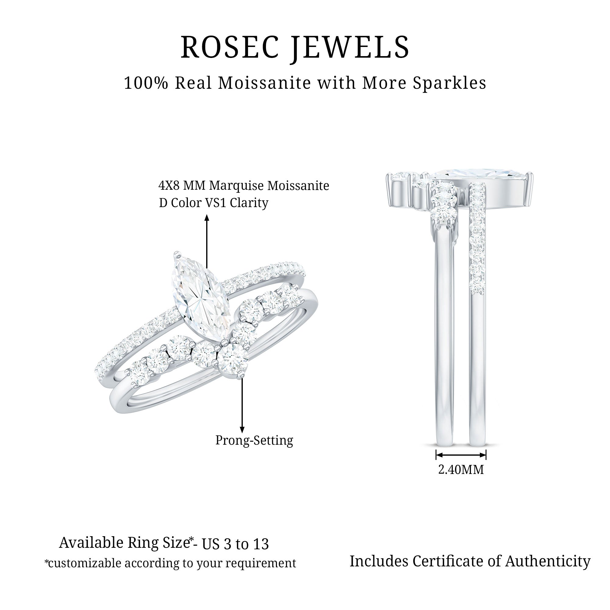 Modern elegance meets timeless charm in this beautifully designed Moissanite Engagement Ring Set. With a bold yet refined look, it is perfect for the bride who loves clean lines with a hint of sparkle. At the center of the set is a striking 4X8 MM marquise cut moissanite, known for its elongated shape and brilliant shine. Set in prong setting on a band lined with round moissanite stones, the center stone stands out with its exceptional fire and clarity, catching the light from every angle. The engagement ring is perfectly paired with a sleek chevron wedding band, designed in a subtle V-shape that hugs the solitaire ring gracefully. Accented with round cut moissanites, this modern band adds extra sparkle while creating a balanced, stylish silhouette. Together, the rings form a unique and elegant Marquise Wedding Ring Set that feels both minimalist and meaningful. Whether it is for a proposal, a wedding day, or a special celebration, this Engagement Ring with Wedding Band is made to mark the moment with beauty and grace. Crafted with attention to every detail, the set brings a fresh twist to classic design, ideal for the bride who appreciates simplicity but still wants something that stands out.