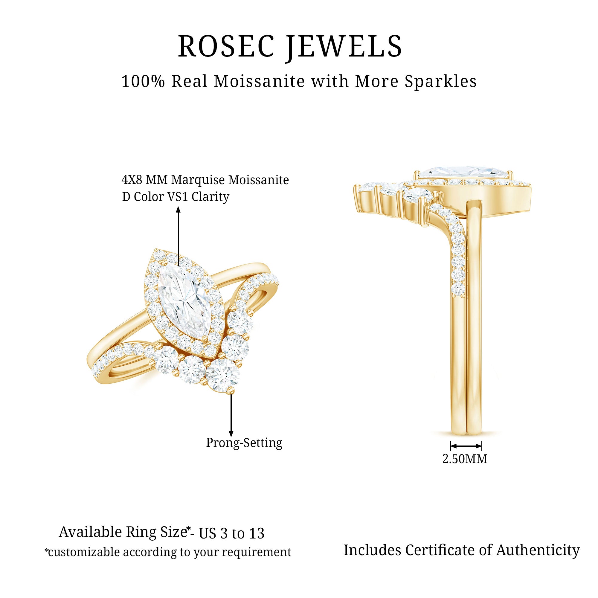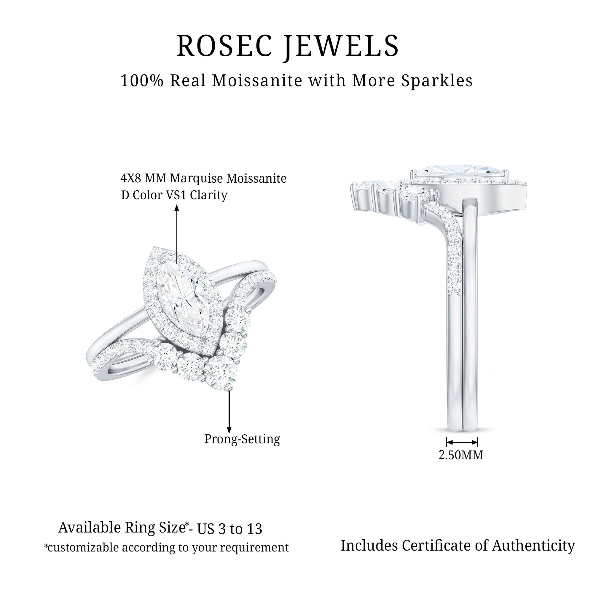 Let your love story shine with this beautiful Moissanite Bridal Ring Set, blending timeless elegance with a modern touch. Perfect for marking life’s most meaningful moments, this Marquise Wedding Ring Set includes a halo engagement ring and a matching chevron wedding band, both designed to reflect the brilliance of your forever bond. At the heart of the engagement ring is a stunning 4X8 MM marquise cut moissanite set in prong setting. Surrounding the center stone is a delicate halo of round moissanite gems, adding extra shine and enhancing the graceful shape of the marquise cut. The result is a romantic, glowing centerpiece that captures attention from every angle. Paired with the engagement ring is a sleek chevron band that fits perfectly around the halo style. This band is accented with graduated round moissanite stones, giving the Halo Wedding Set a stylish, stacked look that feels both classic and fresh. Crafted with care and precision, this set is made with D-VS1 quality moissanite stones, a brilliant, ethical, and affordable alternative to traditional diamonds. Designed for daily comfort and long-lasting shine, the Moissanite Engagement Ring Set is available in US ring sizes 3 to 13.