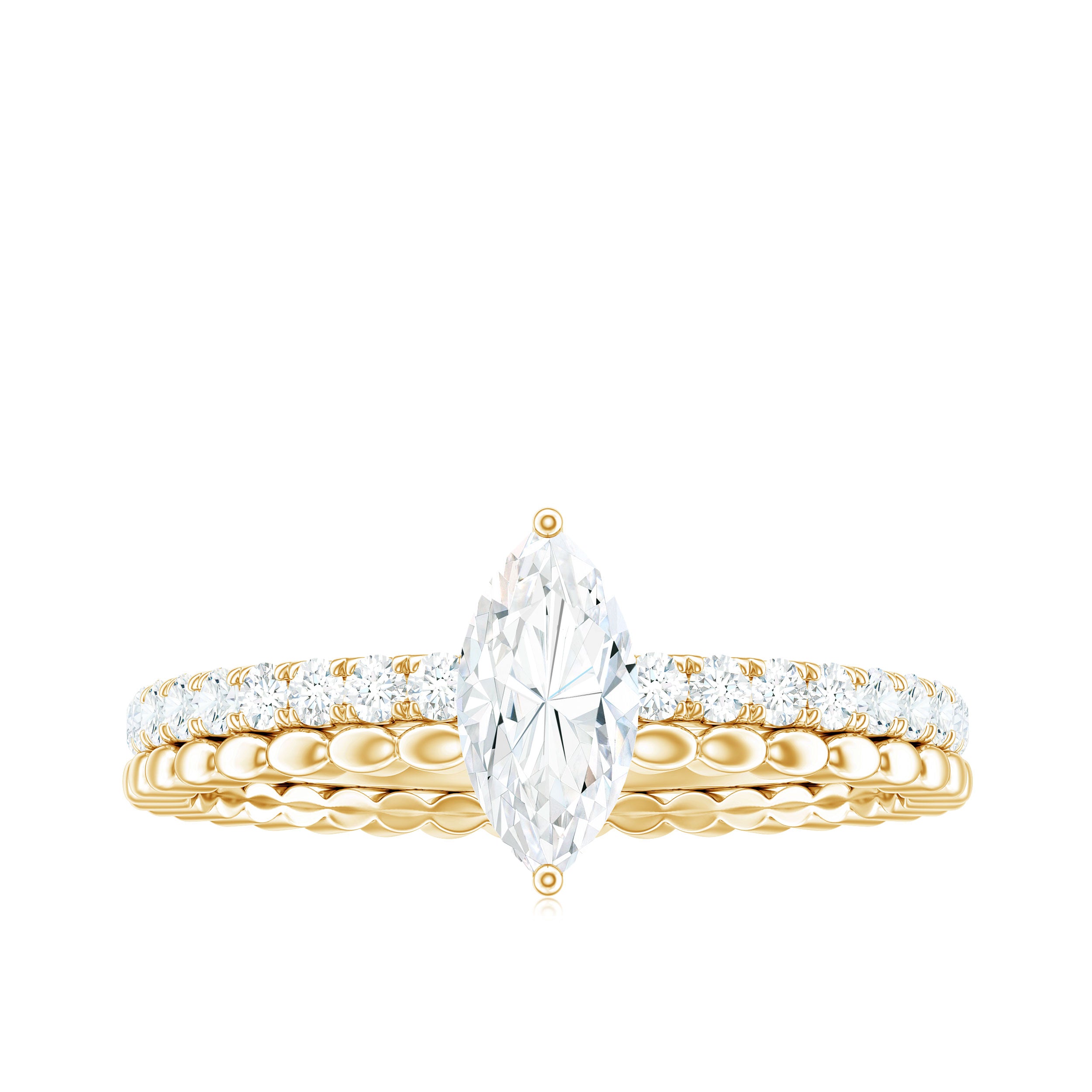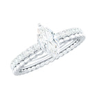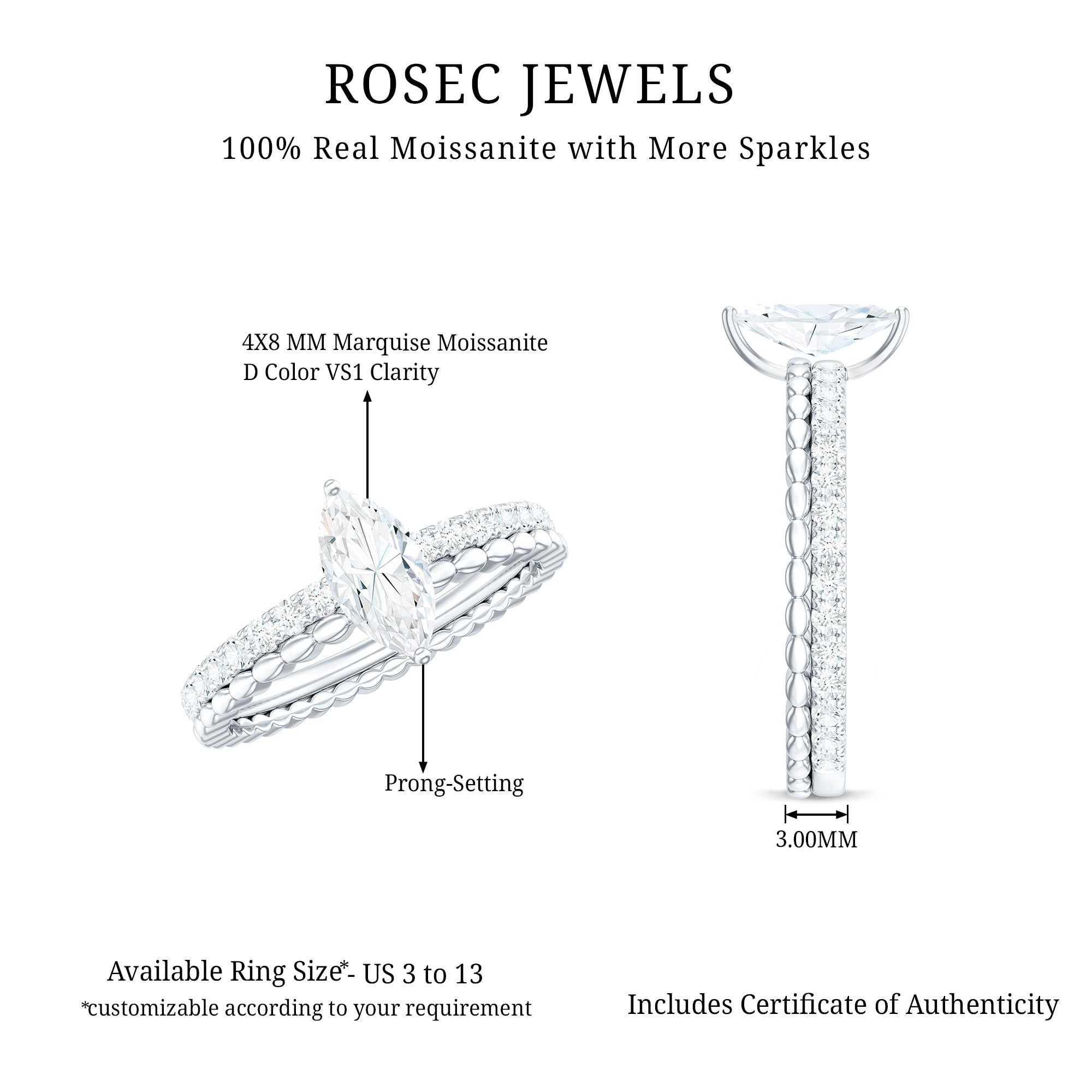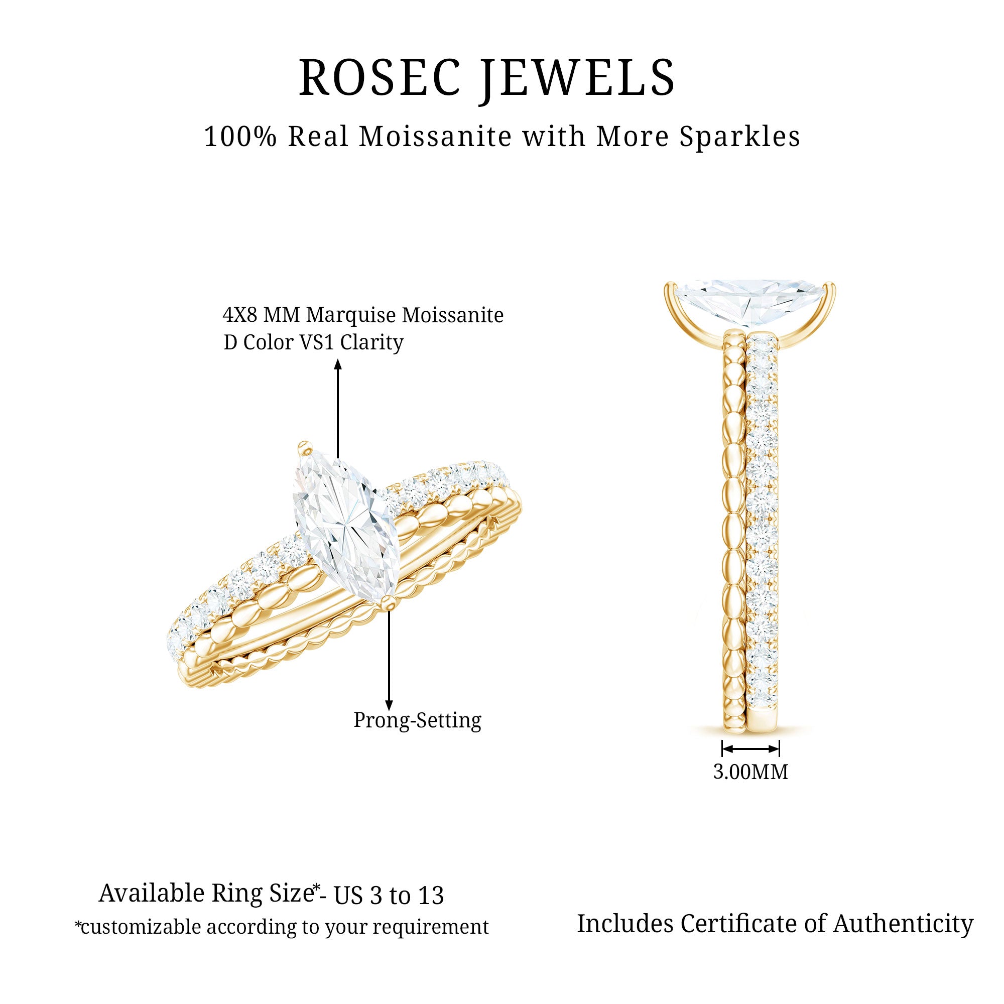 Win her heart with the stunning details of this Solitaire Engagement Ring, featuring a 4X8 MM Marquise Cut Moissanite (D-VS1 quality) securely set in 2 prongs. This unique and artistic touch, with shank embellished with a row of surface prong set round cut moissanites for a constant sparkle, closed with the other displays delicate scalloped metal motifs for a contemporary vibe. Together, these elements in this Big Moissanite Engagement Ring create the look of a stackable ring while ensuring the comfort of a single band. Designed to symbolize everlasting love, this Marquise Moissanite Ring is perfect for the bride who values elegance, uniqueness, and timeless beauty. It comes beautifully packaged in a premium jewelry box, ready to be gifted and cherished for a lifetime. Made with precision and style, the Marquise Engagement Ring is offered in various metal types and colors, providing a luxurious and sustainable symbol of your connection.