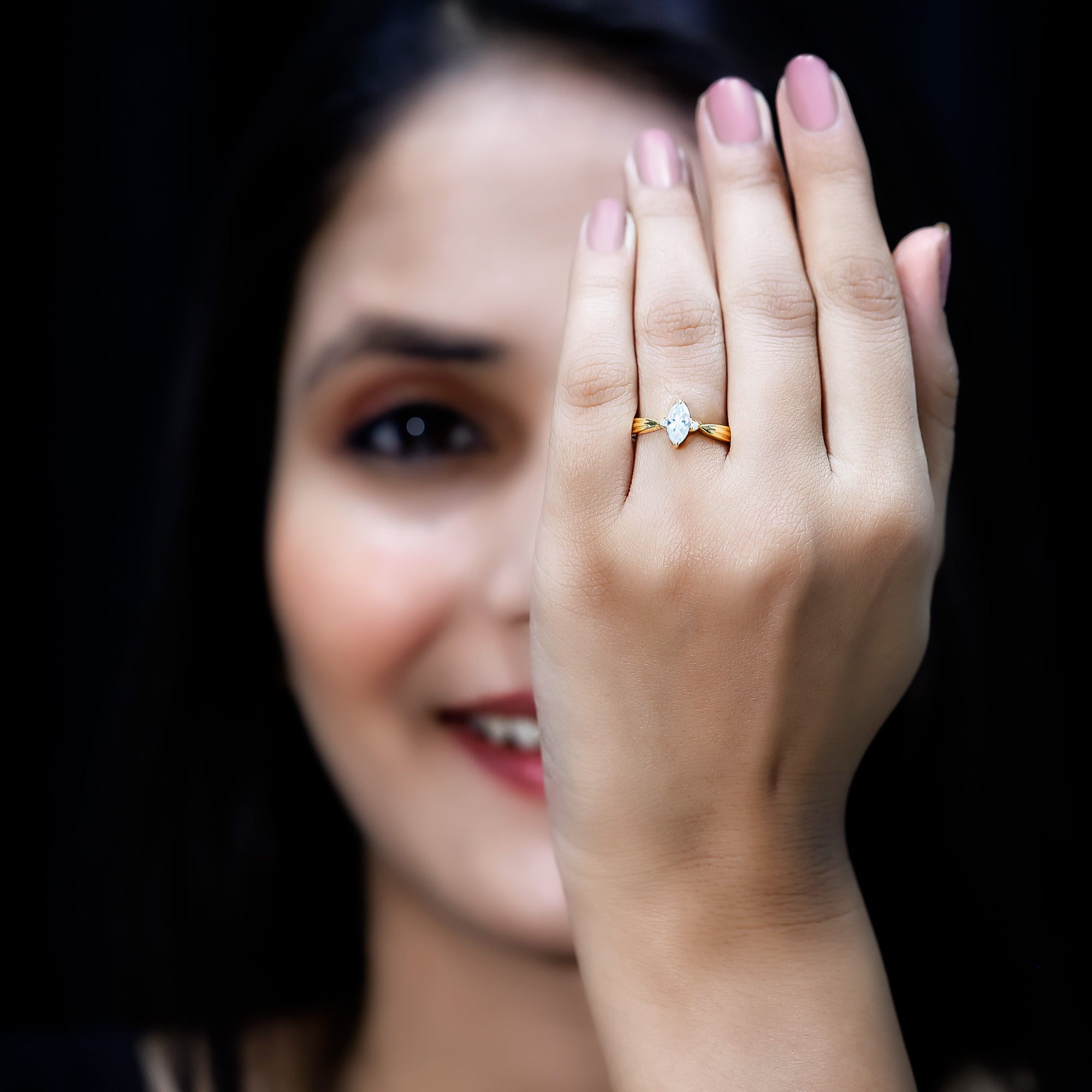 Adorn your finger with the intricate and captivating design of this Moissanite Solitaire Ring. The 4X8 MM Marquise Cut Moissanite in a Prong Setting creates a modern and stunning look, perfect for everyday wear or as a sophisticated office accessory. The Solitaire design has cathedral style shank adds a touch of uniqueness to this Promise Ring. With a total weight of 3/4 Carat and a quality of D Color VS1 Clarity, this ring is certified and has undergone a strict quality check. The Moissanite Promise Ring is available in a range of sizes to ensure a perfect fit. It is an affordable Jewelry Gift option, as it sparkles like a Natural Diamond and comes in various precious metal choices to fit your budget. Showcase the profound love you share with this Solitaire Moissanite Ring for Women, symbolizing love and commitment.