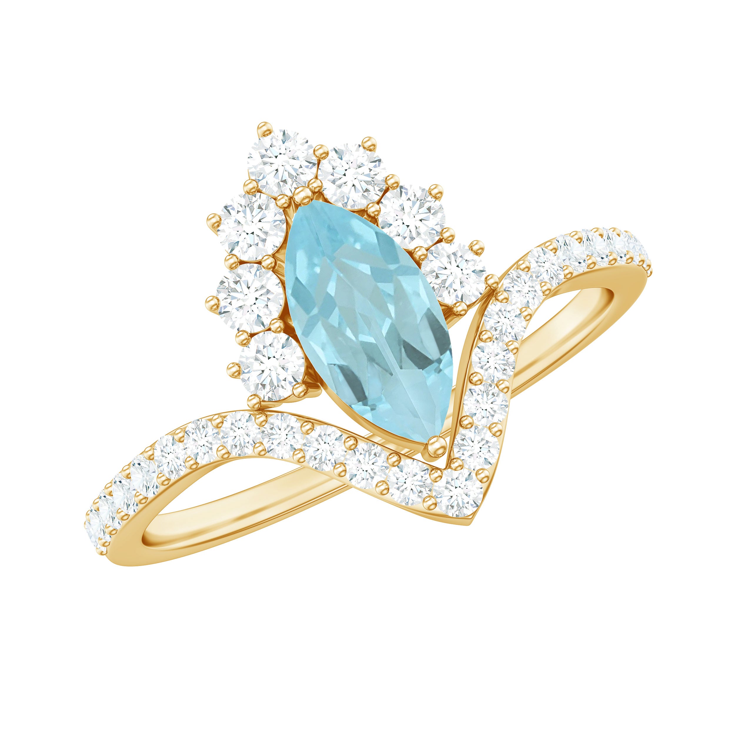 Bring attention to your style by wearing this elegant Designer Ring adorned with Marquise Cut Sky Blue Topaz in Prong Setting with Round Shape Diamond Halo. This Sky Blue Topaz Ring is crafted with Gold for a timelessly luxurious look. This Blue Gemstone Ring will be a perfect choice to wear on any special occasion.