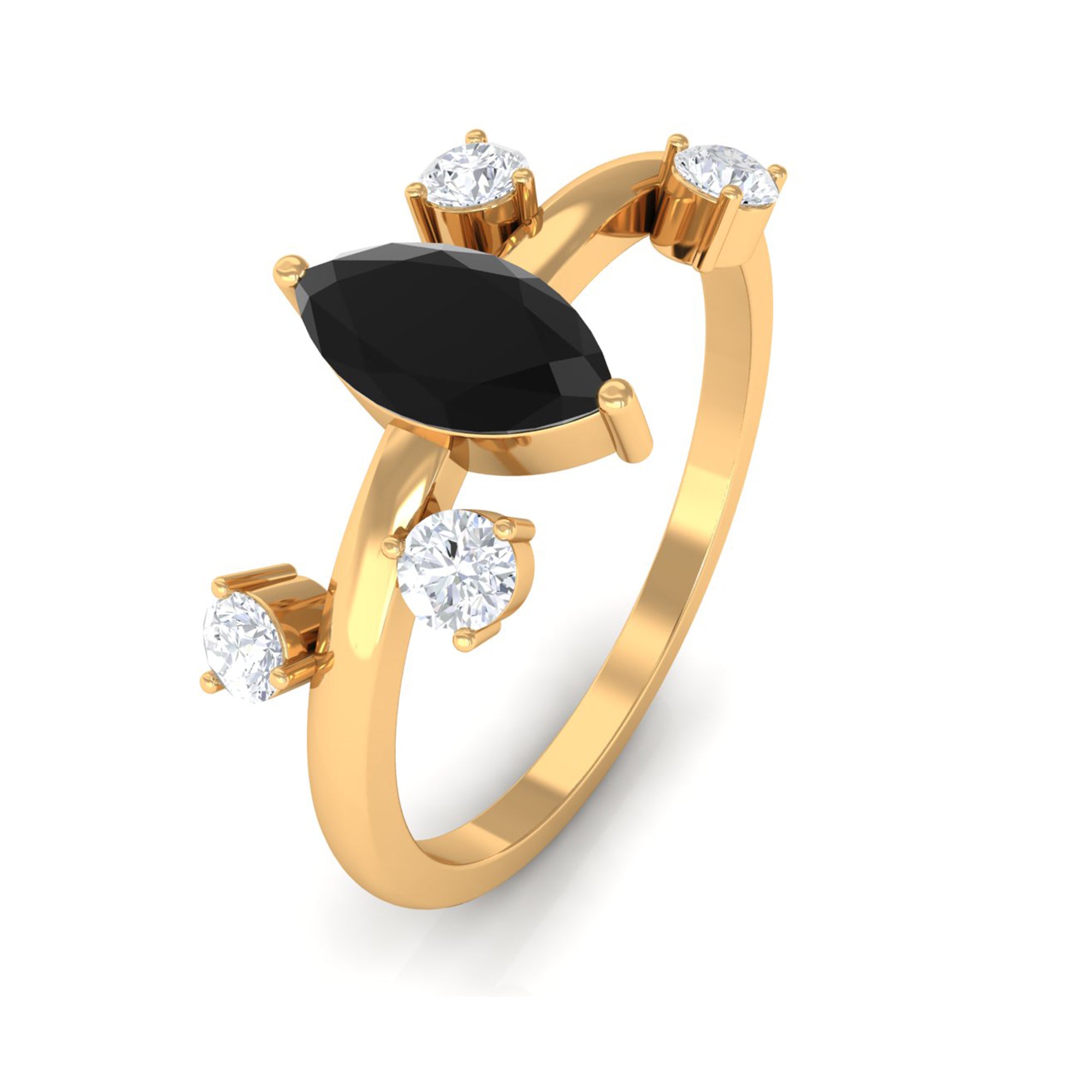 Minimal Gold Ring is embellished with Marquise Cut Black Spinel beautifully and Round Diamond are scattered on the shank to give this ring an appealing look. This Black Spinel Promise Ring is crafted in Gold for its luster and classy touch. This Black Spinel Ring is a present worth giving your partner.