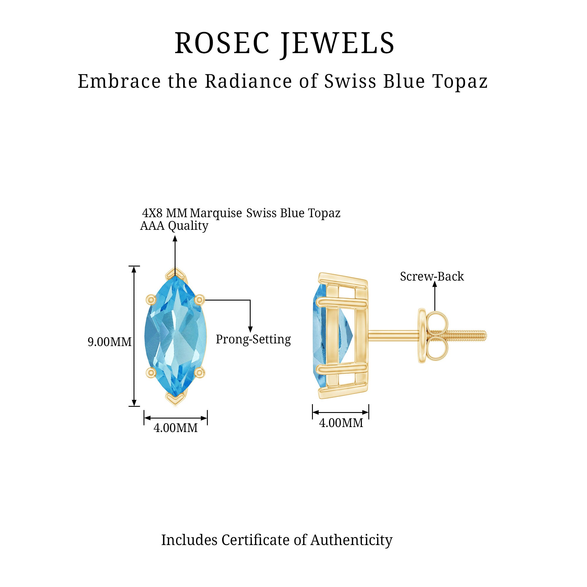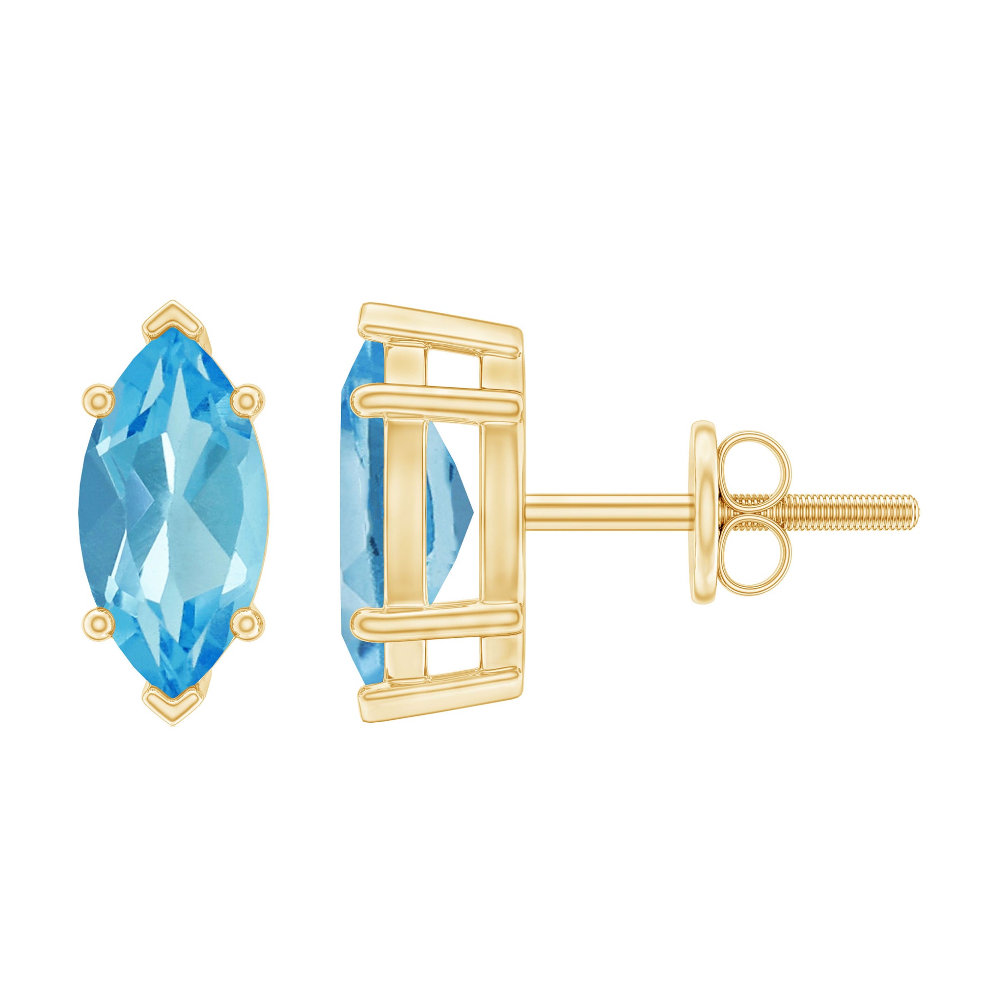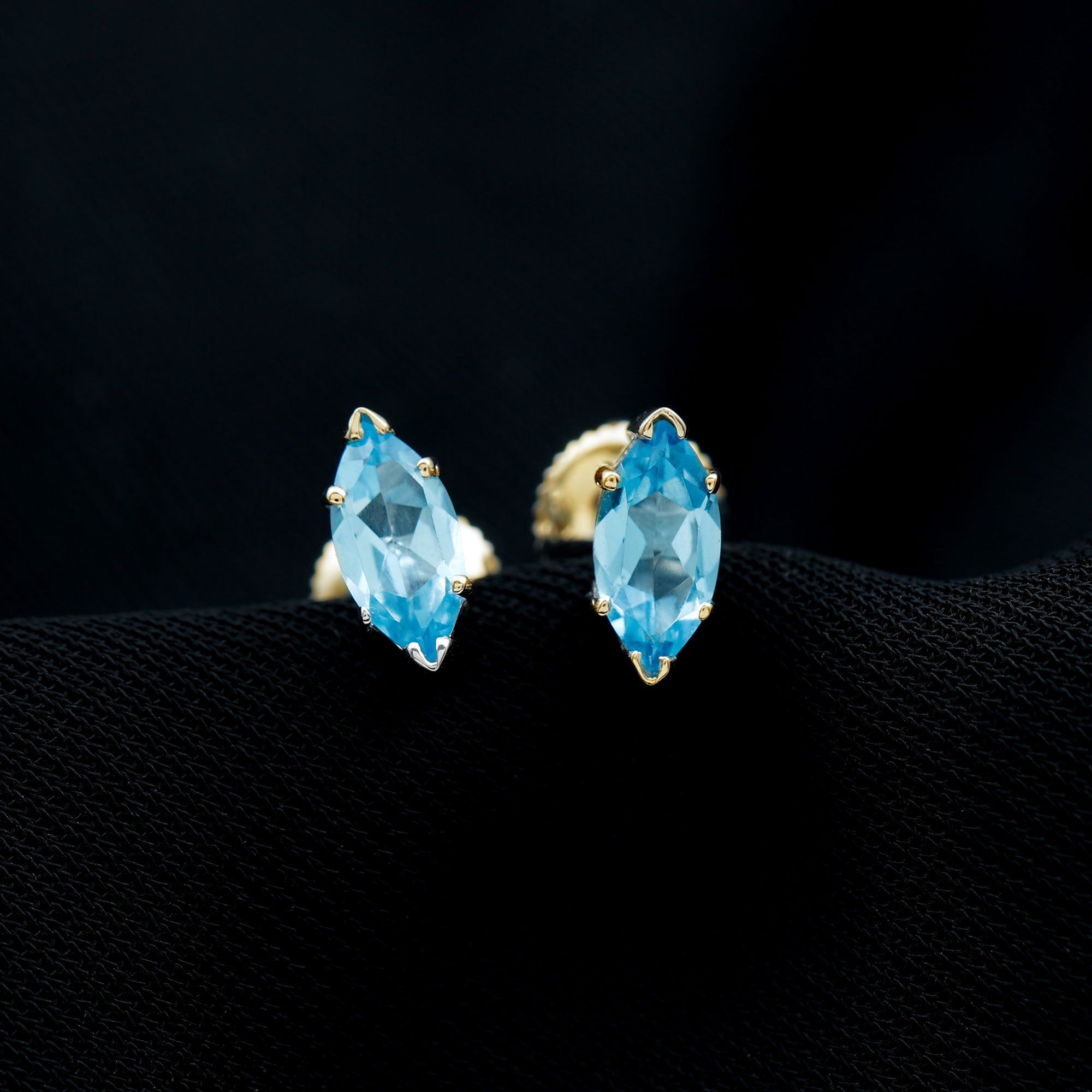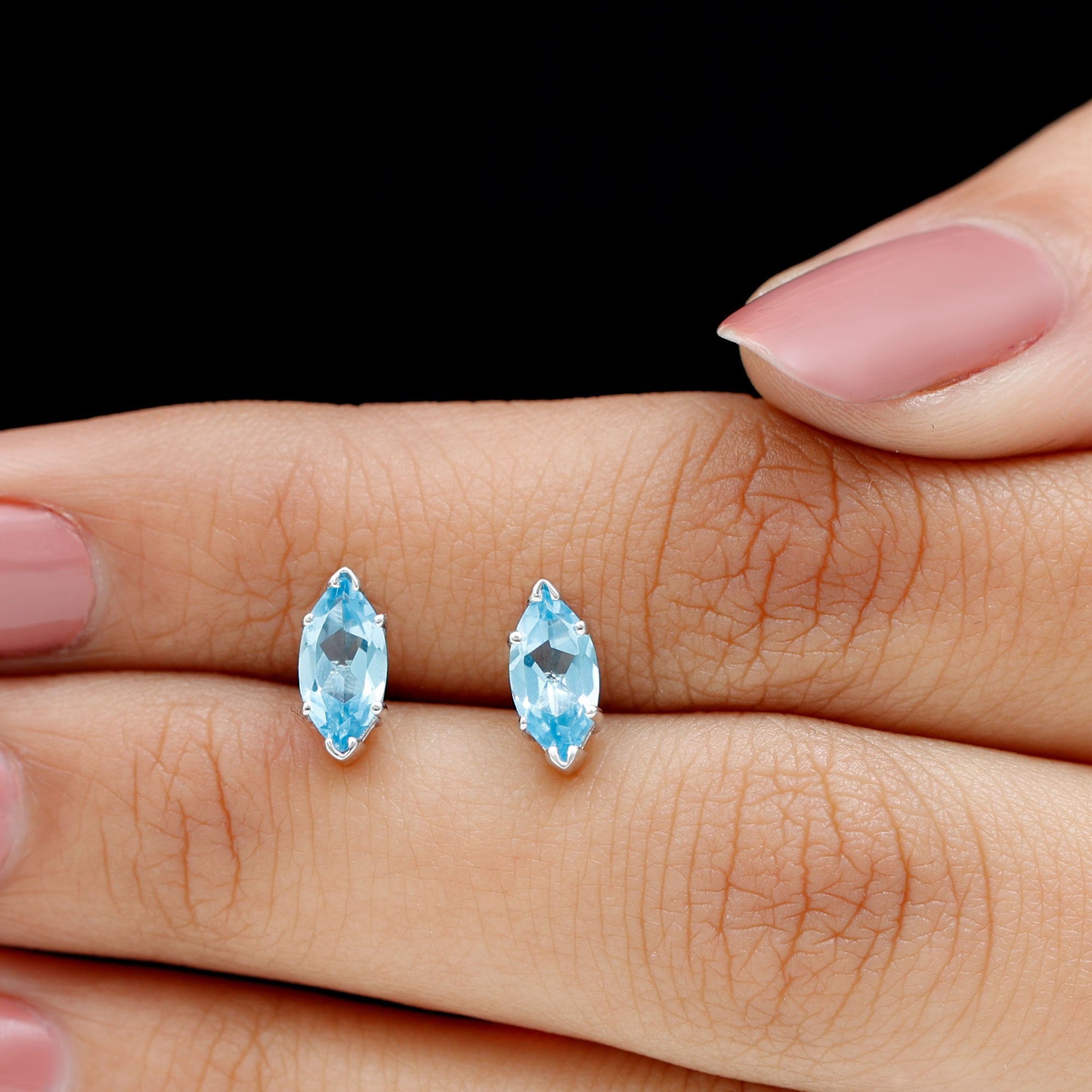 Elevate your elegance with our exquisite stud earrings, adorned with Marquise Cut Swiss Blue Topaz gems delicately set as solitaires in secure prong settings. These stunning accessories enhance your beauty, adding a touch of sophistication and brilliance to any ensemble. Whether for a special occasion or everyday wear, these earrings are the perfect choice to showcase your style and grace.