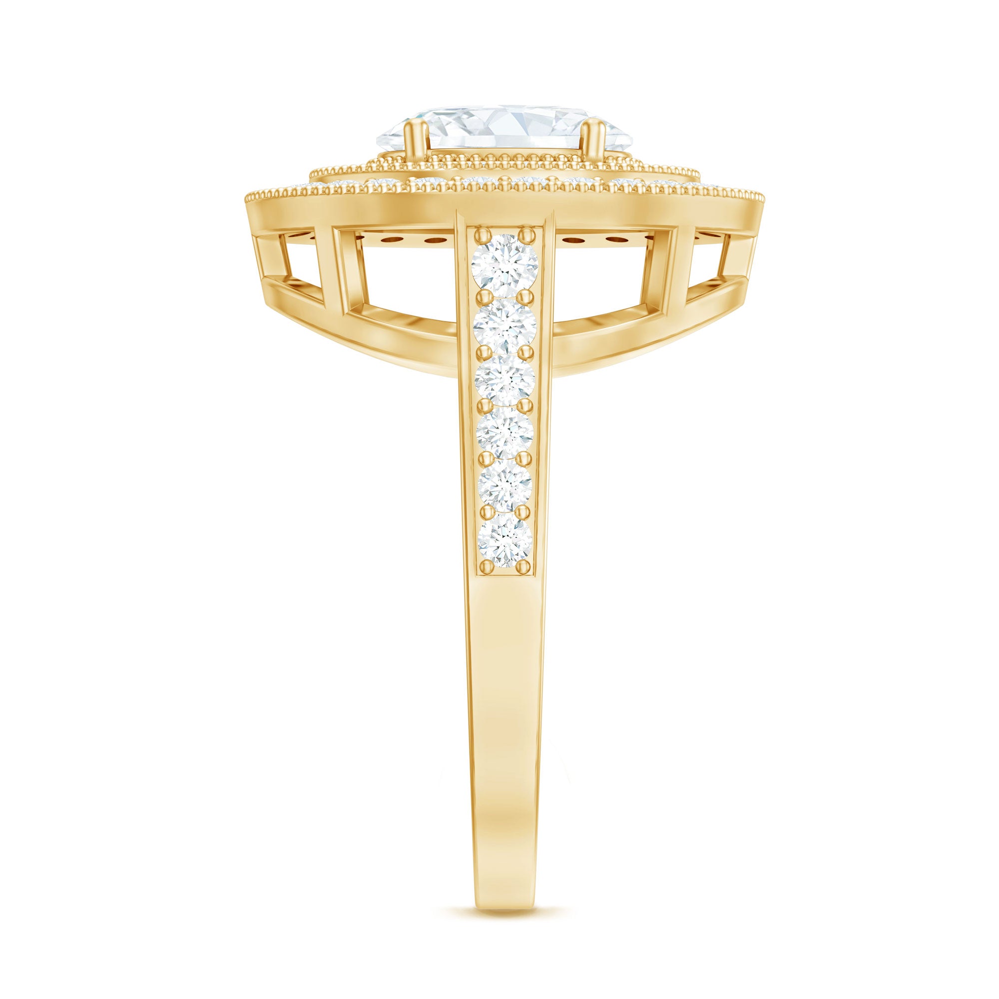 Rediscover the charm of vintage elegance with this gorgeous Moissanite Engagement Ring. Drawing inspiration from classic beauty and old-world allure, this handcrafted piece is perfect for those with a taste for sophistication. At its heart, a stunning 6X8 MM oval cut moissanite shines brilliantly, securely held in prong setting that allows its radiance to dazzle. Encircling the main stone is a stunning double halo of round moissanites and intricate beaded detailing, adding layers of depth, fire, and sparkle, like a radiant frame for your love story. Ideal for anyone who values both history and elegance, this Statement Engagement Ring for Women combines timeless design with contemporary sparkle. Featuring D color and VS1 clarity moissanite stones, you will enjoy all the brilliance and fire you desire while opting for a more sustainable and thoughtful choice over traditional diamonds. Beautifully packaged and offered in various metal options and ring sizes, this Vintage Moissanite Ring is all set to become a cherished part of your forever.