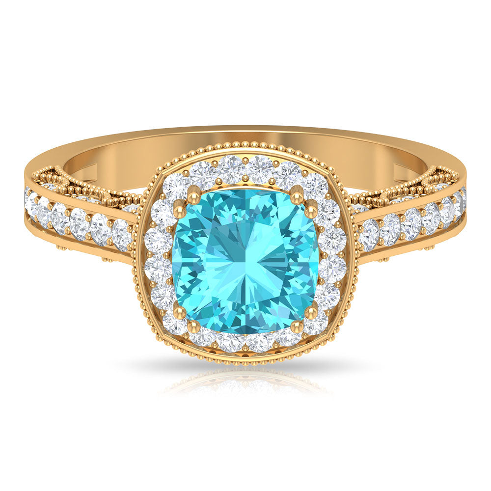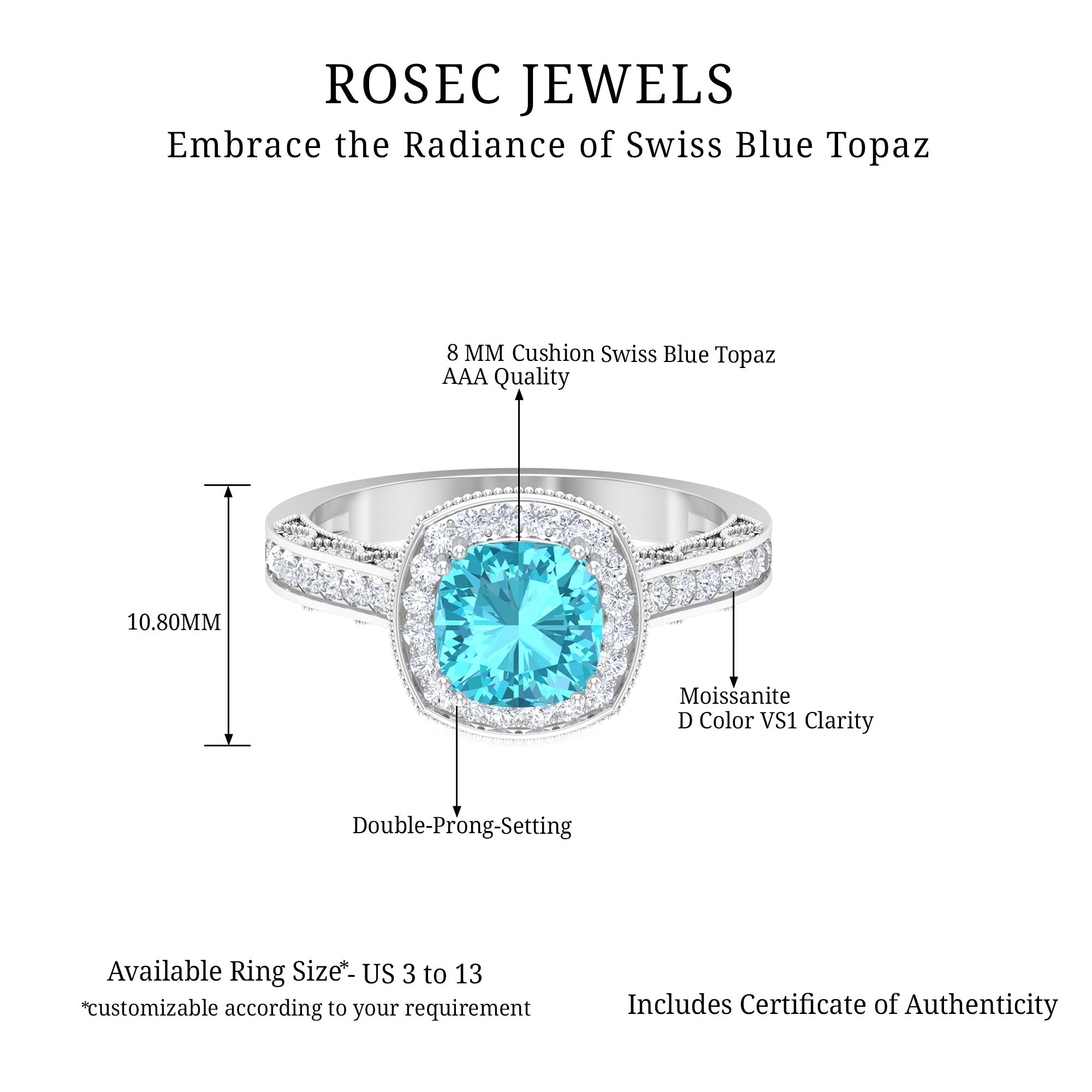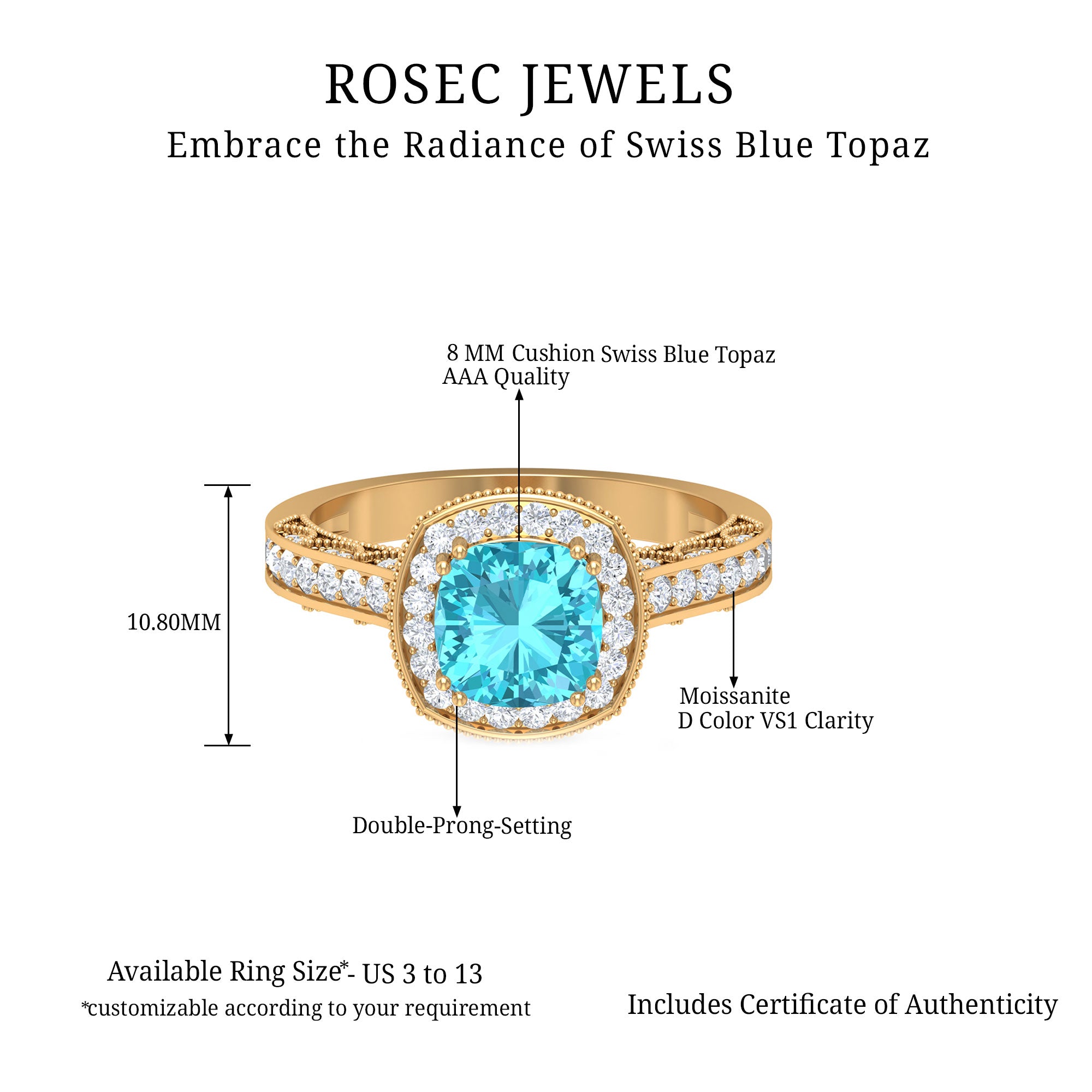 This Unique Milgrain Engagement Ring is embellished with Cushion Cut Swiss Blue Topaz Gemstone is set at the center in a Prong Setting encircled with small Brilliant Round Cut Moissanite and more Moissanite are set as Side Stones, crafted in a Solid Gold.
