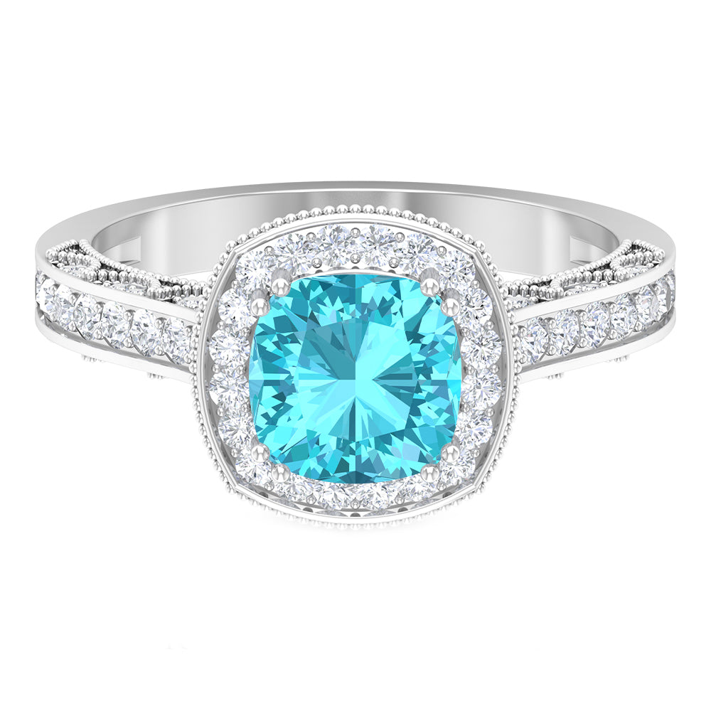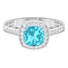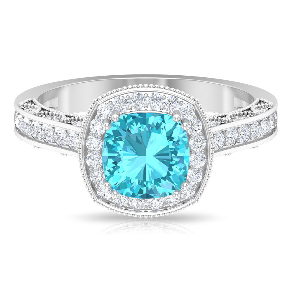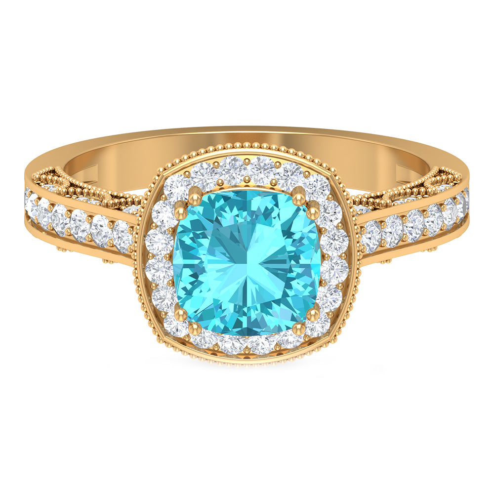 This Unique Milgrain Engagement Ring is embellished with Cushion Cut Swiss Blue Topaz Gemstone is set at the center in a Prong Setting encircled with small Brilliant Round Cut Moissanite and more Moissanite are set as Side Stones, crafted in a Solid Gold.