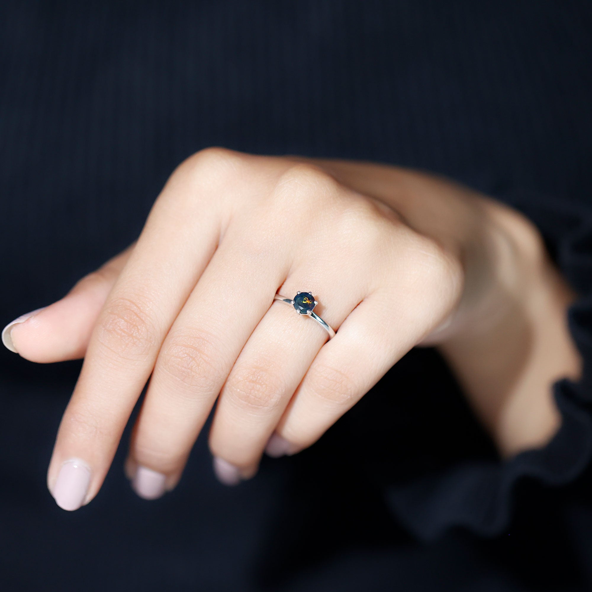 This Black Opal Ring is delicately crafted with a sleek and slender design, making it an ideal everyday accessory. The solitaire ring features a Round Cut Black Opal set in a 6 Prong Peg Head setting, symbolizing a significant promise in any relationship. This charming and minimalist Black Opal Promise Ring is a perfect choice to express your commitment to your significant other when youre ready to take your relationship to the next level.