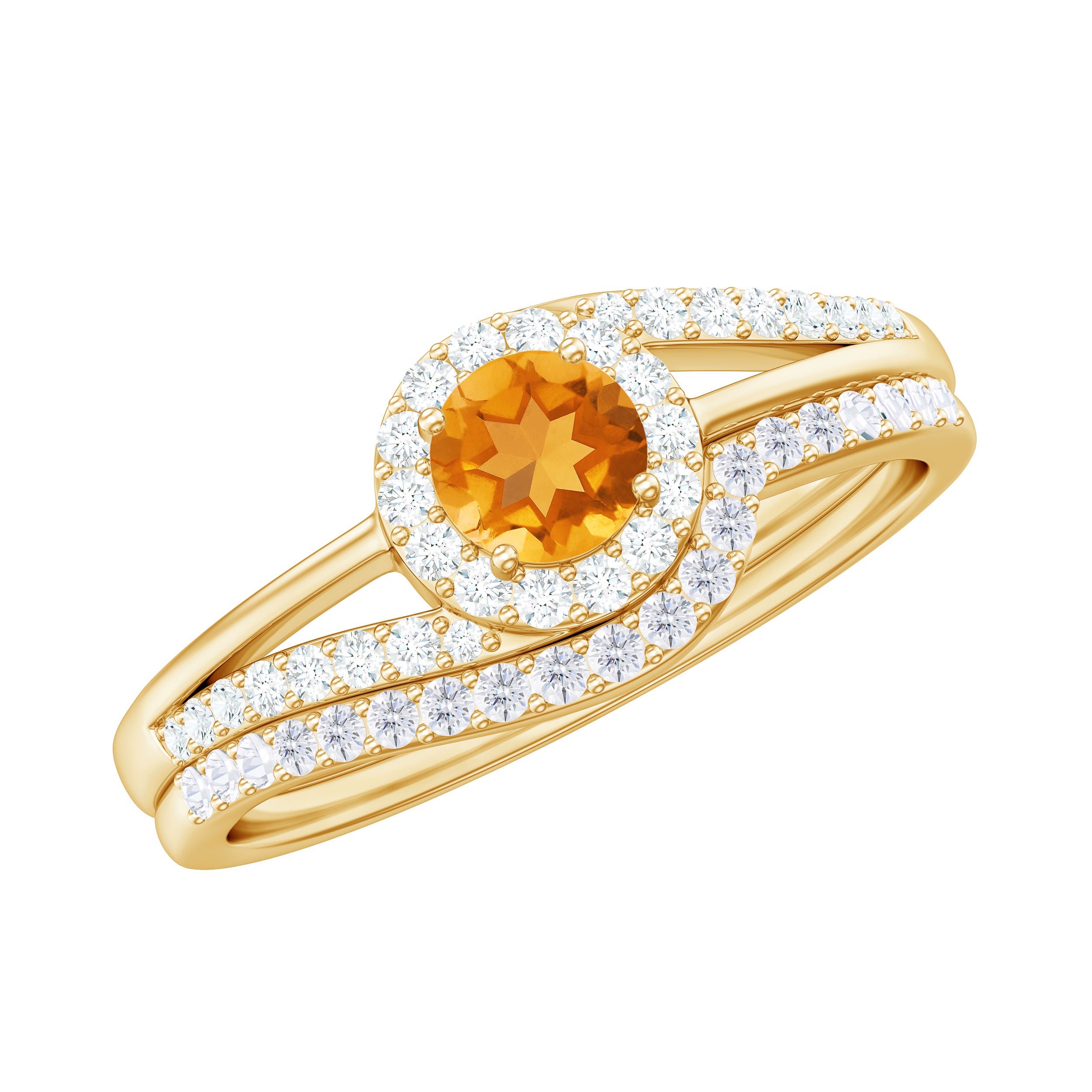 This Engagement Ring with Enhancer is embellished with Round Shape Citrine is set at the center encircled with Round Shape Diamond and more Diamond are set on the split shank and Enhancer Ring is encased with Round Shape Diamond, crafted in a Solid Gold.