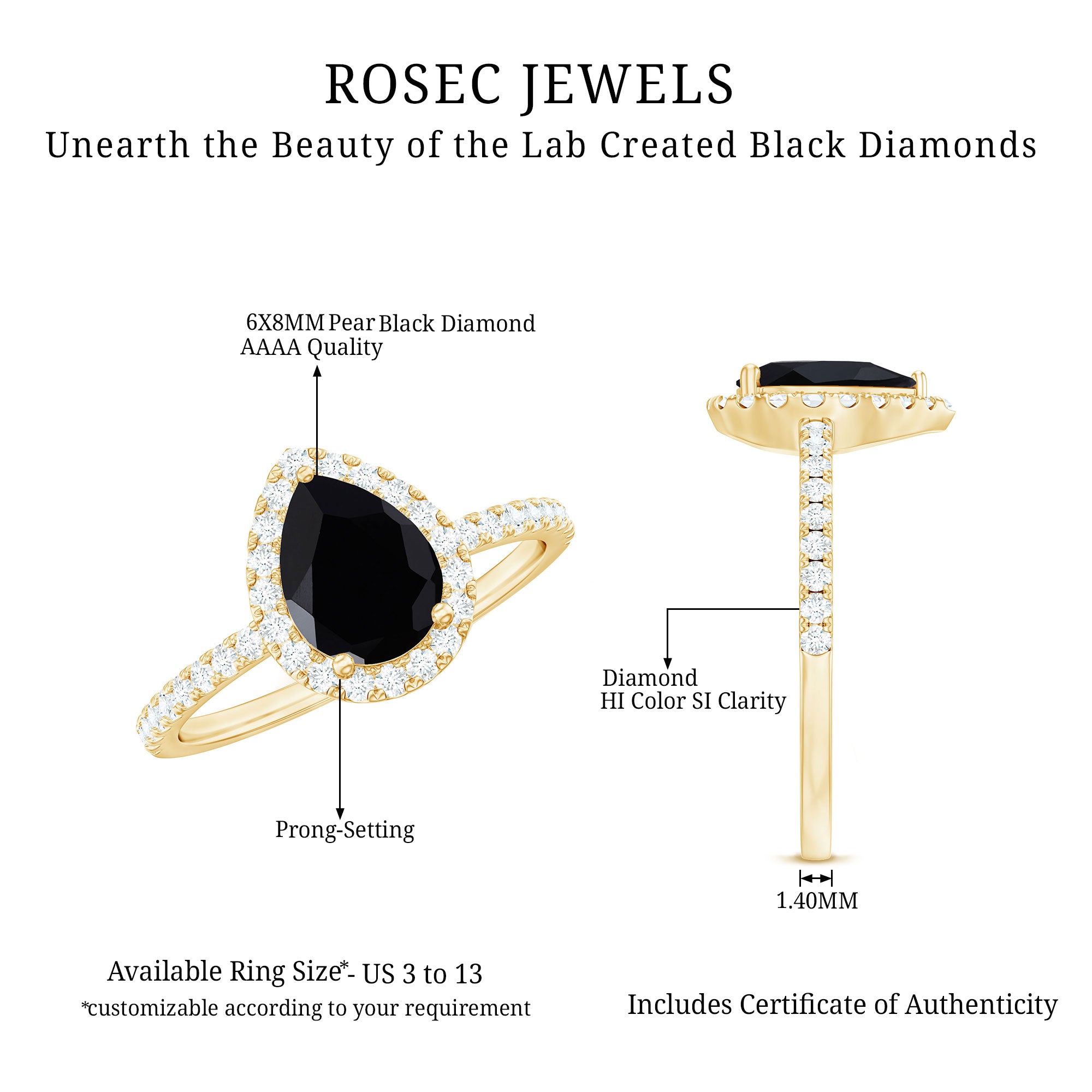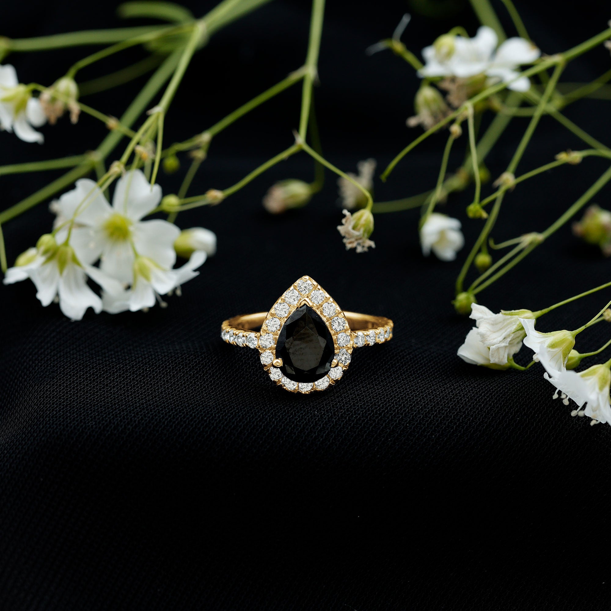 A stunning and timeless Teardrop Engagement Ring with a beautiful design would make a wonderful gift for your significant other. This understated yet elegant engagement ring features a Pear Cut Created Black Diamond at the center, surrounded by a Halo of Round Diamond and Side Stones. The Created Black Diamond Engagement Ring is crafted with Gold Metal for a luxurious finish.