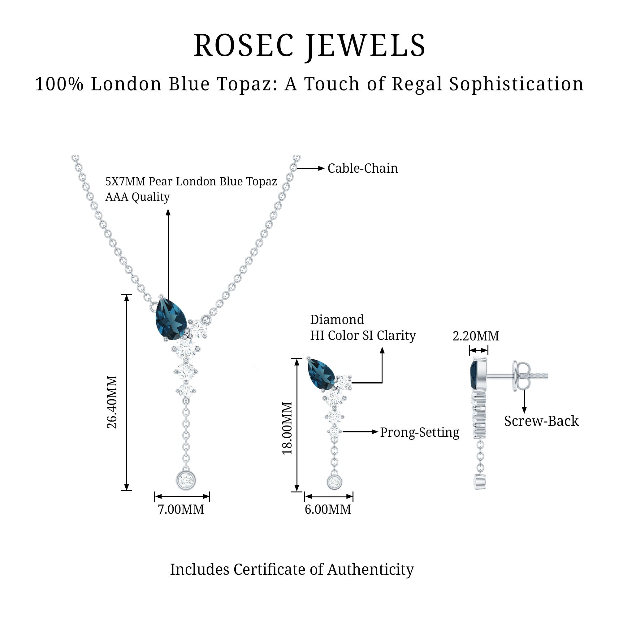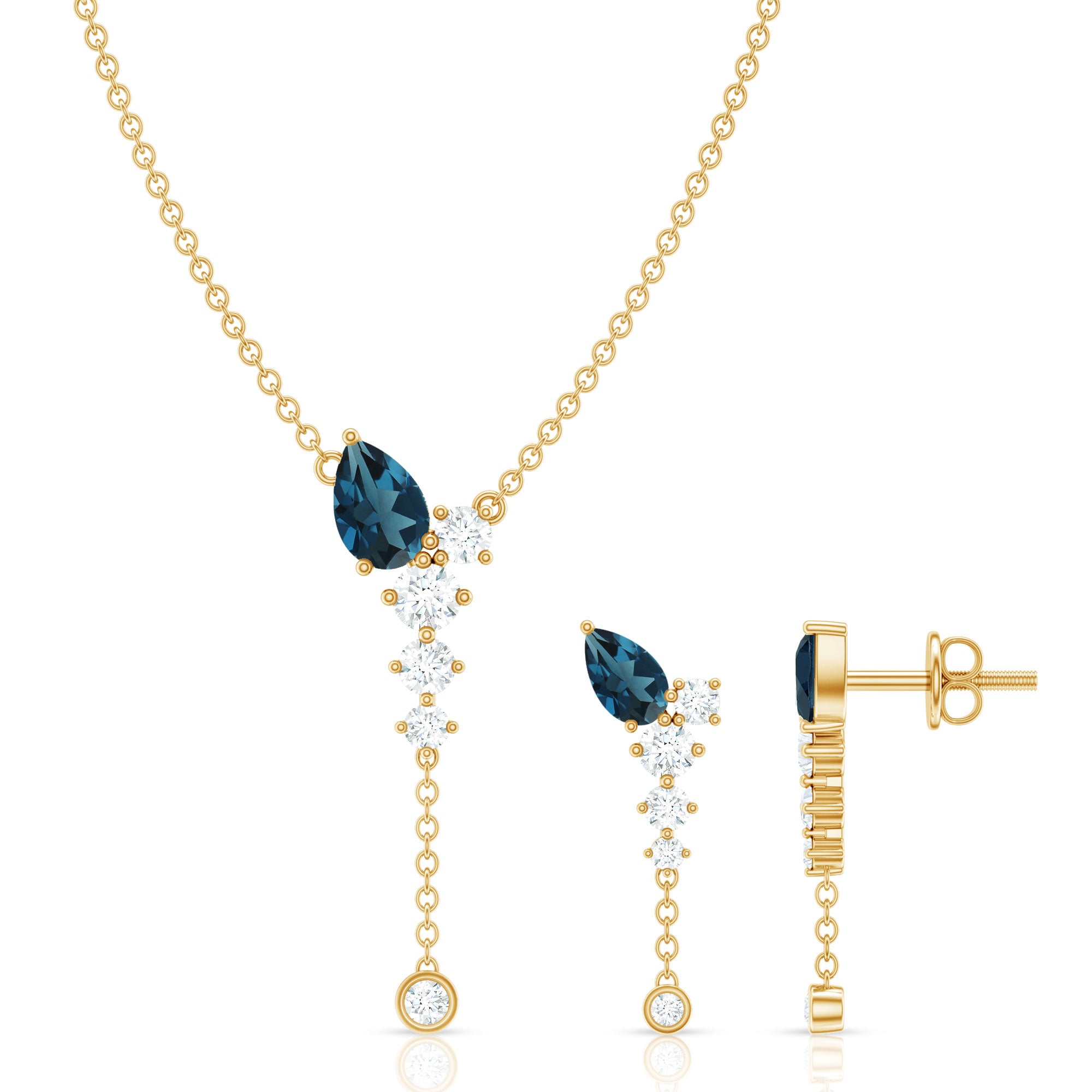 A breathtaking Jewelry Set designed for your most special occasions. This exquisite set features Pear Cut London Blue Topaz gemstones delicately placed in a Prong Setting, accompanied by shimmering Diamond accents on both the Y Pendant and Earrings. The chain of the pendant showcases a charming round Diamond that dangles gracefully. With its alluring design, this London Blue Topaz Gemstone Jewelry Set is truly adorable and will make you stand out on any occasion.