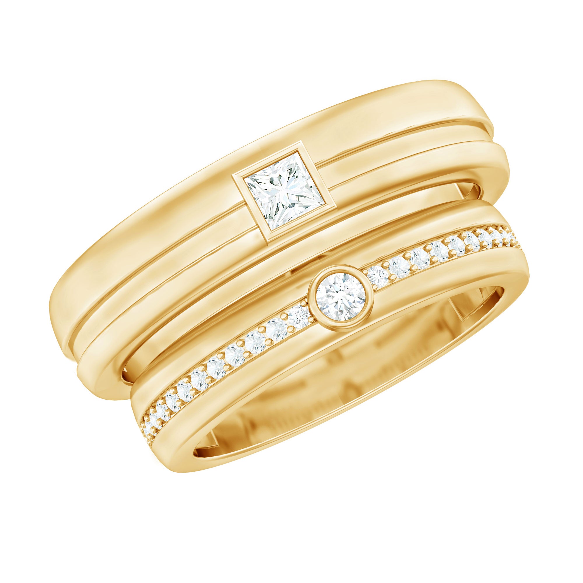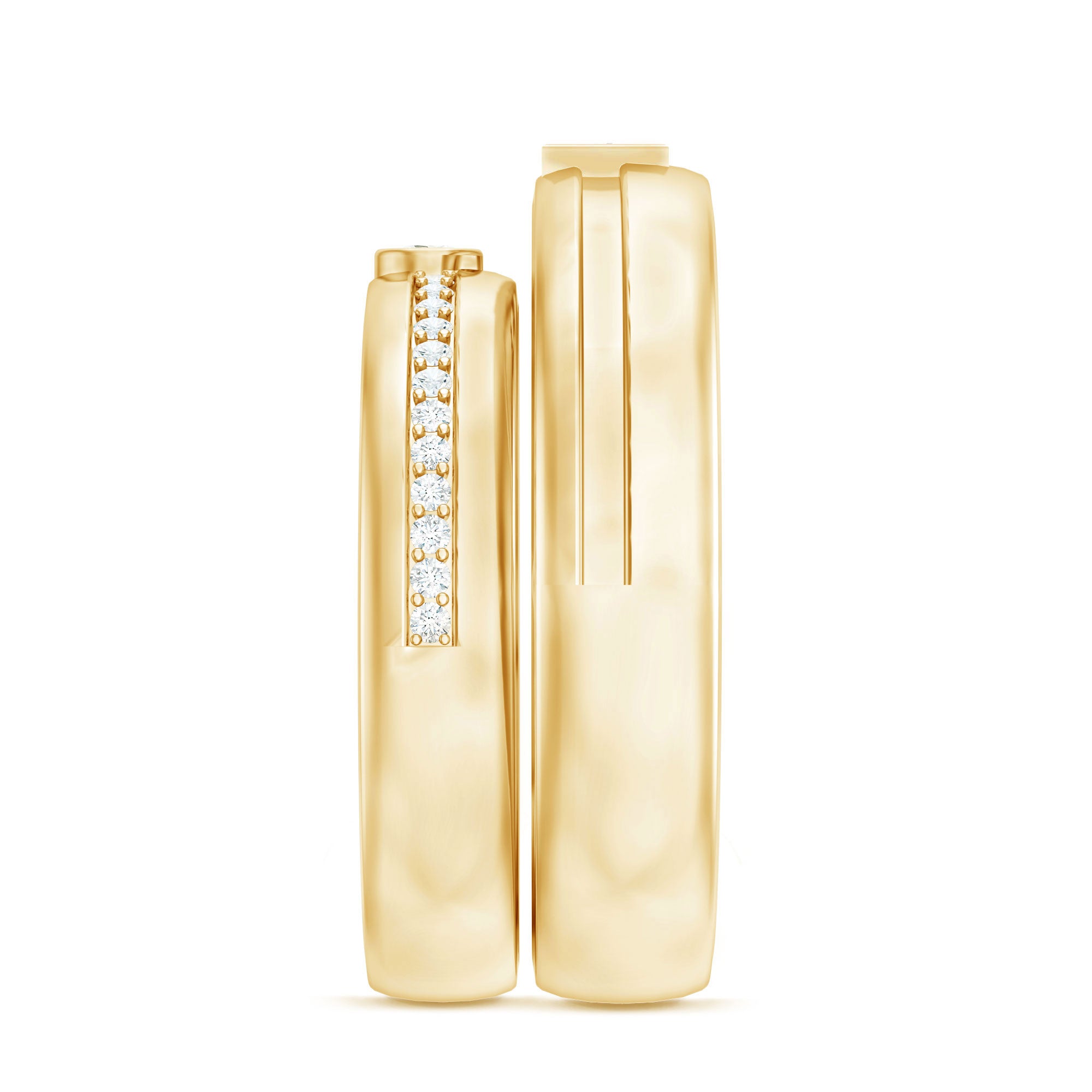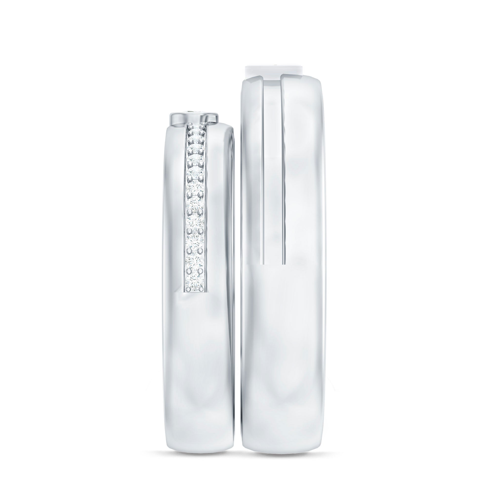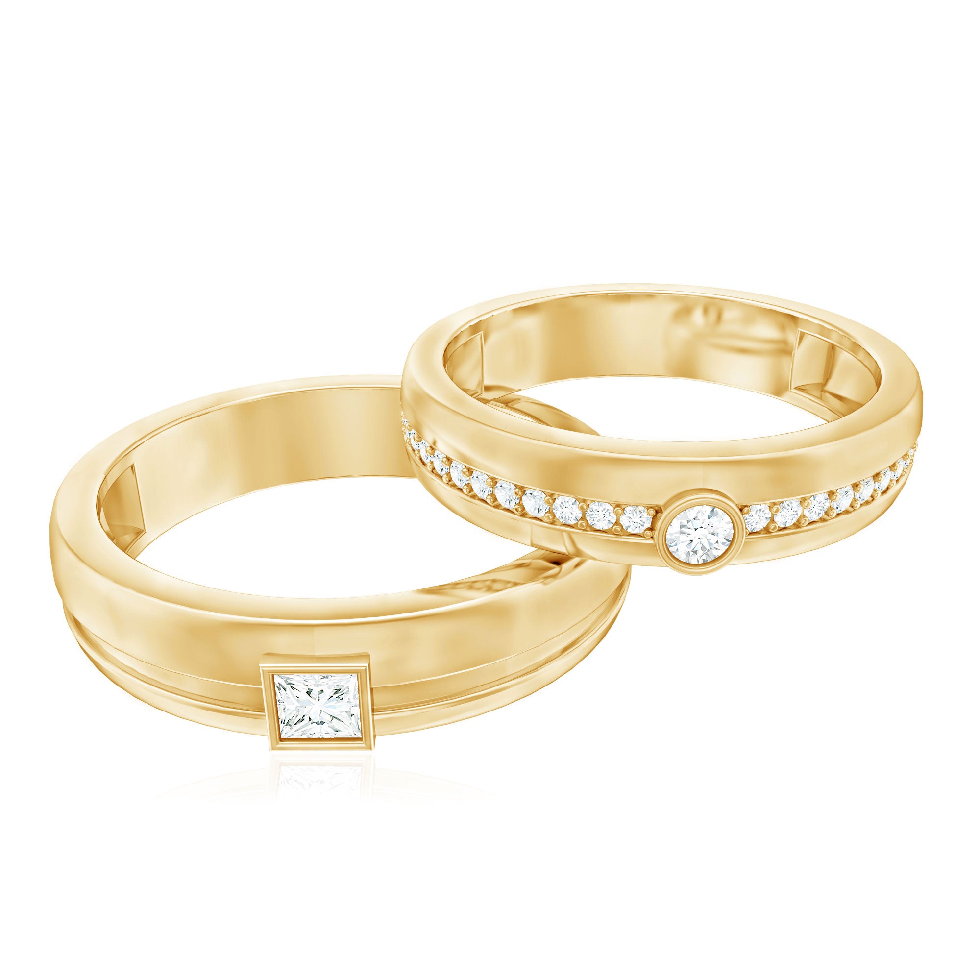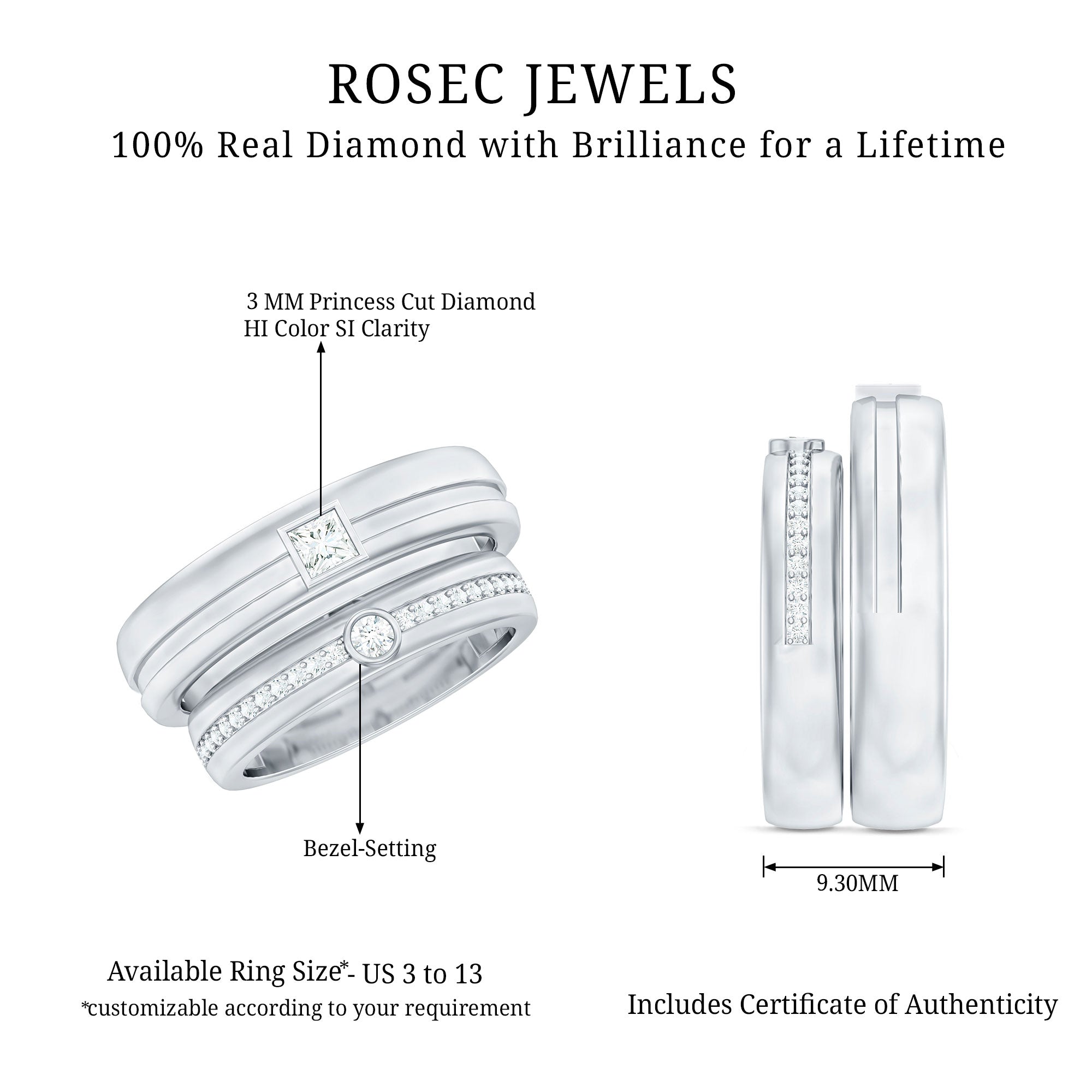 Two rings, one promise, and a moment you will remember forever. This Diamond Wedding Band Set is a beautiful way to celebrate love, commitment, and togetherness. The men’s band keeps things classy and strong with a single princess cut diamond placed neatly in bezel setting. It adds just the right touch of sparkle while still looking bold and timeless. The women’s band brings extra shine with round cut diamonds lined along the band, creating a look that feels elegant and meaningful. Together, the rings complement each other perfectly, just like the couple wearing them. Made with real HI-SI quality diamonds, this His and Her Wedding Band Set is crafted to last through everyday wear and life’s special moments. The bands feel comfortable on the finger and are easy to style with engagement rings or worn on their own. Whether it is for a wedding, anniversary, or Valentine’s Day surprise, this Couple Band Set makes the occasion feel even more special. Both rings arrive neatly packed in a jewelry box and include a certificate of authenticity for added confidence. Thoughtfully made and carefully finished, this Diamond Band Set is a lovely symbol of shared love and commitment.