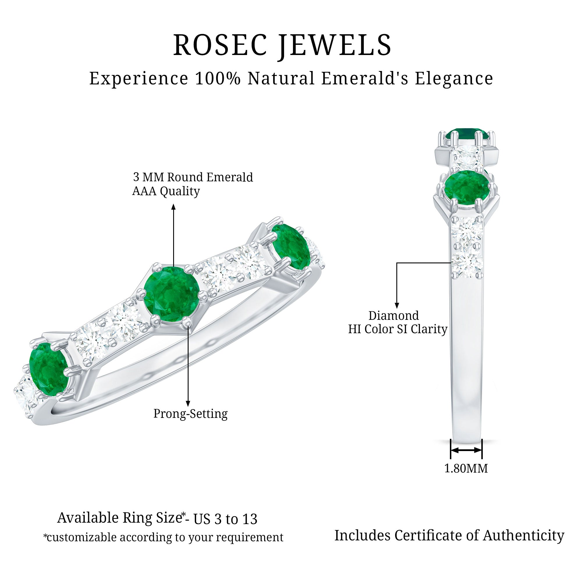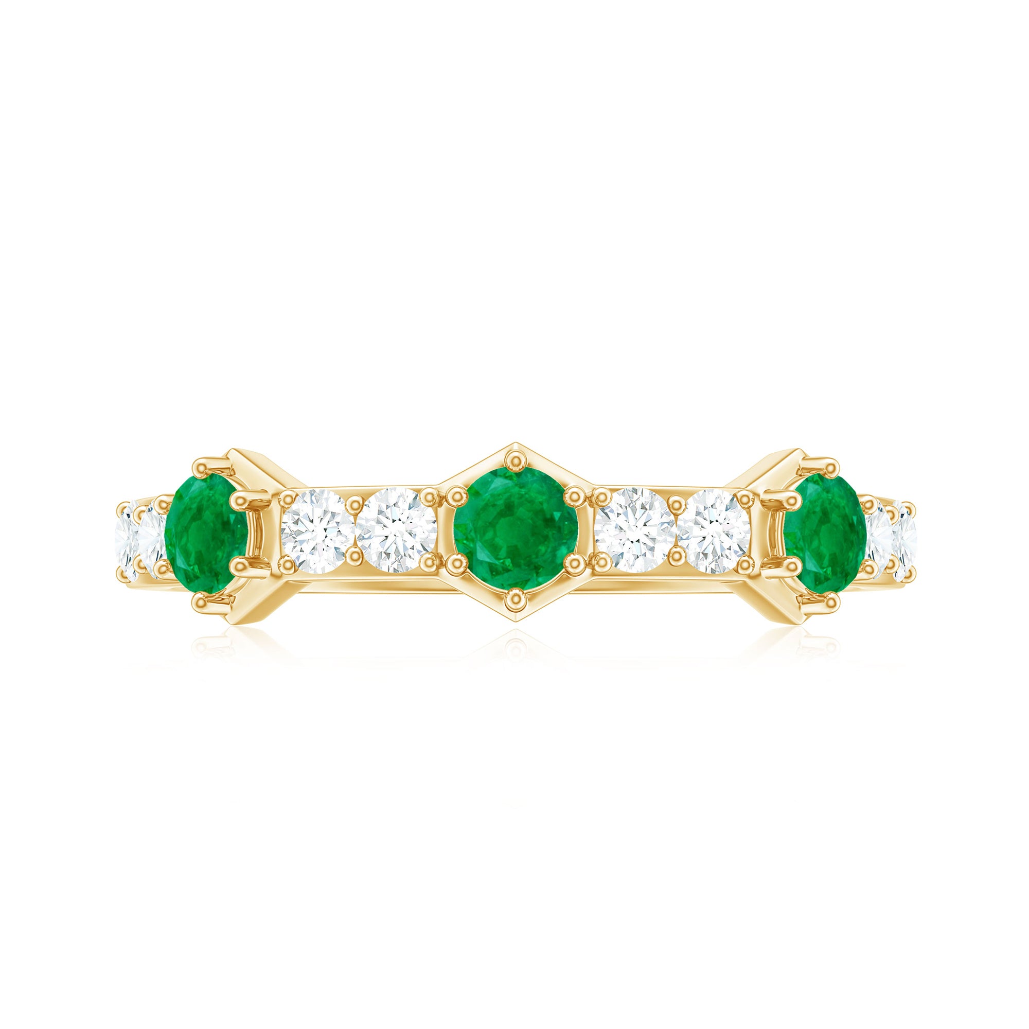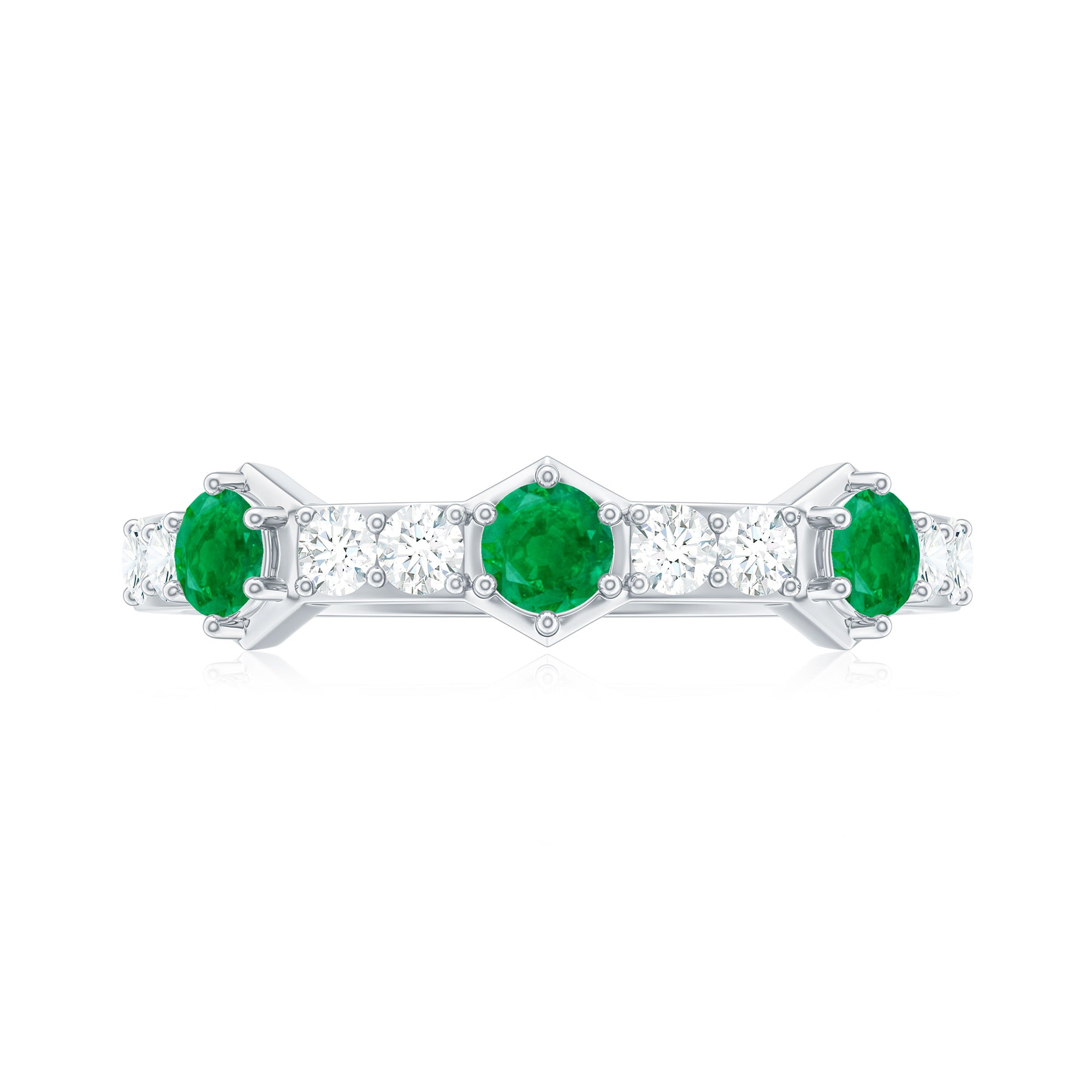 Celebrate the beauty of eternal connection with this Half Eternity Ring, a creation that perfectly blends artistry and emotion. This Fine Ring features a captivating design where lush green Round Shape Emerald and sparkling Diamond stones are placed in an alternating style. The AAA Quality Emerald stones are elegantly set over intricate hexagonal frames, creating a unique geometric allure, while the HI-SI Diamond stones shimmer gracefully along the sleek band, reflecting the brilliance of everlasting love. Every detail of this Emerald Diamond Ring is a testament to fine craftsmanship and heartfelt meaning. Designed to suit every occasion, from daily wear to the most precious milestones of life, this Emerald Eternity Ring embodies elegance with a touch of individuality. Presented in a signature jewelry box and available in a variety of sizes, this Wedding Anniversary Ring is ready to be treasured for a lifetime.