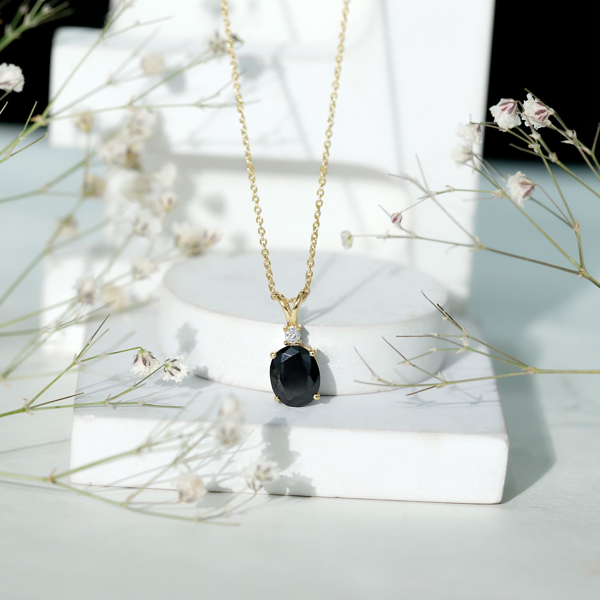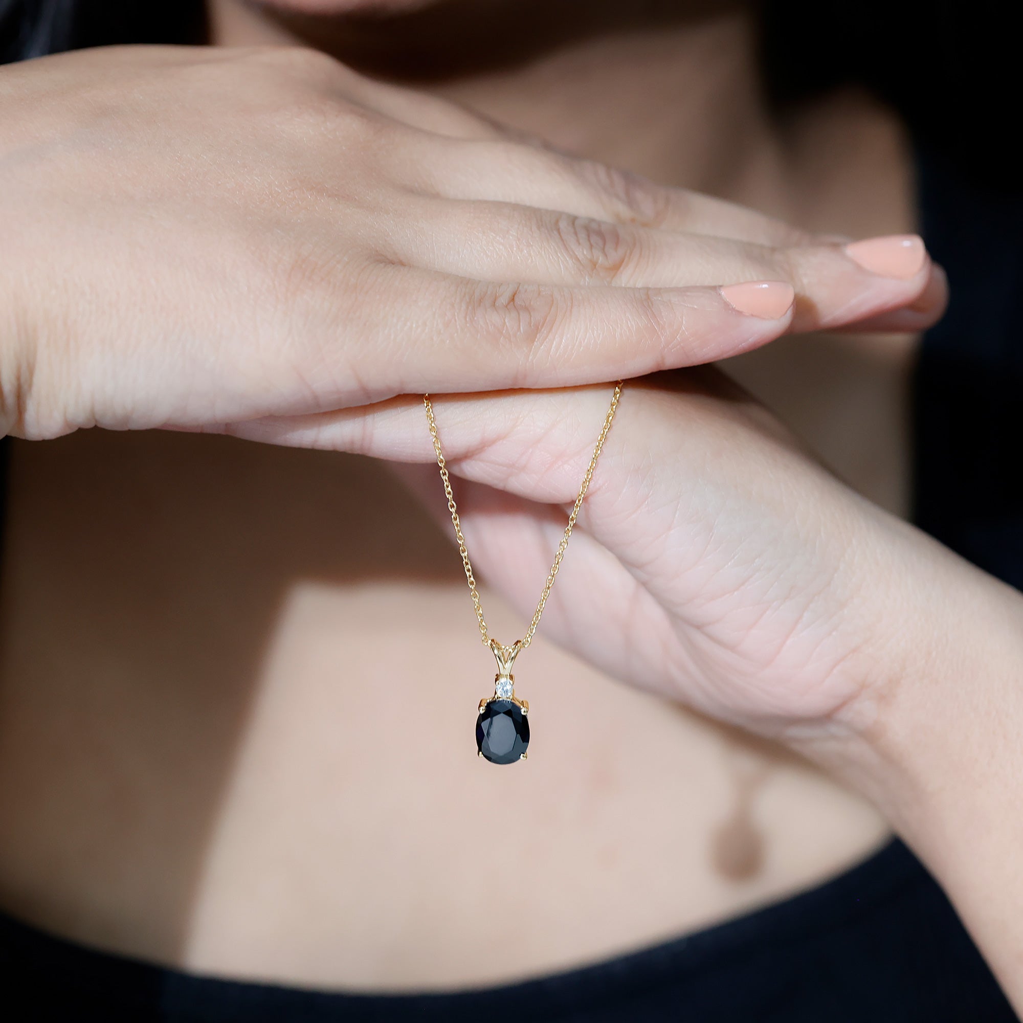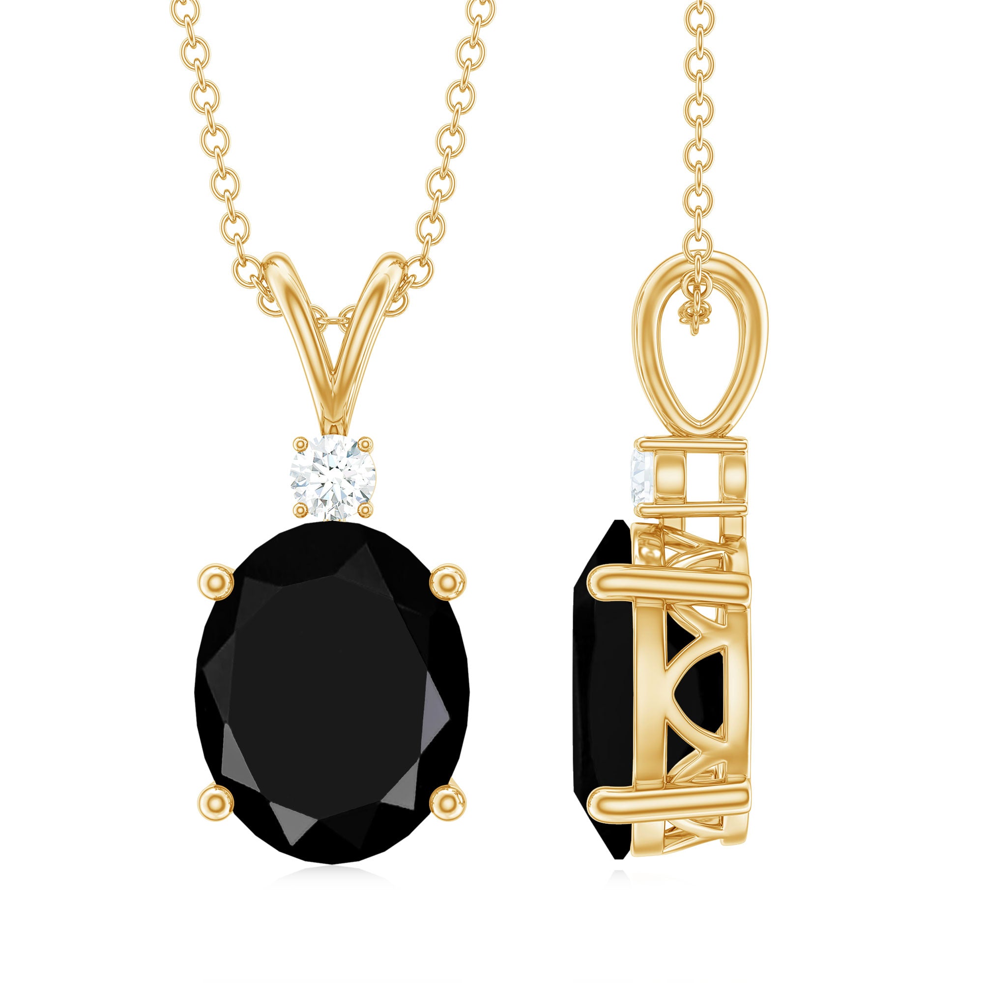 This Solitaire Pendant Necklace is adorned with an Oval Cut Lab Grown Black Diamond secured by Prong Setting while Round Moissanite adds a touch of elegance. The Minimal Pendant crafted with Solid Metal, will add a fun flair to your overall look and will enchant your eyes with its sensational illumination.