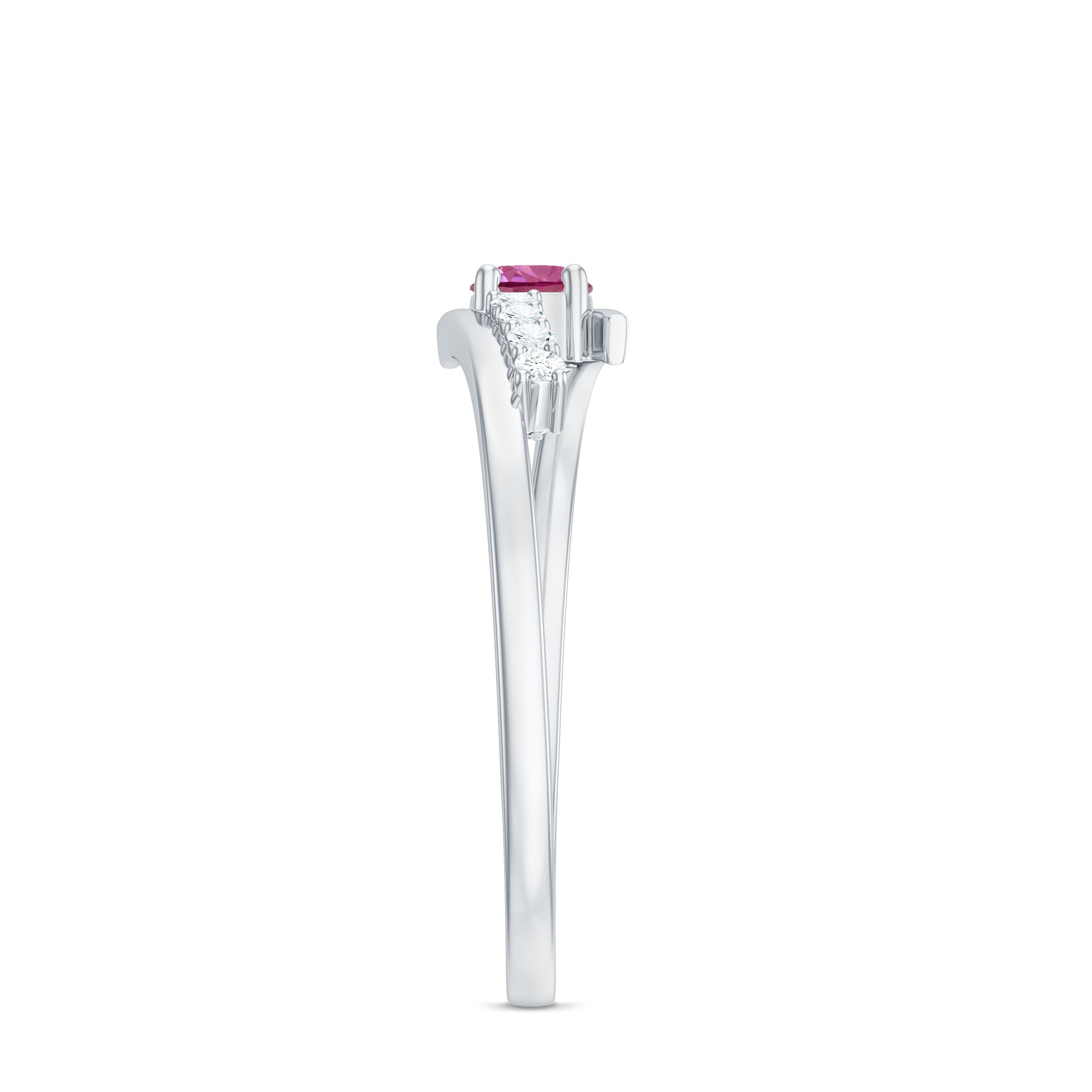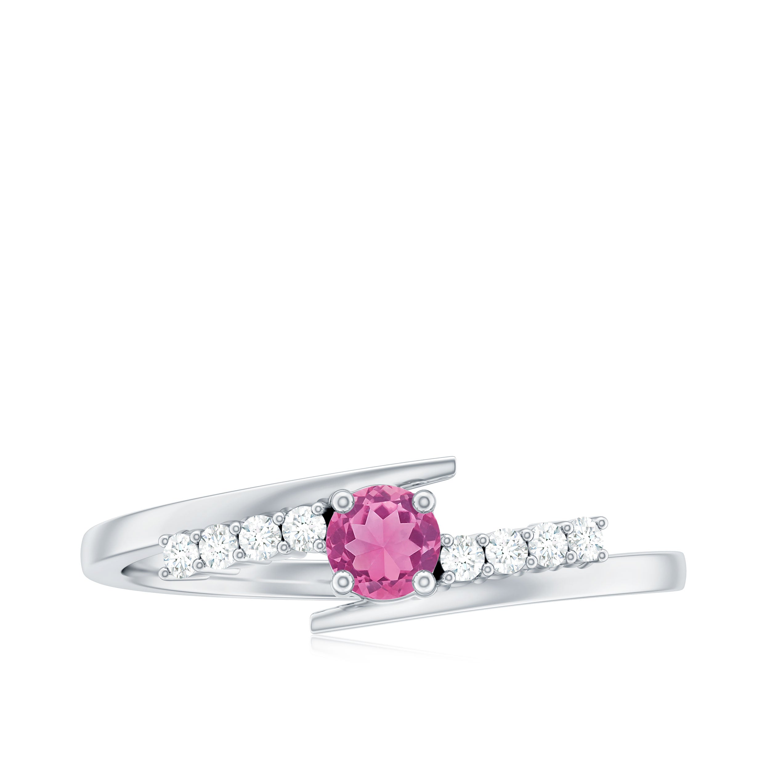The bypass shank gently curves around the center stone, symbolizing two paths coming together. This flowing structure adds visual movement while maintaining a lightweight, understated profile. Diamond accents provide a touch of brilliance that enhances the pink tourmaline without overpowering its natural color.