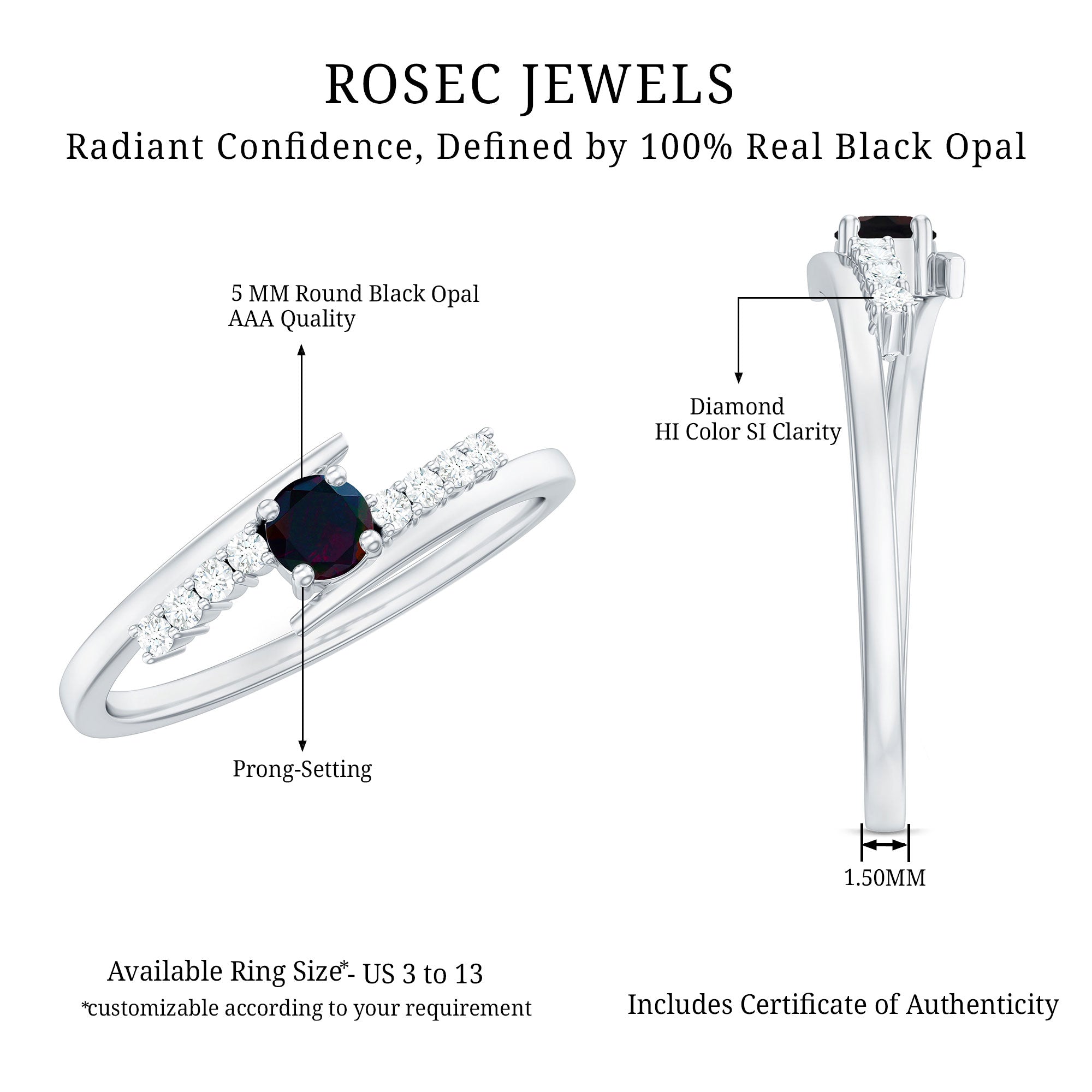 Elevate the glamour of your look with this beautiful Minimal Bypass Ring, featuring a Round Shape Black Opal gemstone set as a center stone in a Prong Setting. The promise ring is further adorned with Diamond accents on the Bypass Shank. This Minimal Black Opal Ring is the perfect addition to any outfit. Make a lasting impression with this stunning piece.