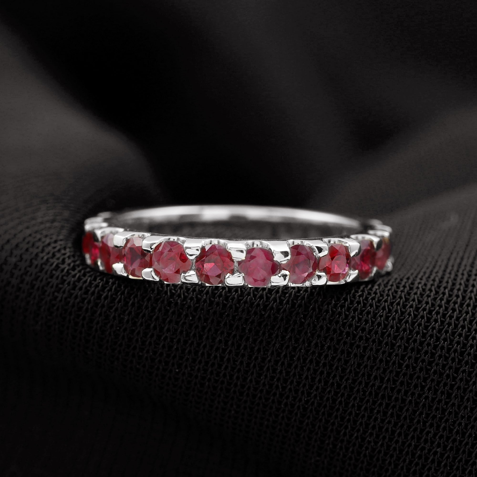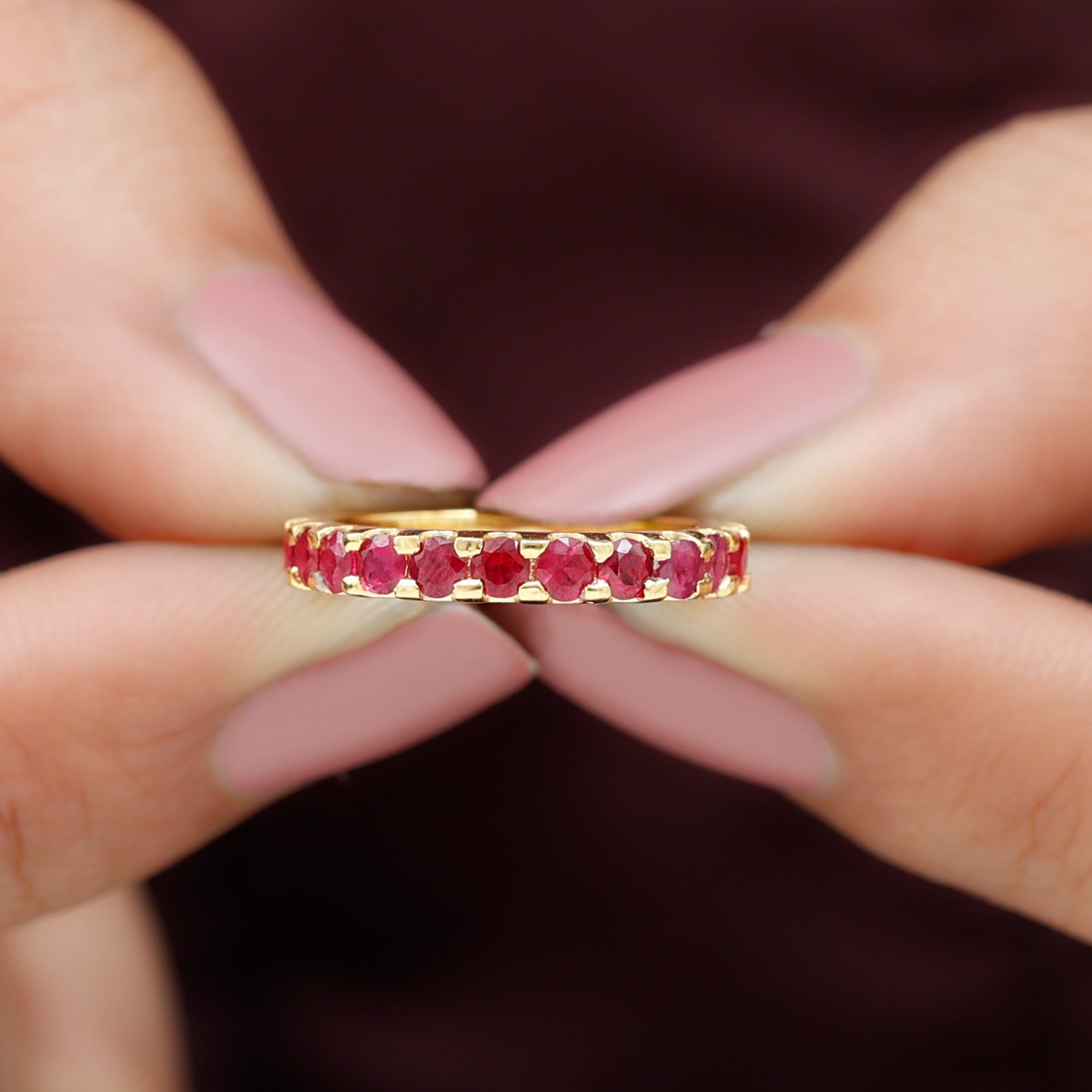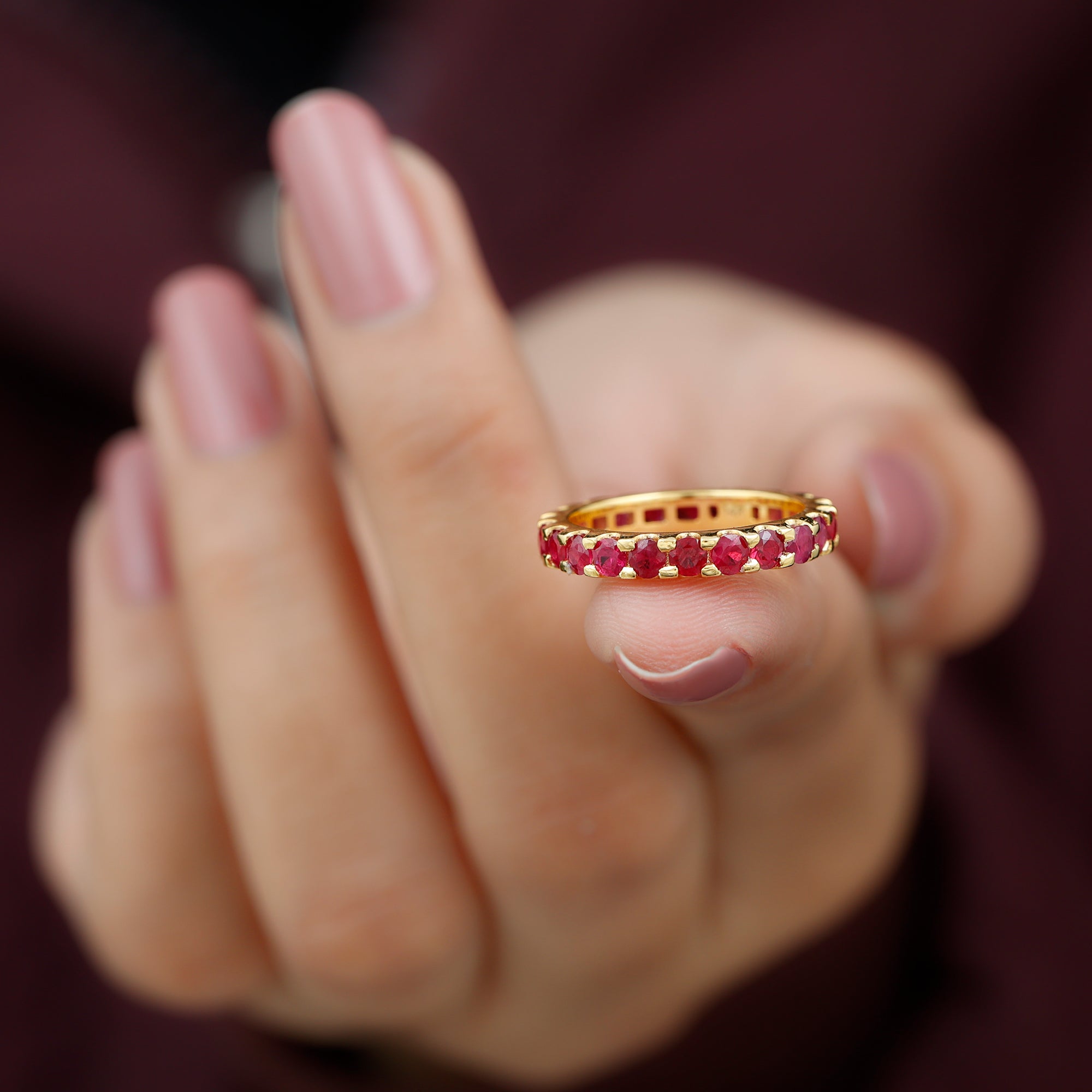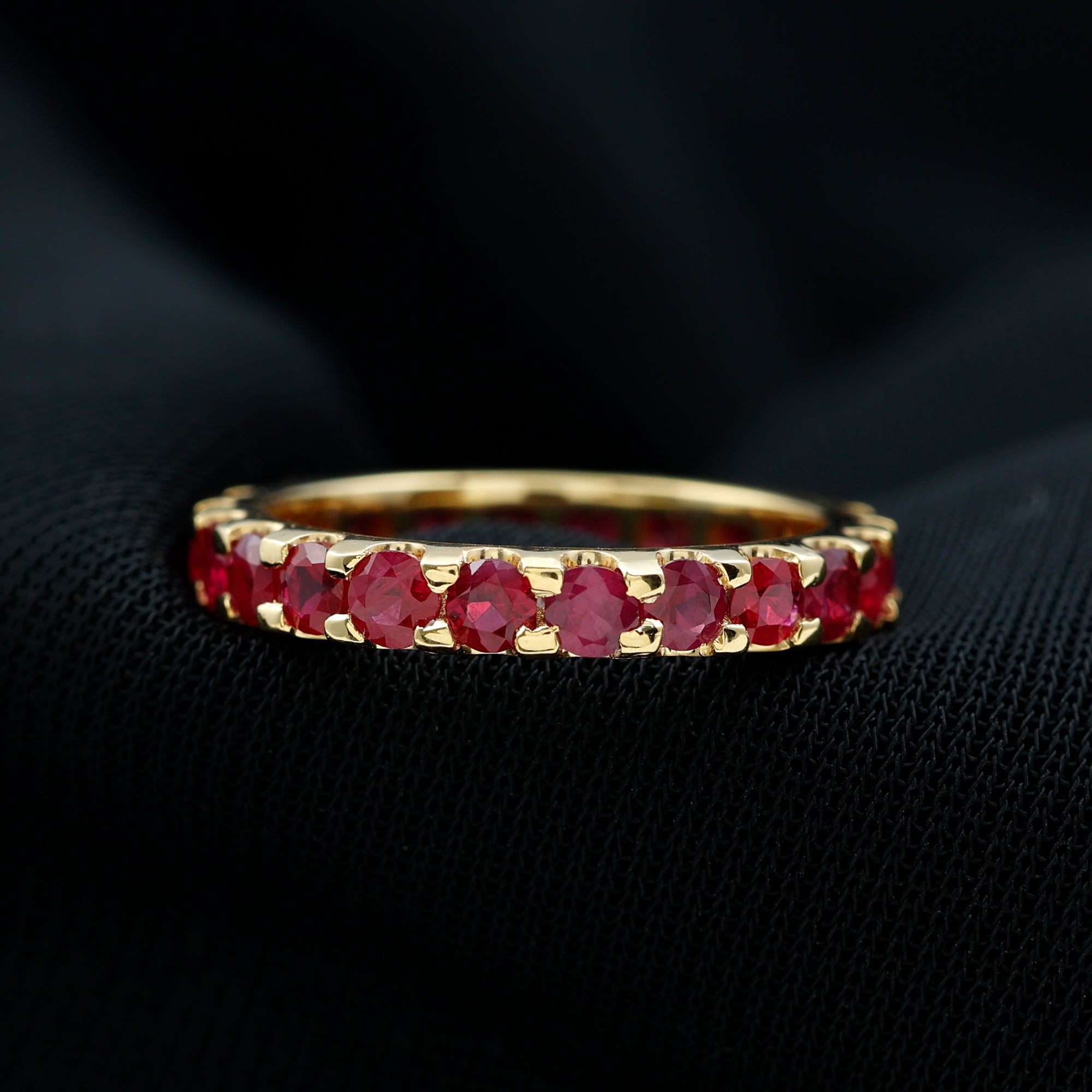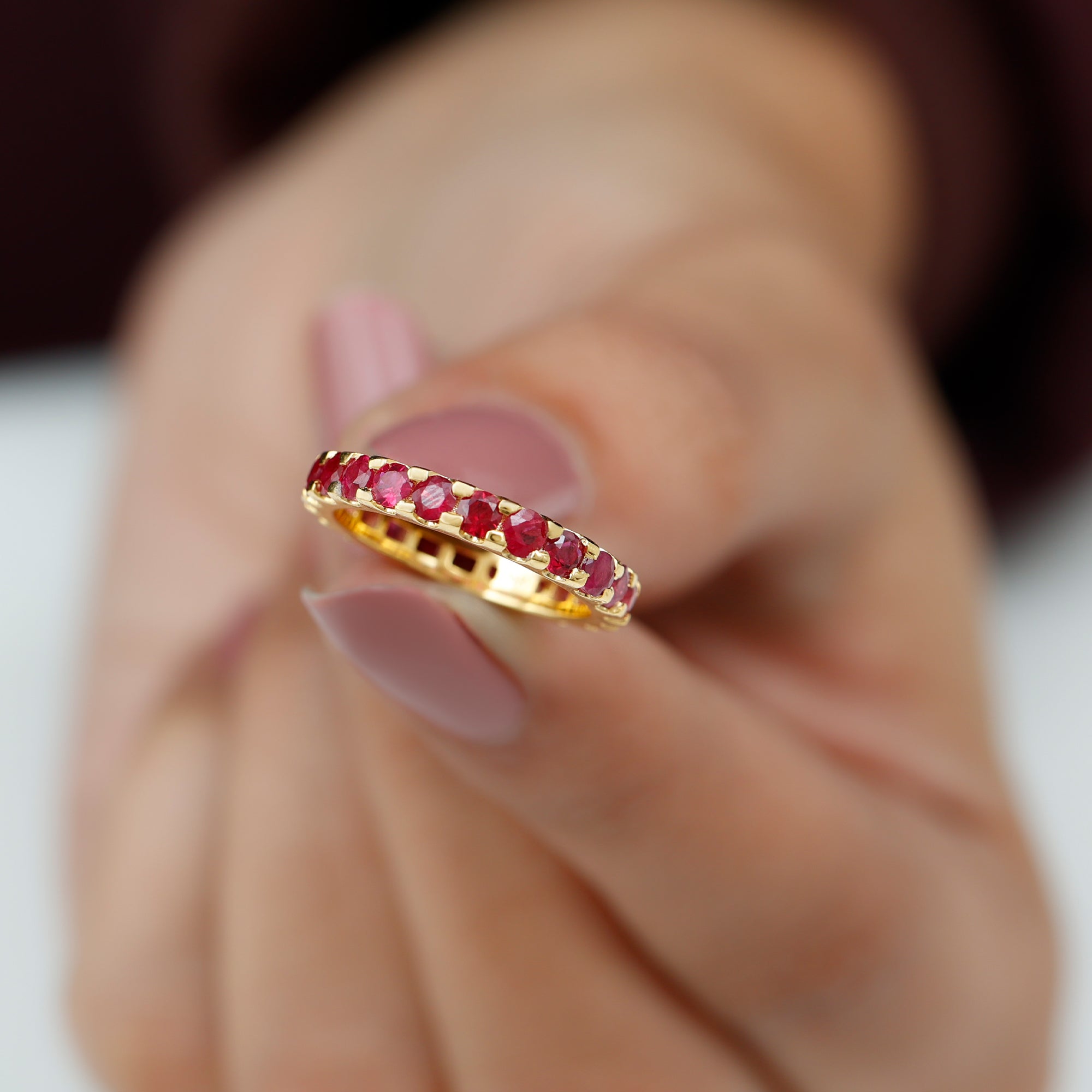 Celebrate your bond of eternal love with this Eternity Band Ring adorned with round shape Ruby. This Stackable Ring makes for a trendy choice for marking the special day of your life.