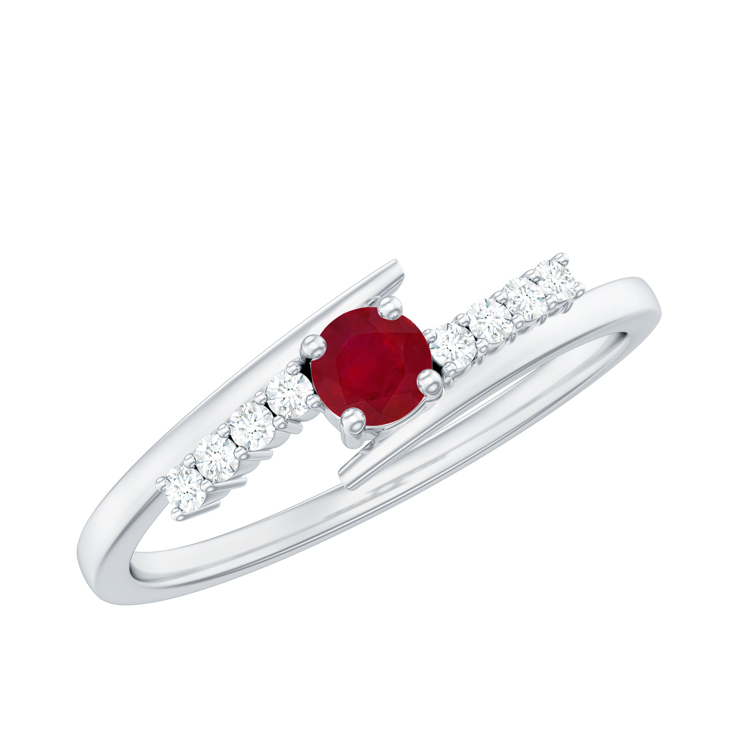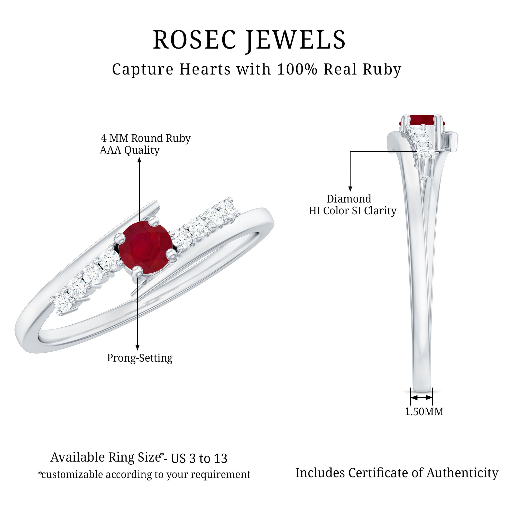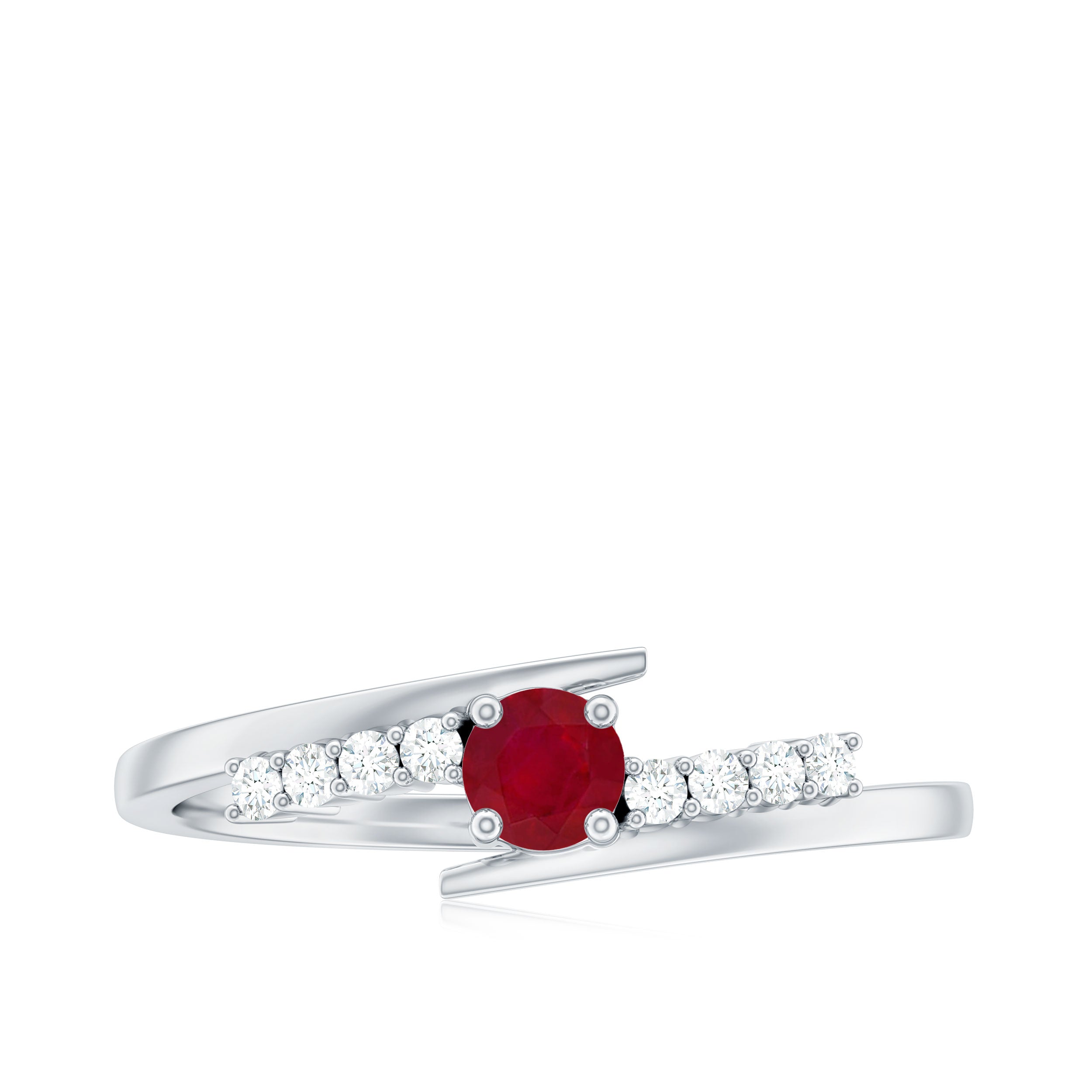 Redefining romantic, this Ruby Promise Ring is something your fashion savvy lady would fall head over heels for! The main highlight of its beauty, 4 MM Round Shape Ruby lends it a red pop of romance, only to be accentuated by side-stones of Round Shape Diamond. Both the stones rest on the Bypass Shank, which sets it apart. Certified for its top notch quality, this Certified Ruby Bypass Ring is minimal enough to fit with all sorts of ensembles.