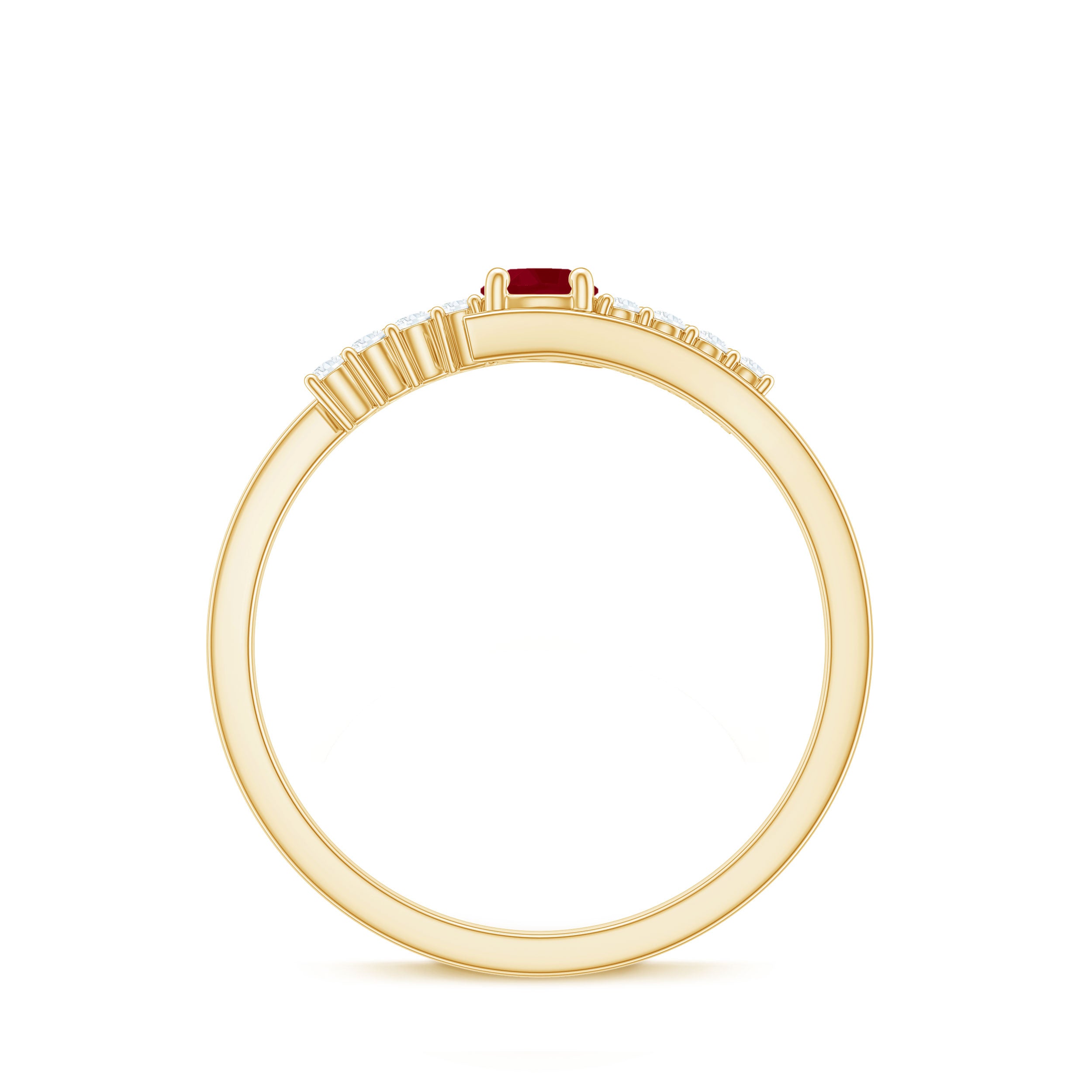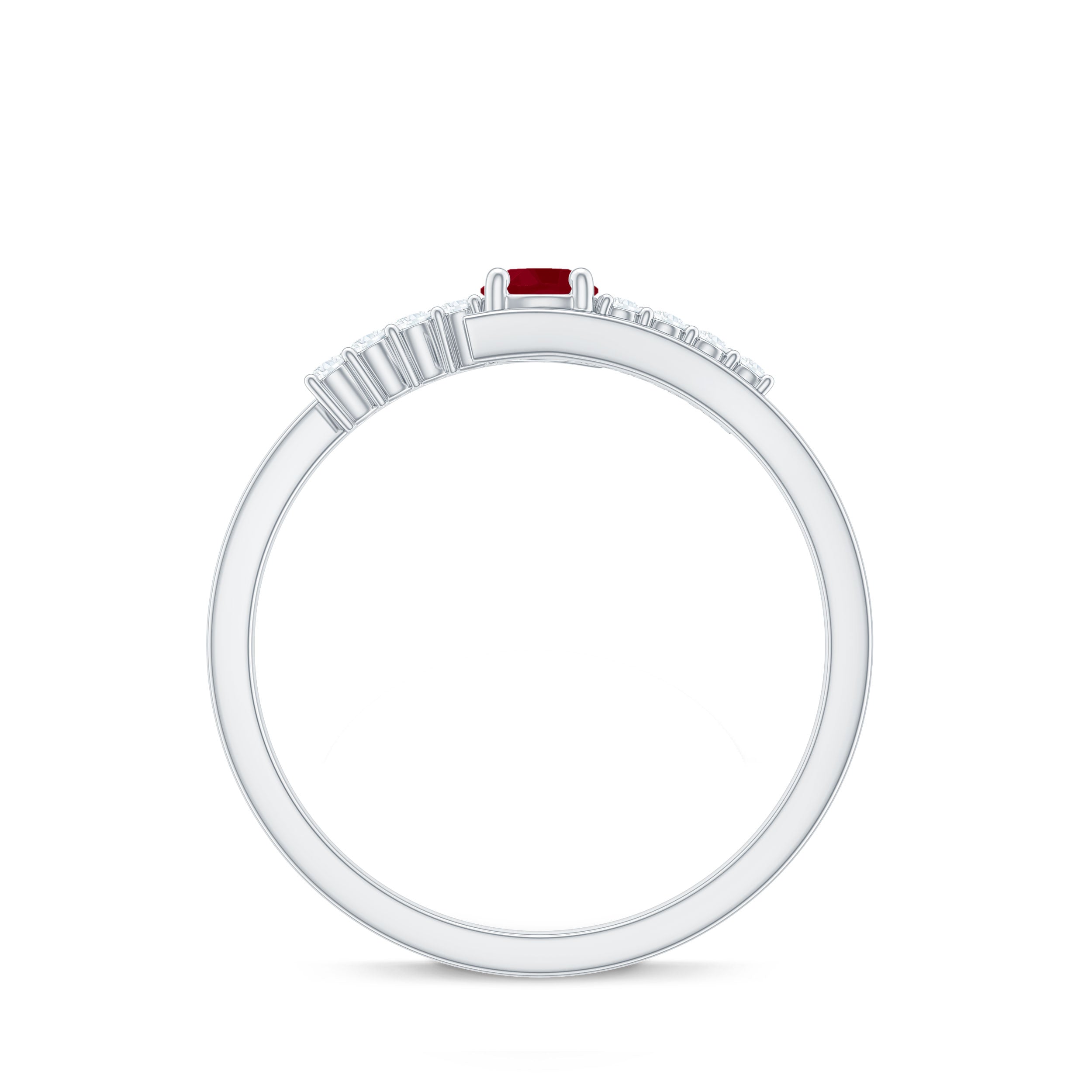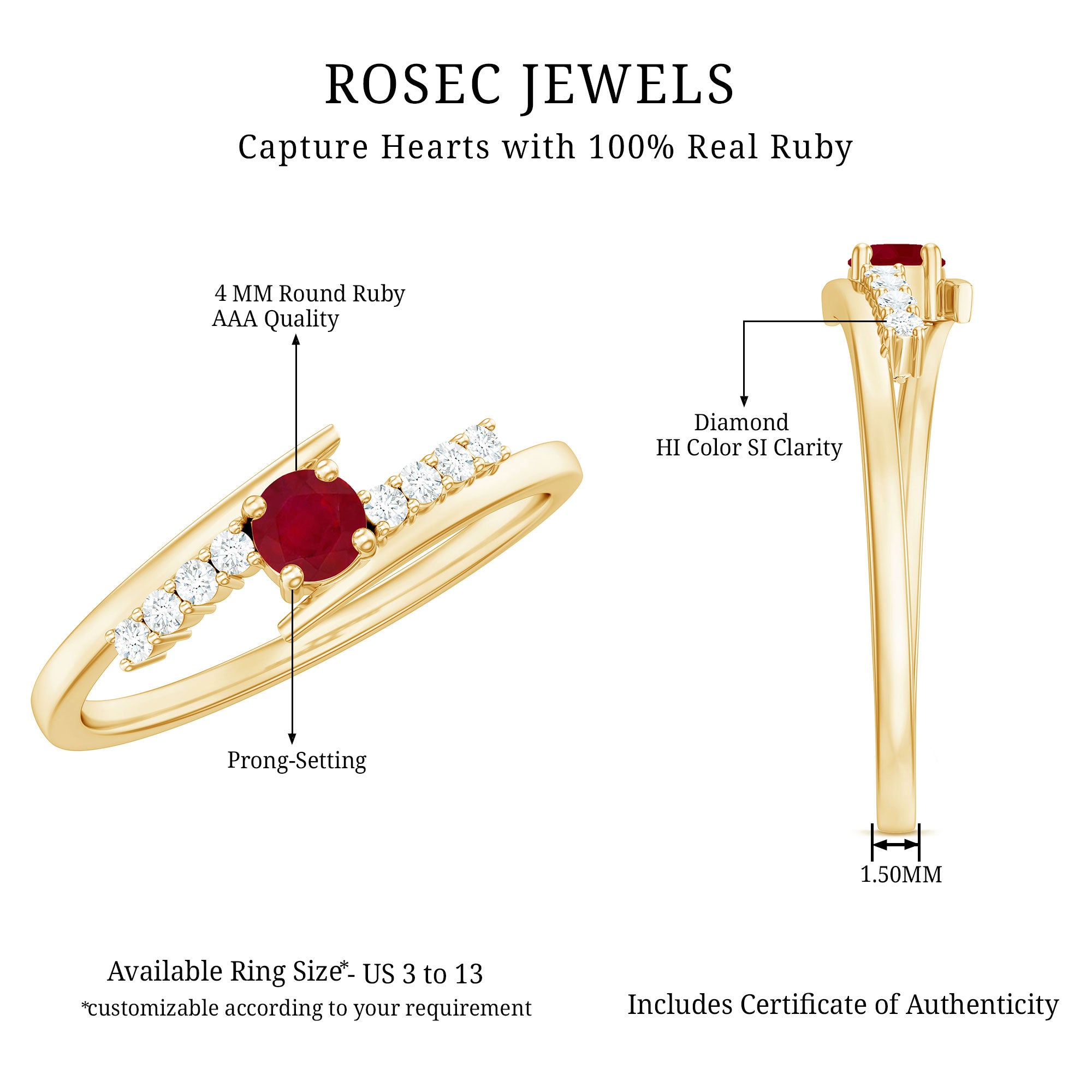 Redefining romantic, this Ruby Promise Ring is something your fashion savvy lady would fall head over heels for! The main highlight of its beauty, 4 MM Round Shape Ruby lends it a red pop of romance, only to be accentuated by side-stones of Round Shape Diamond. Both the stones rest on the Bypass Shank, which sets it apart. Certified for its top notch quality, this Certified Ruby Bypass Ring is minimal enough to fit with all sorts of ensembles.