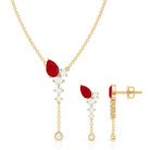 Looking for the perfect minimal jewelry set to elevate your special occasion look? Look no further than this stunning Ruby Jewelry Set. Featuring a combination of Pear cut Ruby and Round Shape Diamond stones, this Y Necklace and Earrings Set is sure to turn heads. The minimalist design of this Dangle Jewelry Set adds a touch of sophistication to any outfit. With a total weight of 2 Carat and AAA quality certification, you can trust that all of the gemstones in this set have undergone rigorous quality checks to ensure their beauty and durability.