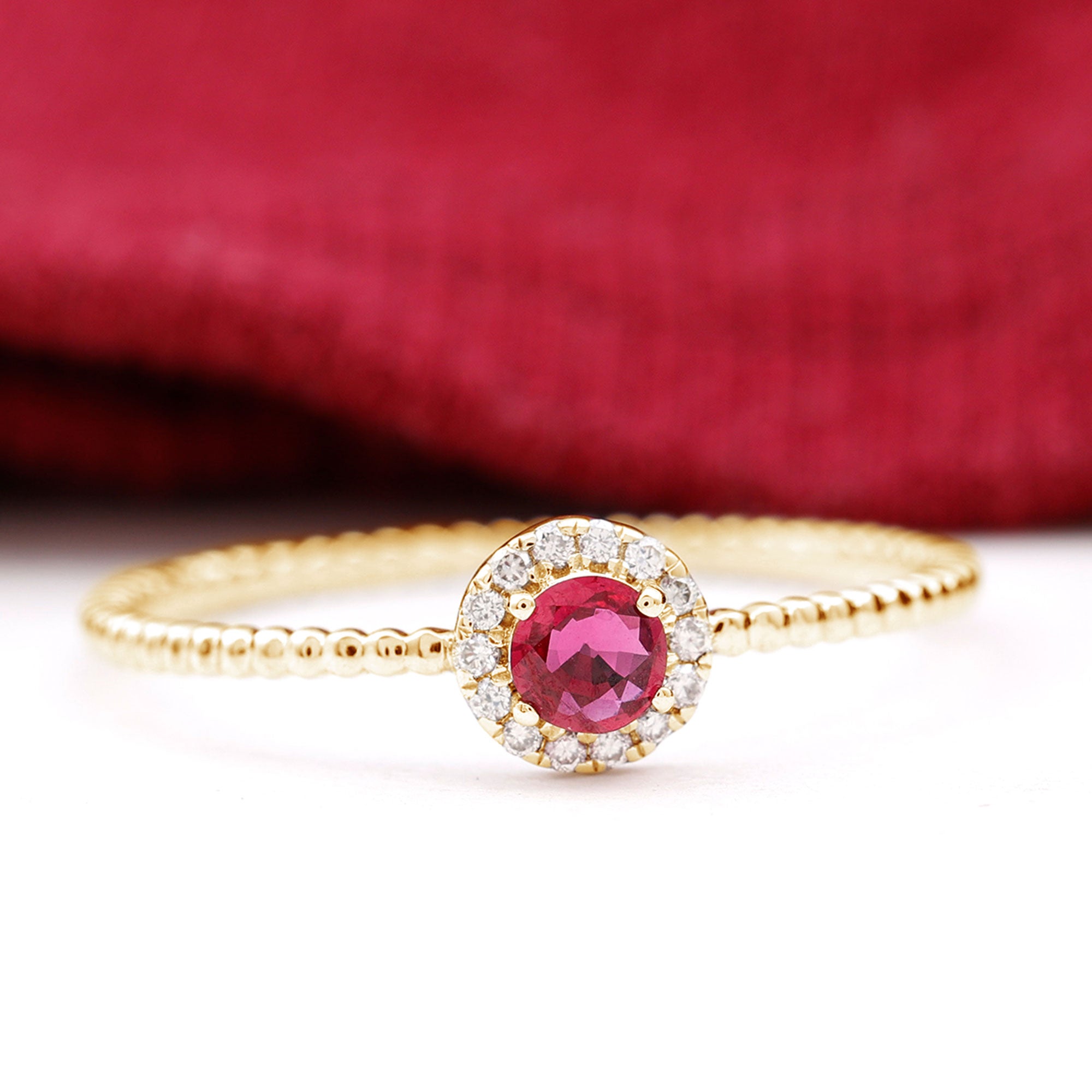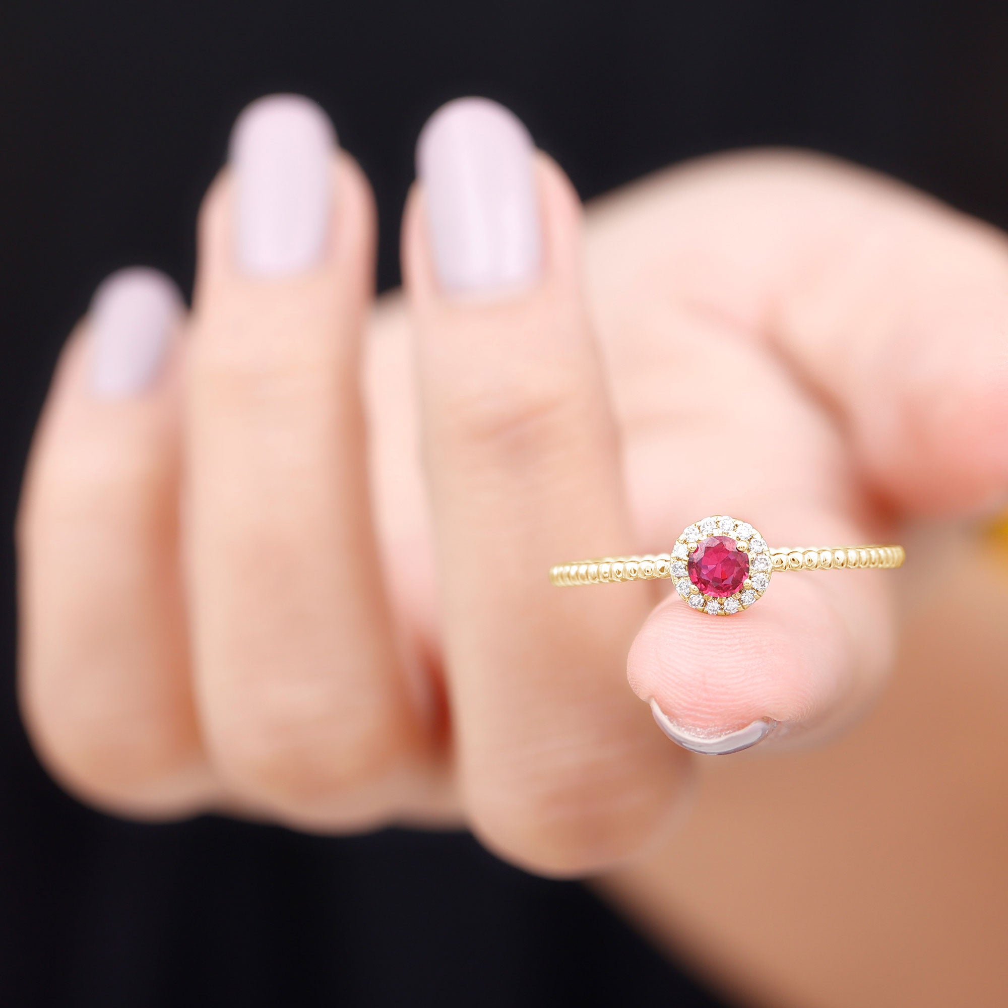 Elevate your promise with this lovely Ruby Promise Ring, where vibrant emotions meet timeless elegance. A Round Shape Ruby set in Prong Setting over the Bubble Shank takes center stage, encircled by a shimmery diamond halo. This Natural Ruby Ring is a testament to the promise of everlasting love, its design symbolizing the journey of two hearts intertwined.