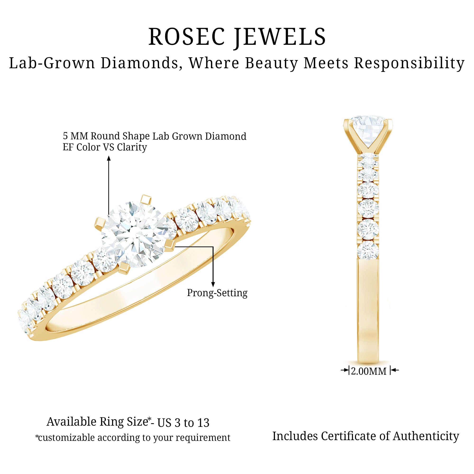 A masterpiece of timeless beauty, this Minimal Engagement Ring features a 5 MM Round Shape Lab Grown Diamond gemstone set in Peg Head Setting as a solitaire, flanked by shimmering Side Stones. Its the perfect choice for those seeking an engagement ring that marries tradition with contemporary elegance, creating a love story that shines brilliantly.
