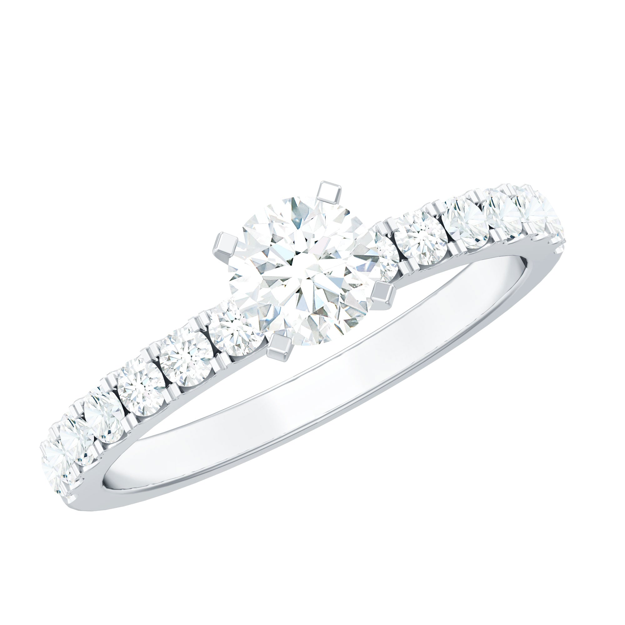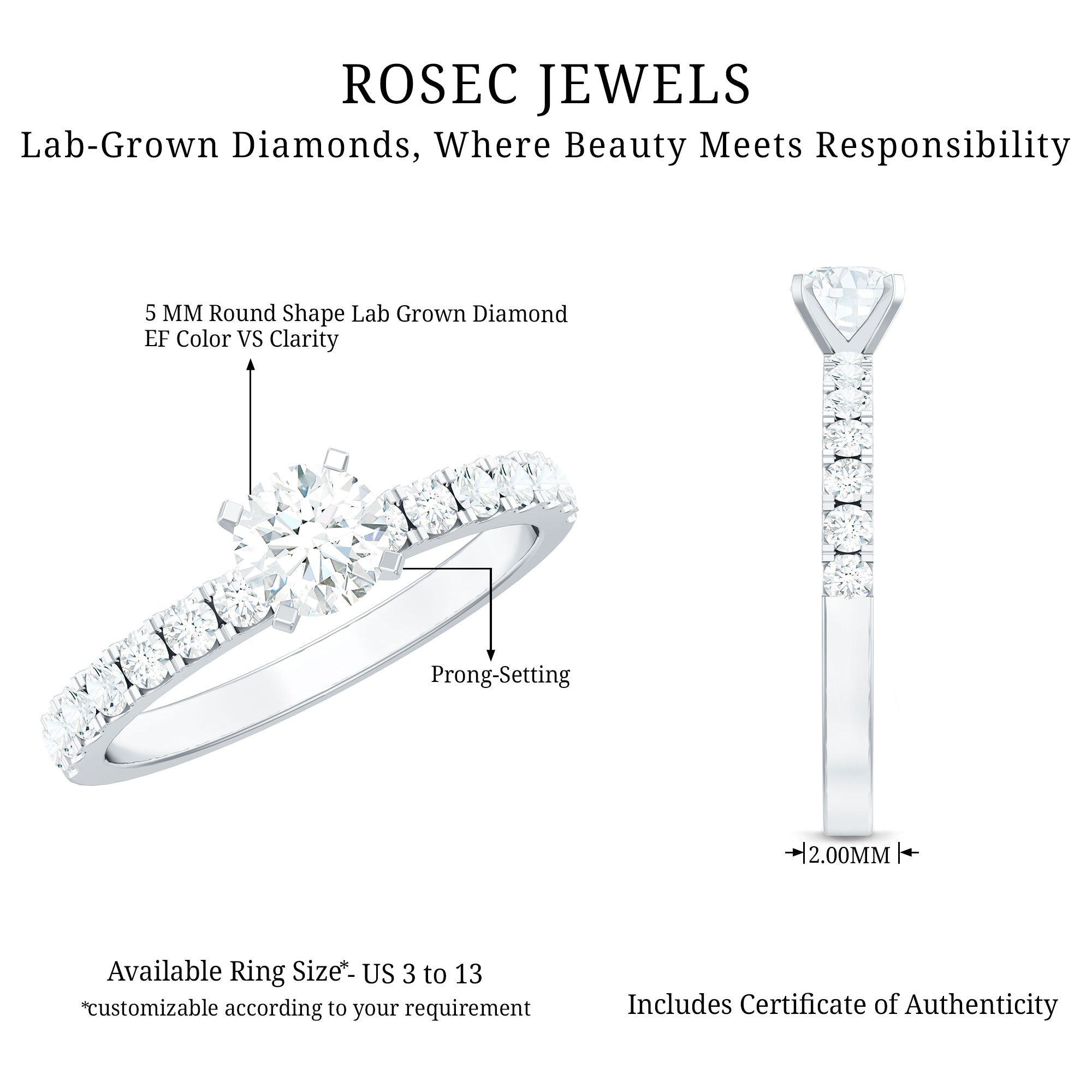 A masterpiece of timeless beauty, this Minimal Engagement Ring features a 5 MM Round Shape Lab Grown Diamond gemstone set in Peg Head Setting as a solitaire, flanked by shimmering Side Stones. Its the perfect choice for those seeking an engagement ring that marries tradition with contemporary elegance, creating a love story that shines brilliantly.