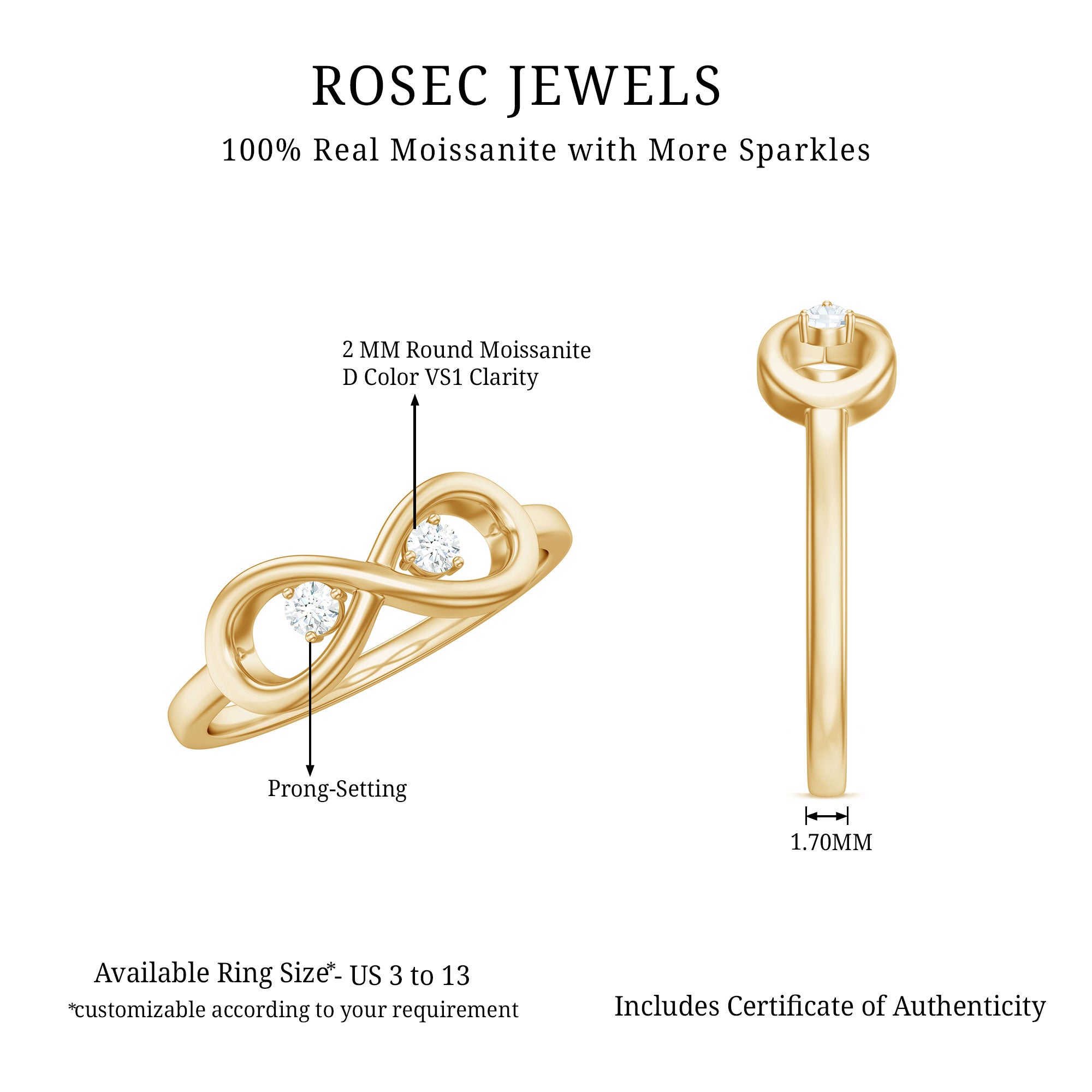 Some bonds are meant to be together, and this Infinity Promise Ring is made to reflect just that. With two sparkling round cut moissanite stones nestled in a graceful infinity design, this Commitment Ring quietly says forever. Each stone represents two hearts, two souls, or two people who have found something truly special, a love, a friendship, or a connection that lasts. The smooth, flowing infinity shape wraps gently around the finger, giving the Infinity Knot Ring a soft, modern look that is easy to wear every day. It is simple, but full of meaning. Whether you are giving it to someone you love or keeping it as a little reminder of your own journey, this Moissanite Infinity Ring is all about staying connected. The sparkle is subtle, the meaning is deep, and the design feels just right, this Womens Infinity Ring will never go unnoticed. Whether you are marking a new beginning or honoring a bond that has stood the test of time, this Moissanite Promise Ring for Her makes it feel extra special. It is available in multiple ring sizes, metal colors, and metal types, and comes beautifully packaged in a jewelry box along with a certificate of gemstone authenticity.