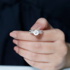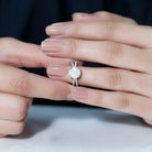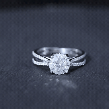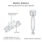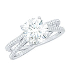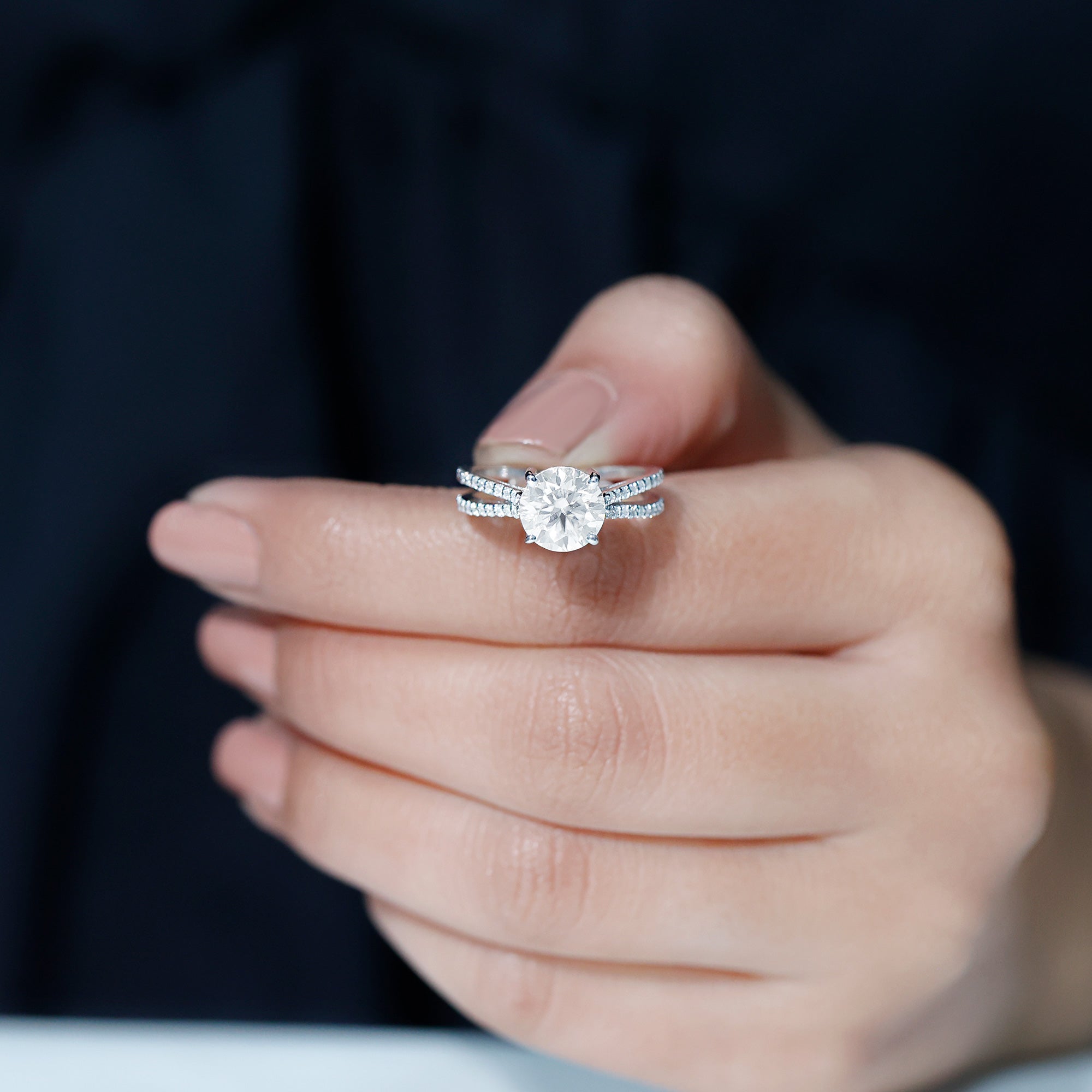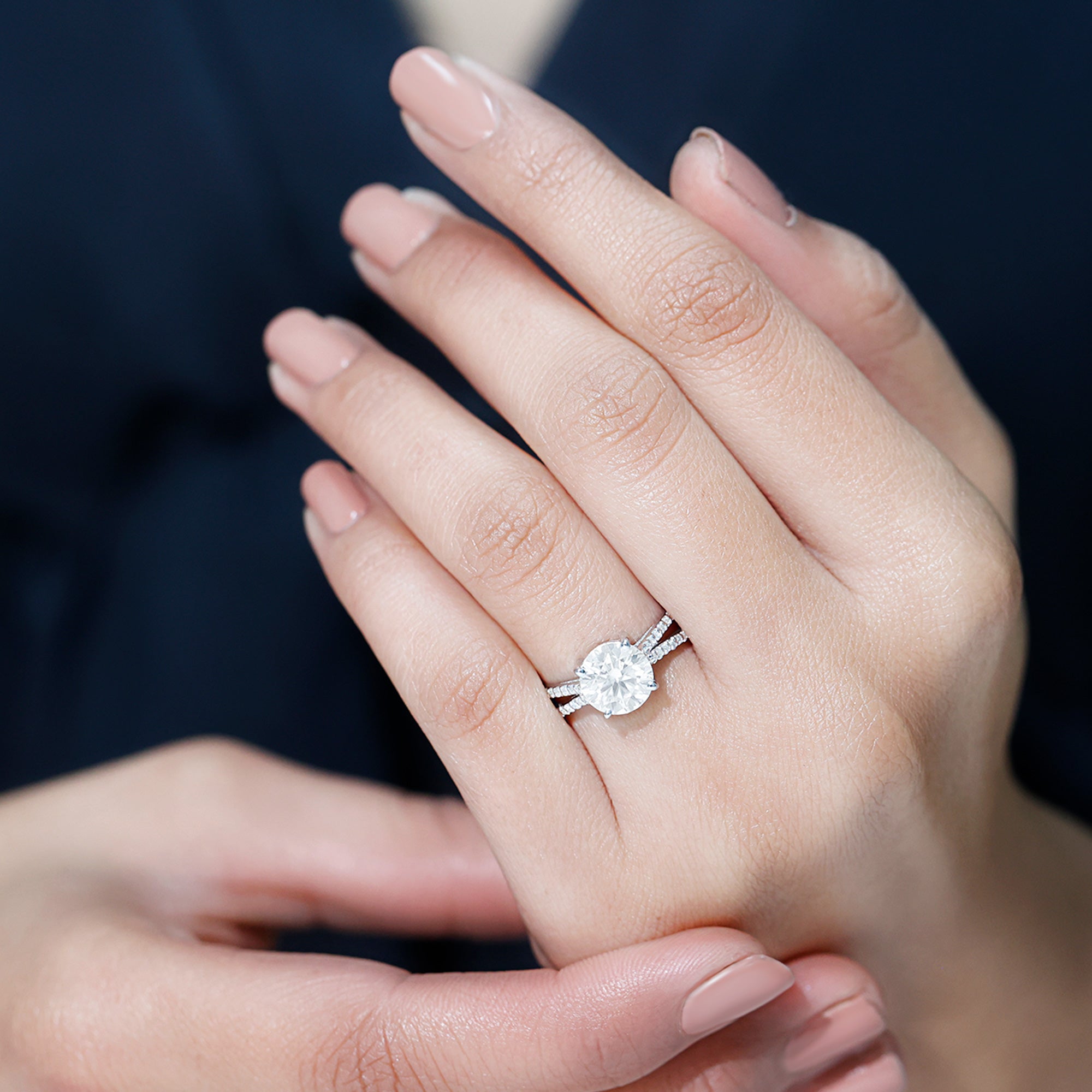 This Moissanite Engagement Ring is crafted precisely with 14K White Gold Plated Silver. The ring features an 8 MM Round Shape Moissanite placed at the center of a Split Shank adorned with smaller Moissanite stones. This Split Shank Engagement Ring beholds the adorable shine of D-VS1 Quality Moissanite securely placed in 4 Prong Setting. This Classic Engagement Ring will adorn the finger like you make her feel loved. Present this ring to your lady love and make the moment memorable forever.