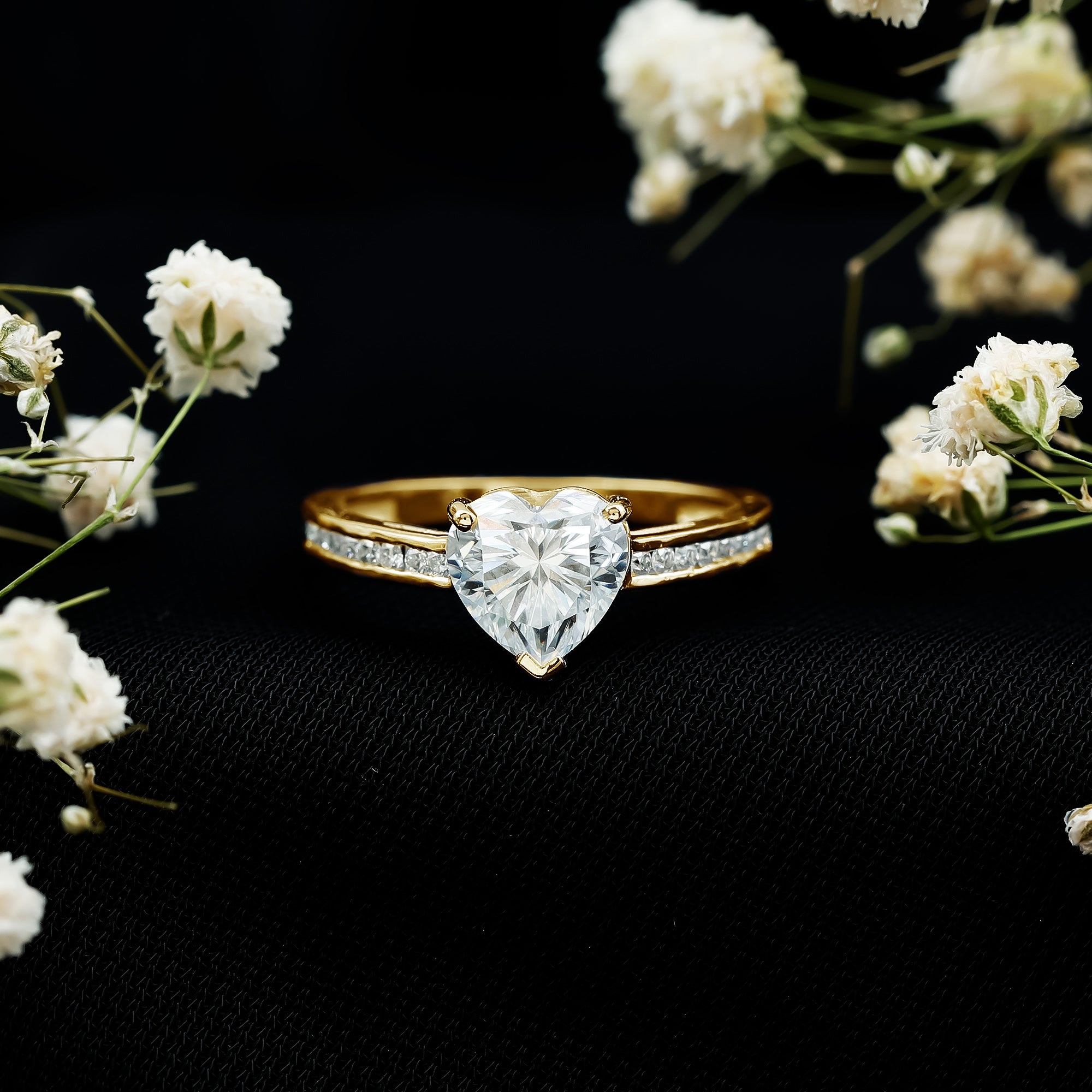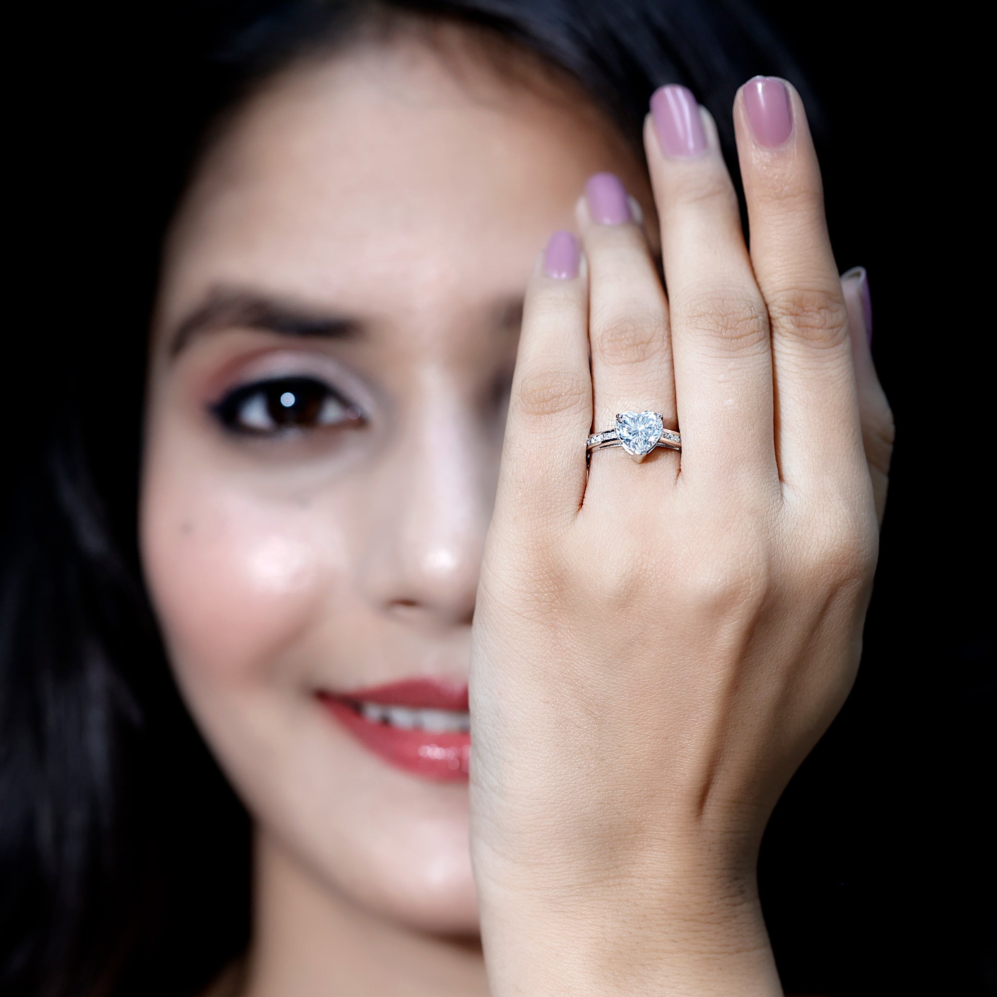 Capture her heart forever with this exquisite Moissanite Heart Ring, a breathtaking symbol of your everlasting love. The dazzling 8 MM Heart Shaped Moissanite in Prong Setting is flanked by delicate Round Shape Moissanite side stones that amplify its brilliance and elegance. This Heart Engagement Ring is more than a symbol of love and the shine of D-VS1 Moissanite is the symbol of your unique bond and shared journey. This 2 Ct Moissanite Engagement Ring promises a lifetime of sparkle and admiration. Celebrate your love story with a heart ring depicting immense love for your special one.