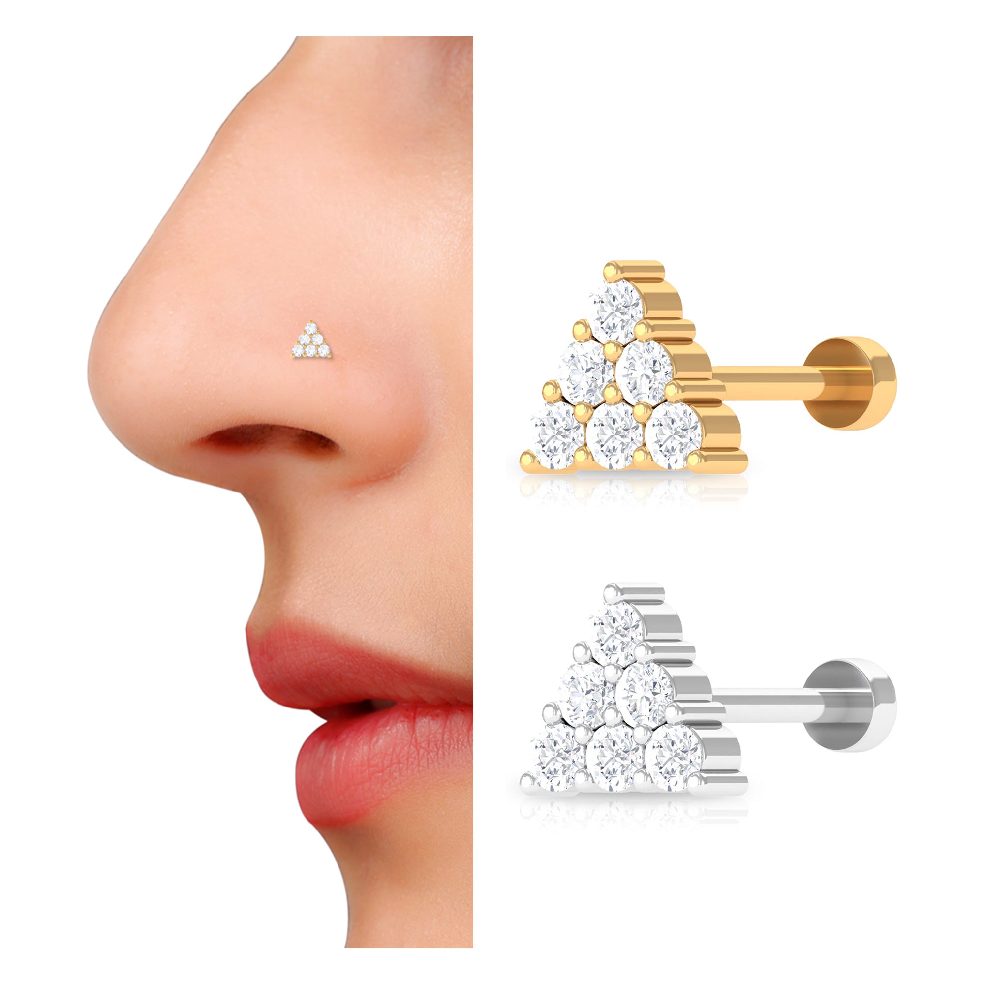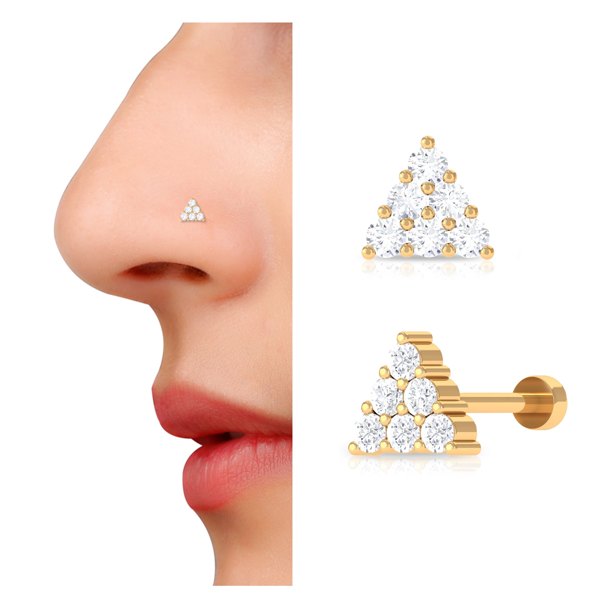 Elevate your look with this exquisite Triangle Nose Pin adorned with small Round Shape Moissanites arranged in a charming triangle pattern. Meticulously crafted from high-quality Solid Gold Metal, it is available in Yellow, White, and Rose Gold finishes. The simple yet secure Flat Back Closure ensures it stays in place all day long. Its unique design adds a touch of charm to your overall look, making it the perfect accessory to complement any outfit. Surprise your loved one with this Gold Nose Pin as a thoughtful and memorable graduation gift that she will treasure forever.