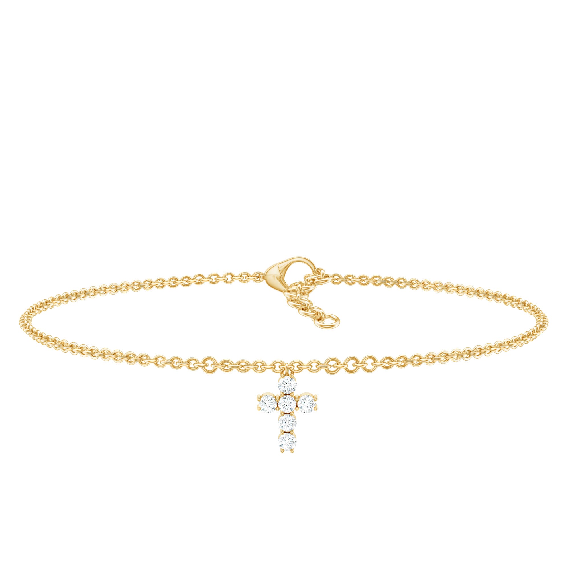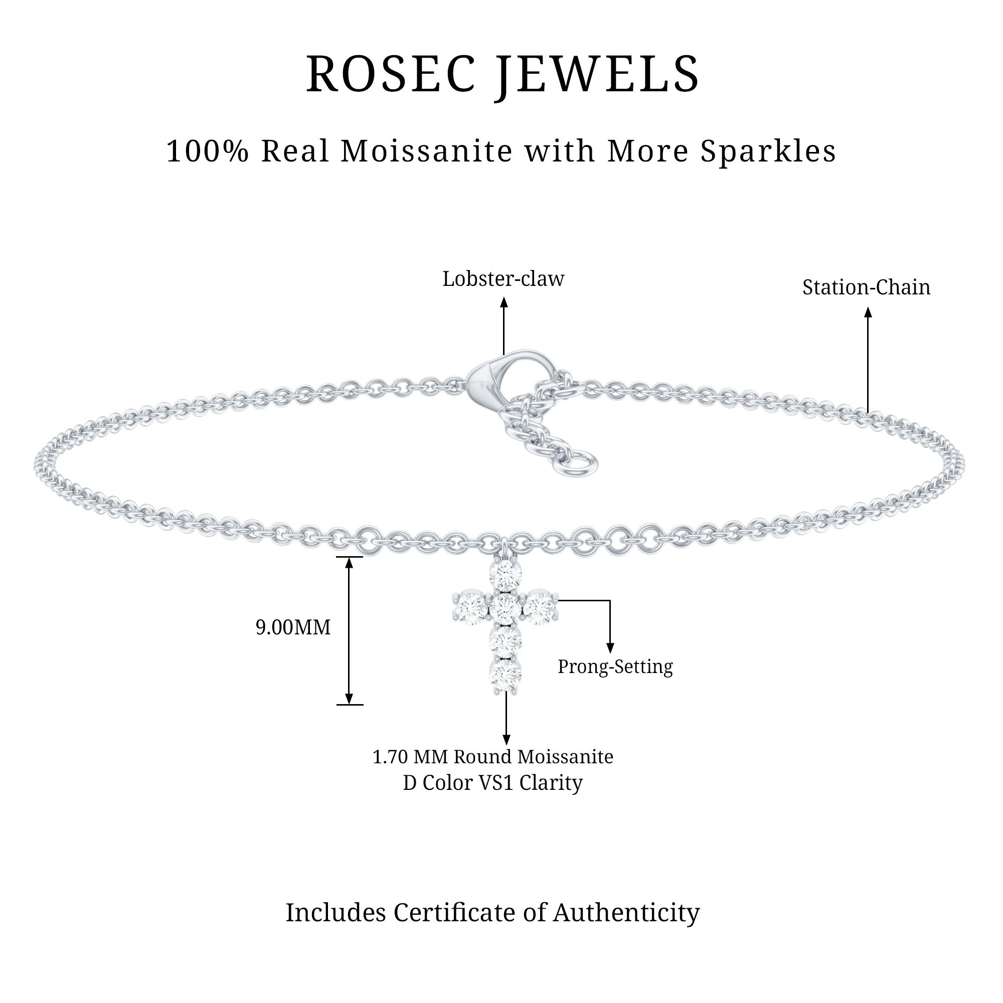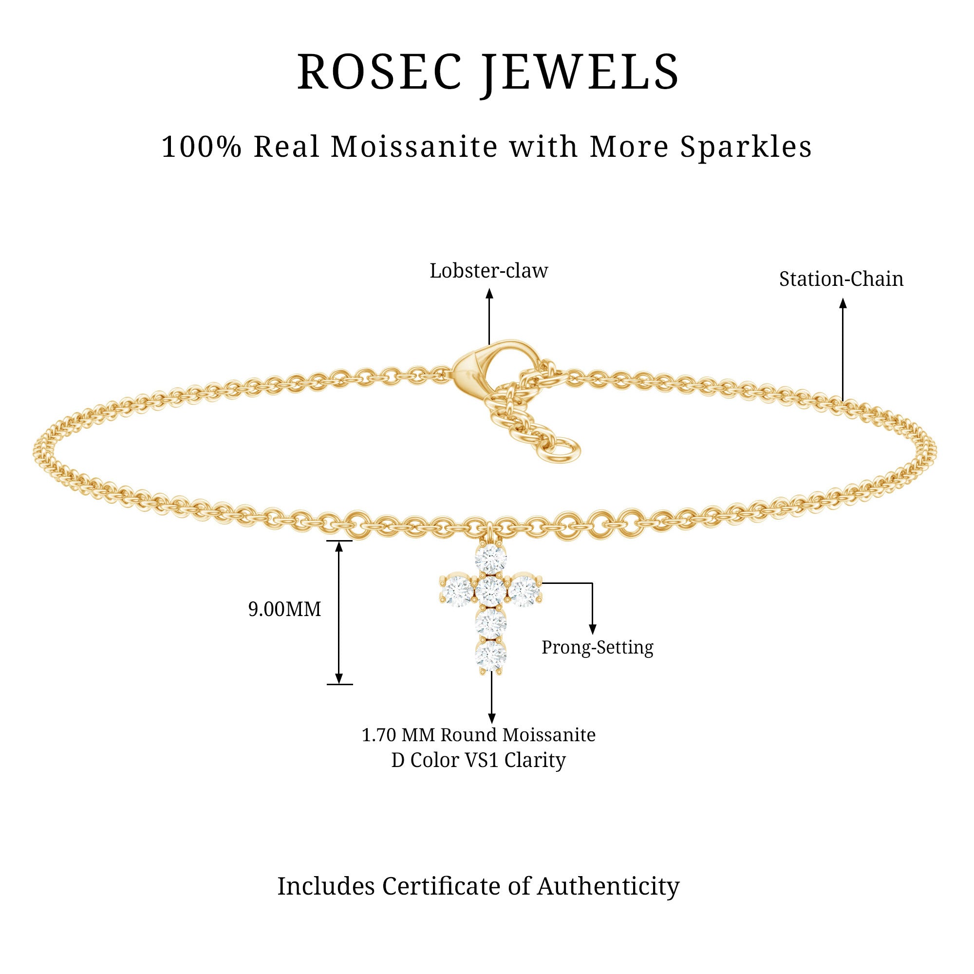 This Moissanite Cross Bracelet embodies spirituality, faith, and a divine connection. Its subtle design transcends trends and seasons, exemplifying timeless elegance. Adorned with round cut Moissanites arranged in a cross motif, this bracelet combines spiritual significance with a minimalist style, rendering it a meaningful accessory that exudes understated elegance. Symbolizing hope, faith, and eternal love, this Catholic Cross Bracelet possesses a distinctive charm and allure. The Cross bracelet design is suspended from a secure cable chain, fastened with a lobster clasp to ensure a perfect fit. Radiate sophistication and enhance your appearance with this signature piece. With its charm and appeal, this Cross Charm Bracelet seamlessly merges prominence with elegance. The D color VS1 clarity moissanite make a bold statement with their beauty and brilliance, capturing attention with their style.