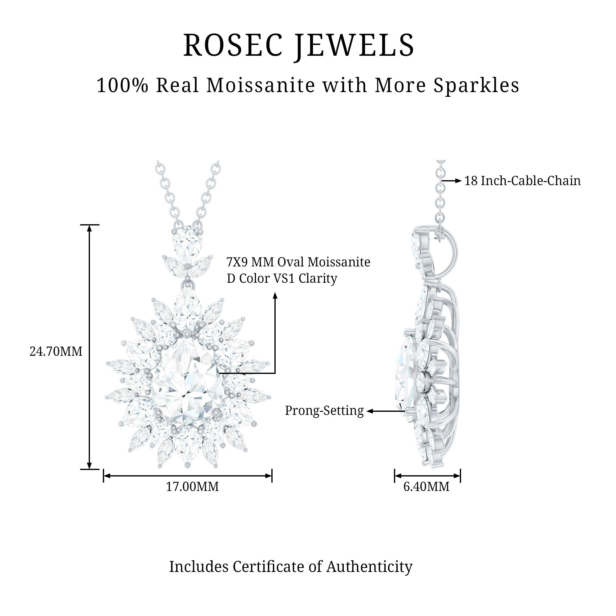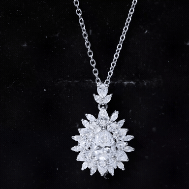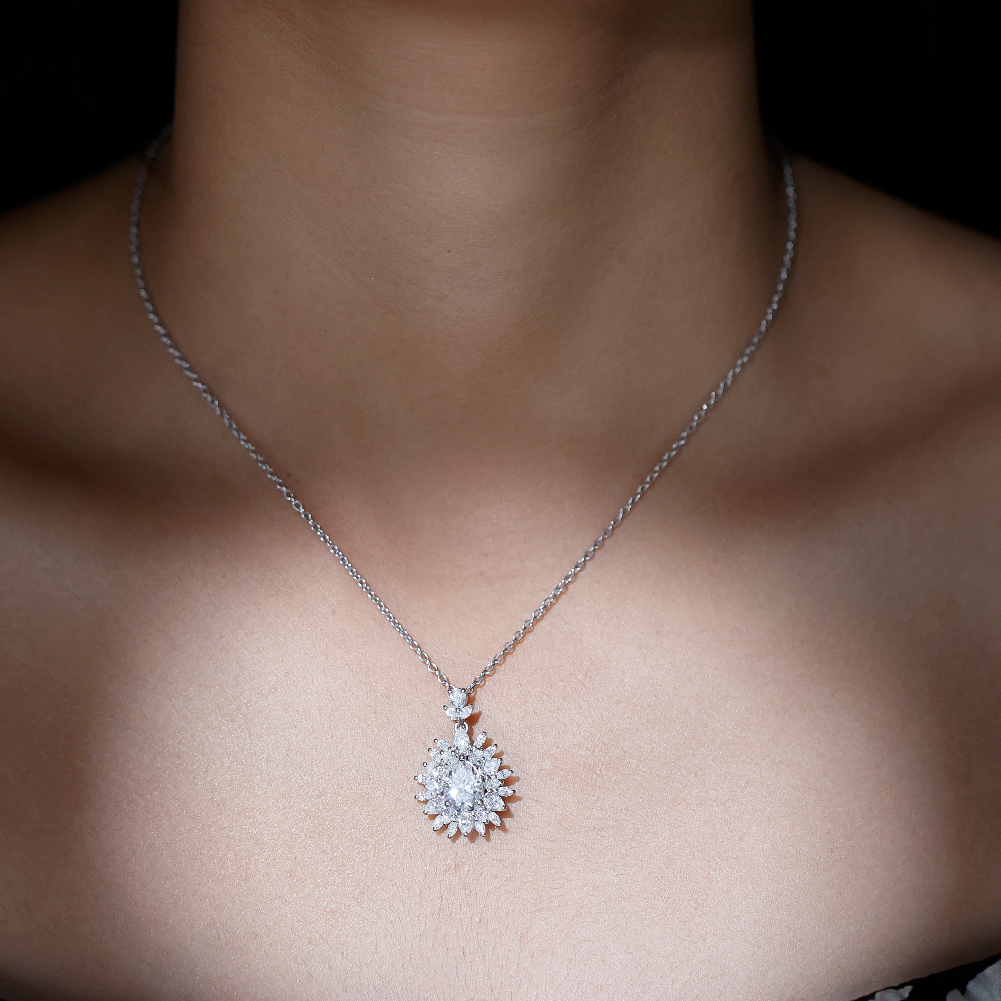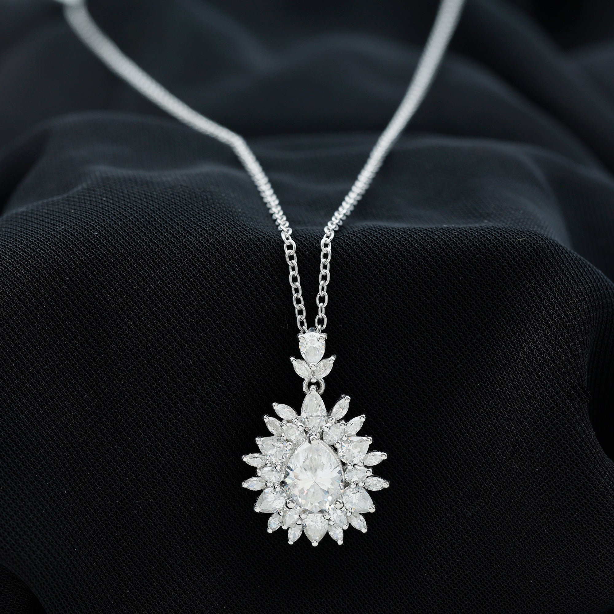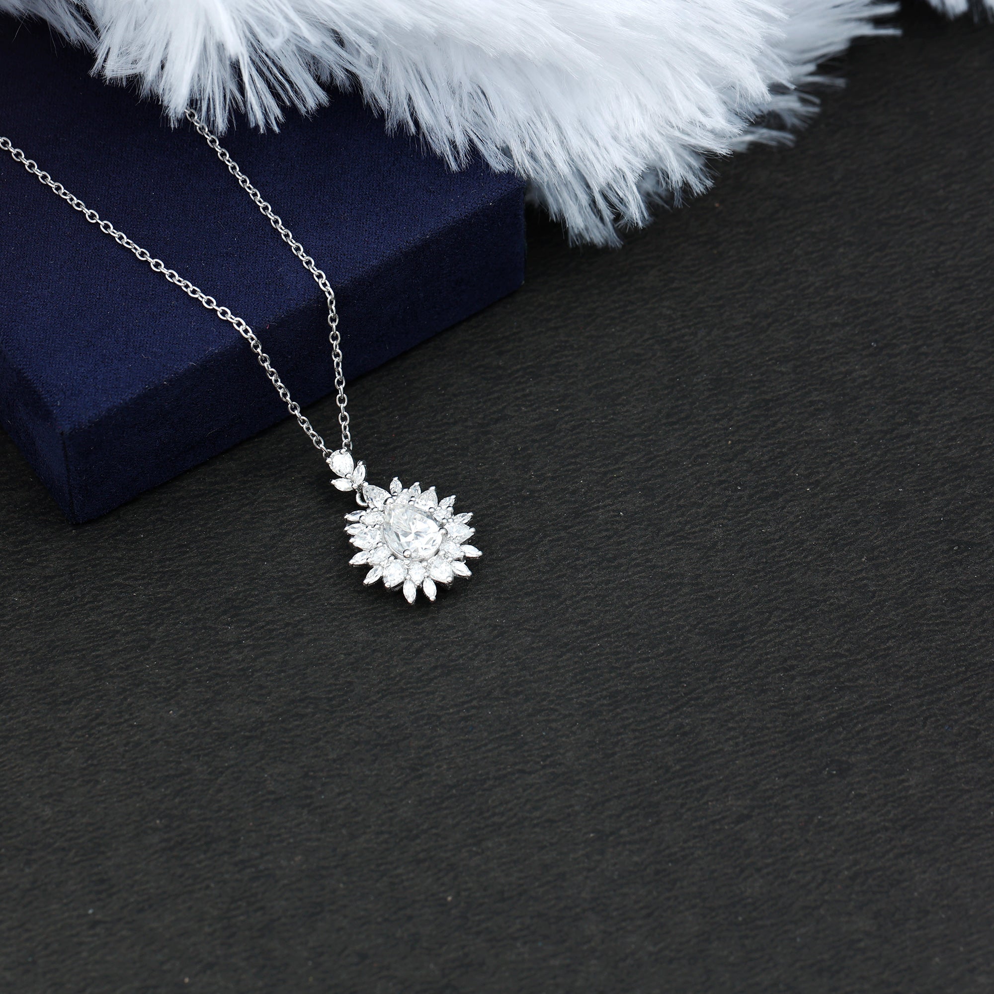 Step into elegance with a piece of jewelry that blossoms like a radiant flower - this Moissanite Designer Necklace is a true celebration of brilliance and beauty. At the heart of this design lies a captivating 7X9 MM pear shaped Moissanite which shines with its D color and VS1 clarity, making it a timeless piece. Surrounding the center stones is a blooming arrangement of pear and marquise cut stones, artistically layered to resemble petals of a flower. The prong setting used throughout adds durability and elevates the sparkle, giving each stone its moment to shine. The Moissanite Teardrop Pendant dangles gracefully from a sleek chain, both handcrafted in white gold plated silver. It is a perfect harmony of nature-inspired artistry and timeless sophistication. Whether you are the bride walking down the aisle, a bridesmaid stealing glances, or simply dressing up for a moment worth remembering, this Bridal Necklace for Wedding brings a magical glow that mirrors your joy.