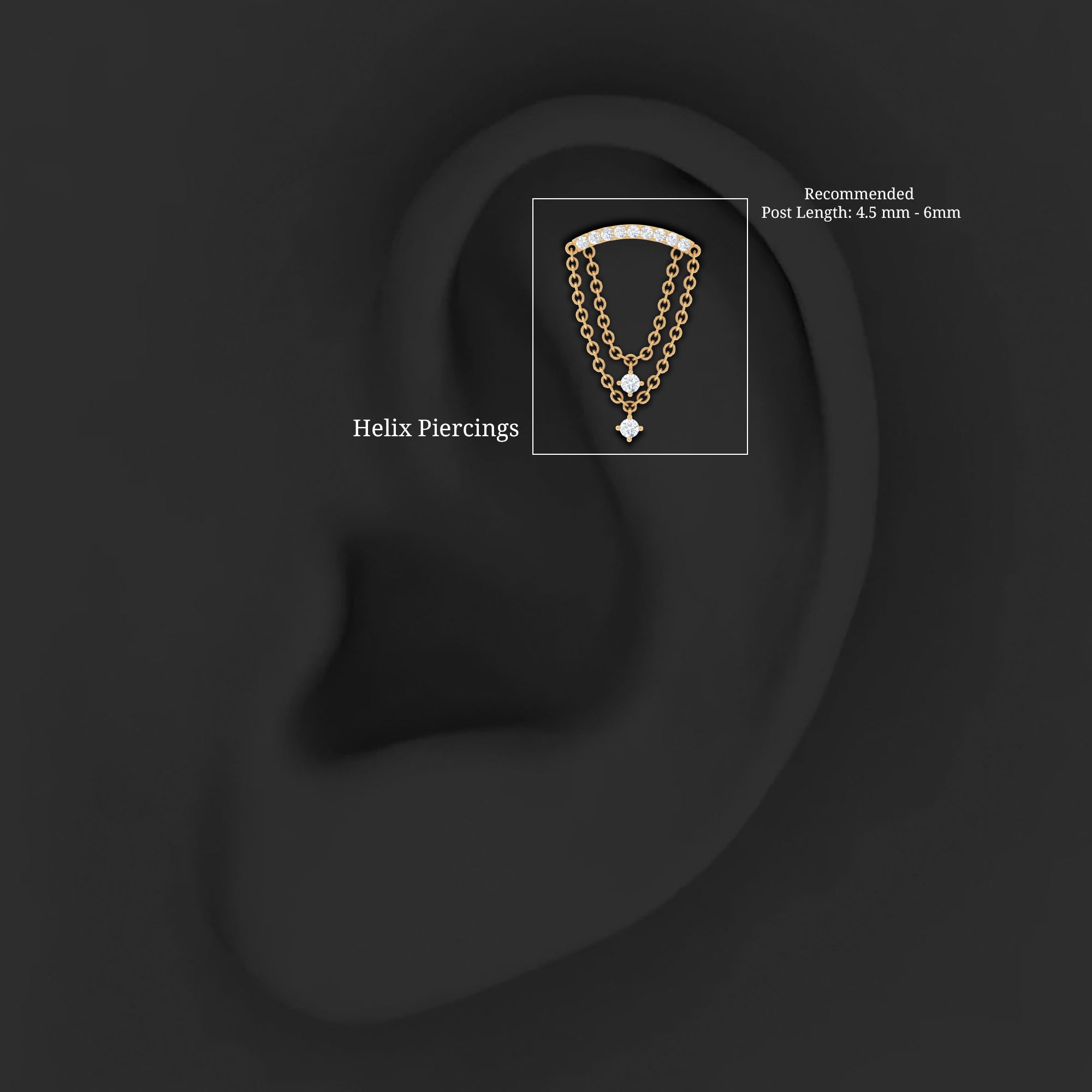 Make a bold and glamorous statement with this Moissanite Double Chain Dangling Earring. Embellished with Round Cut Moissanites on a gold curved bar and two dangling gold chain. Wear this Chain Earring on your Helix or Cartilage Piercing. Whether youre attending a special occasion or want to add a touch of glamour to your everyday style, this earring is the perfect choice.
