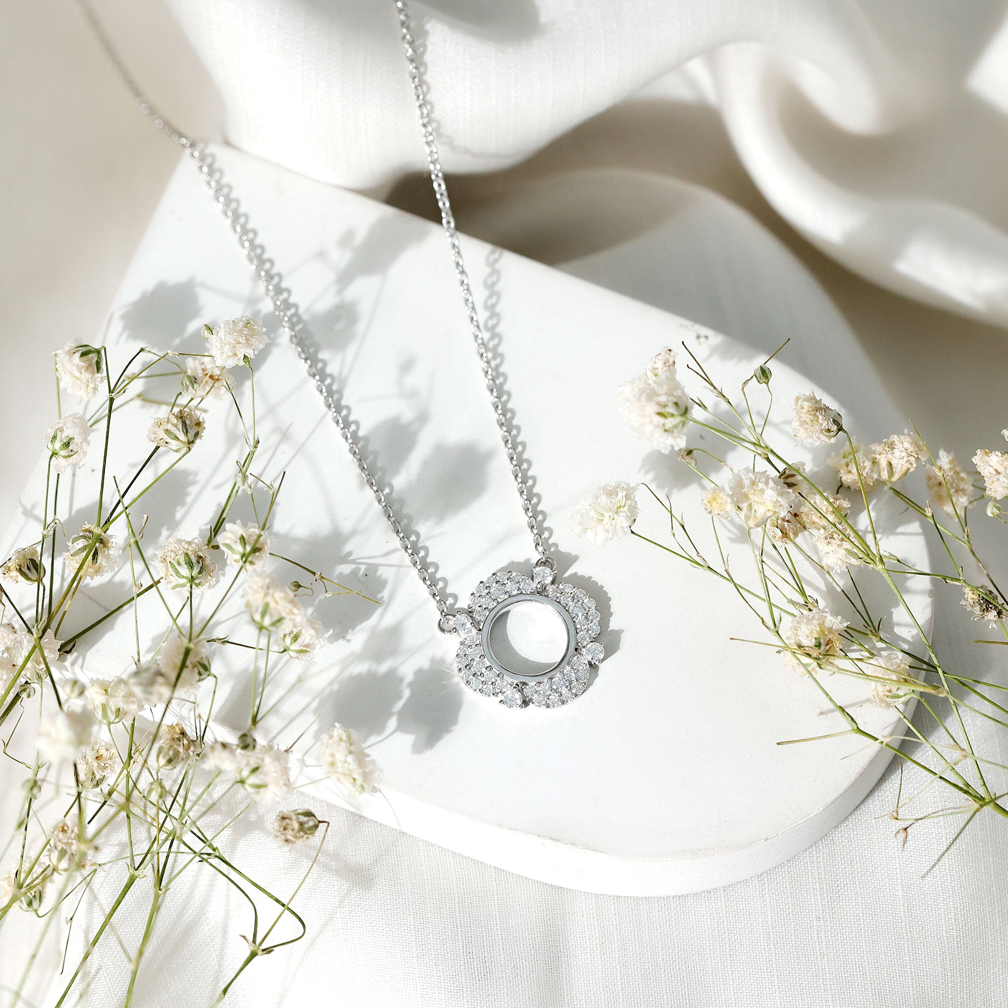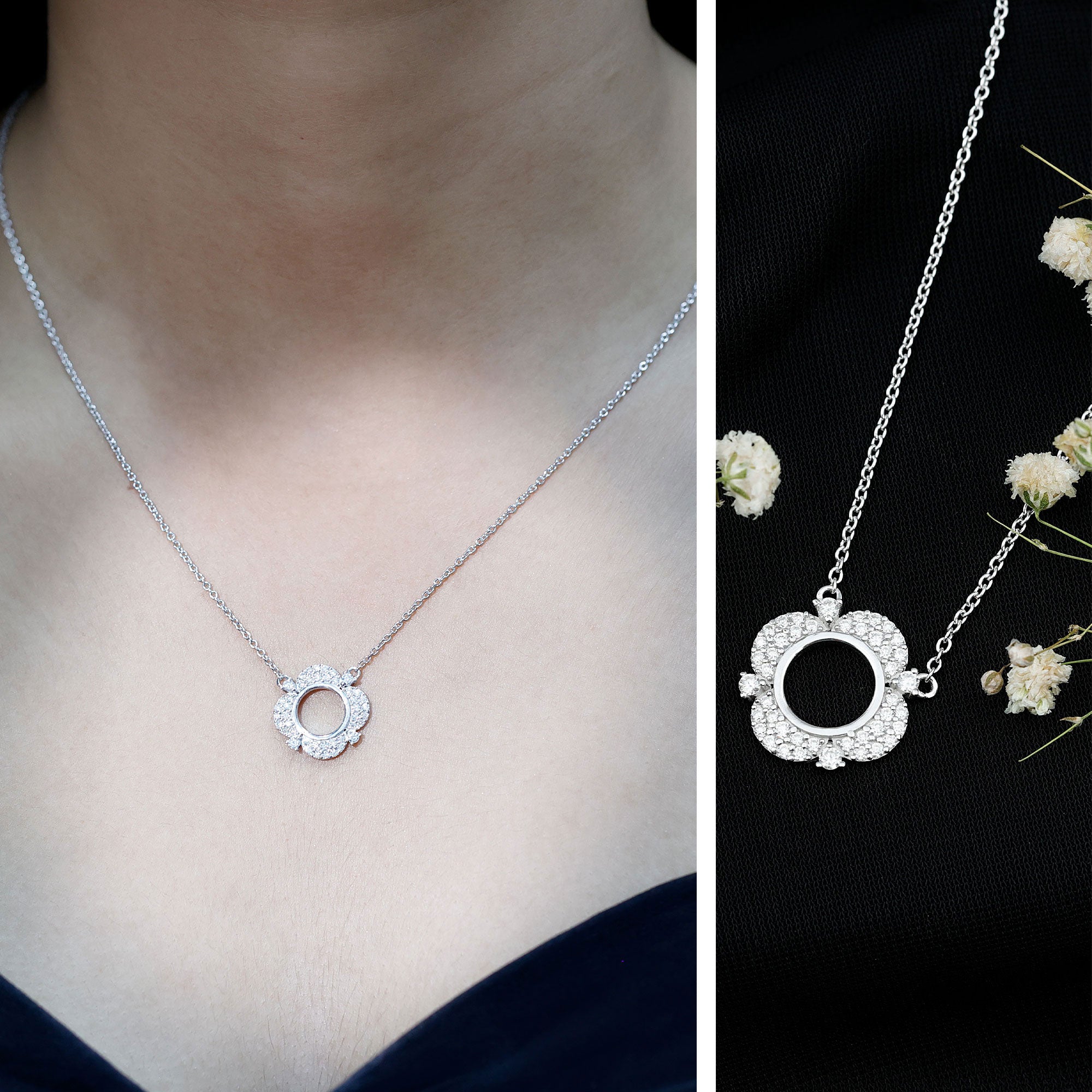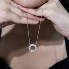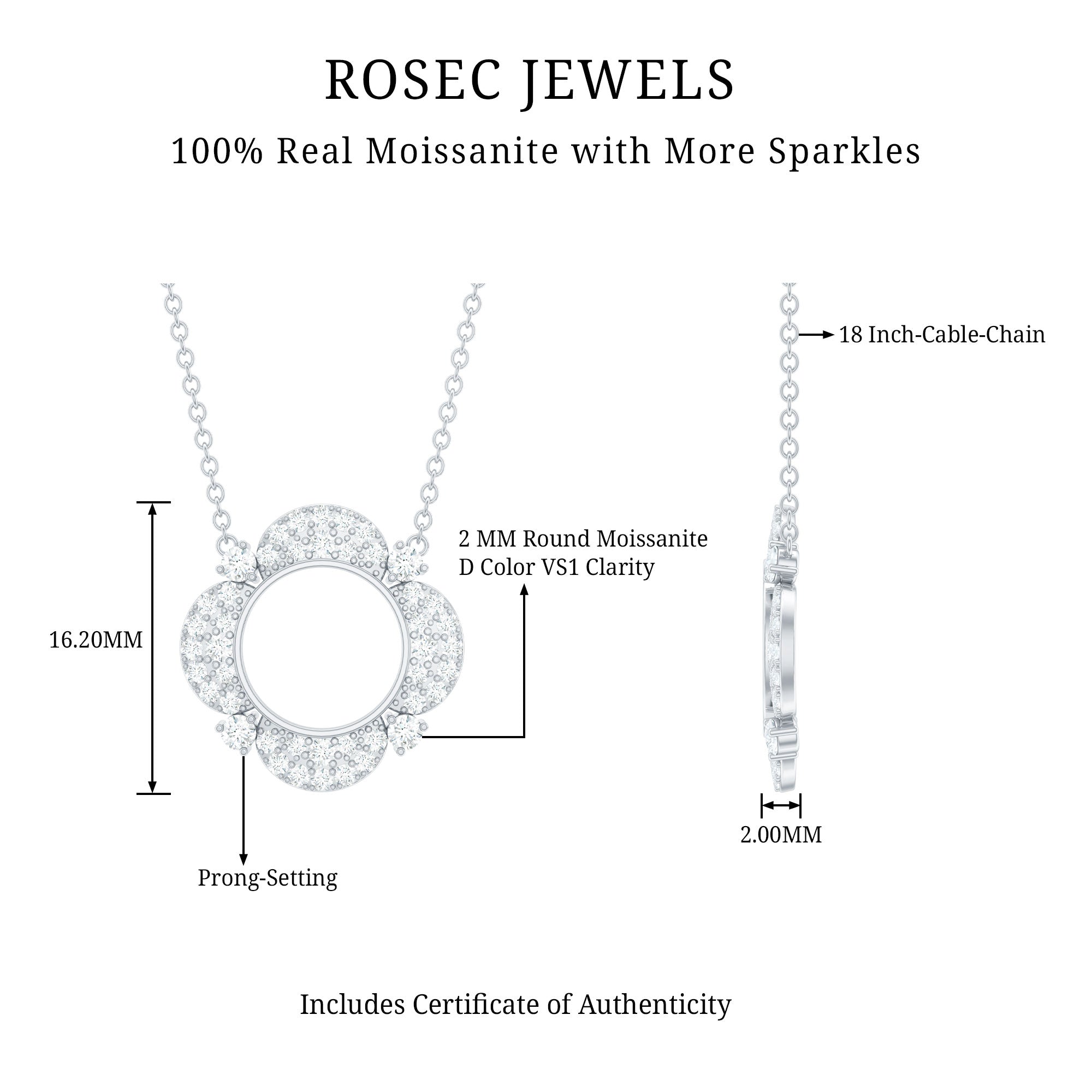 The Rosec Jewels Moissanite Circle of Love Necklace is valued not only for its stylish design but also for symbolizing eternal love. It features a designer open circle frame, with its true beauty found in the delicate arrangement of sparkling moissanite stones securely set in prongs. This design captures the charm of eternity, which is endless and bright. Made from 14K white gold plated silver, the Moissanite Circle Necklace is lightweight yet durable, making it ideal for daily wear or to add a special touch for occasions. It is classically stylish and completely elegant. This beautiful pendant offers a timeless appearance with its modern circle design. Accompanied by a fine cable chain, this Silver Circle Necklace sits gracefully on the collarbone, infusing any outfit with a sense of everlasting love. Whether you seek a striking accessory for special events or a refined addition to your daily wardrobe, this Eternity Necklace is a fantastic option. It also makes a meaningful gift for anniversaries, birthdays, or simply to express how much someone means to you.