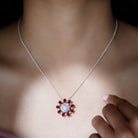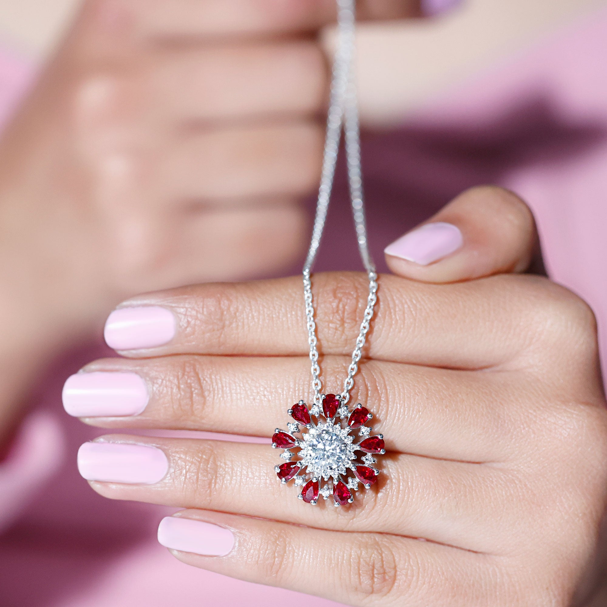 Moissanite Flower Pendant Necklace with Lab Grown Ruby