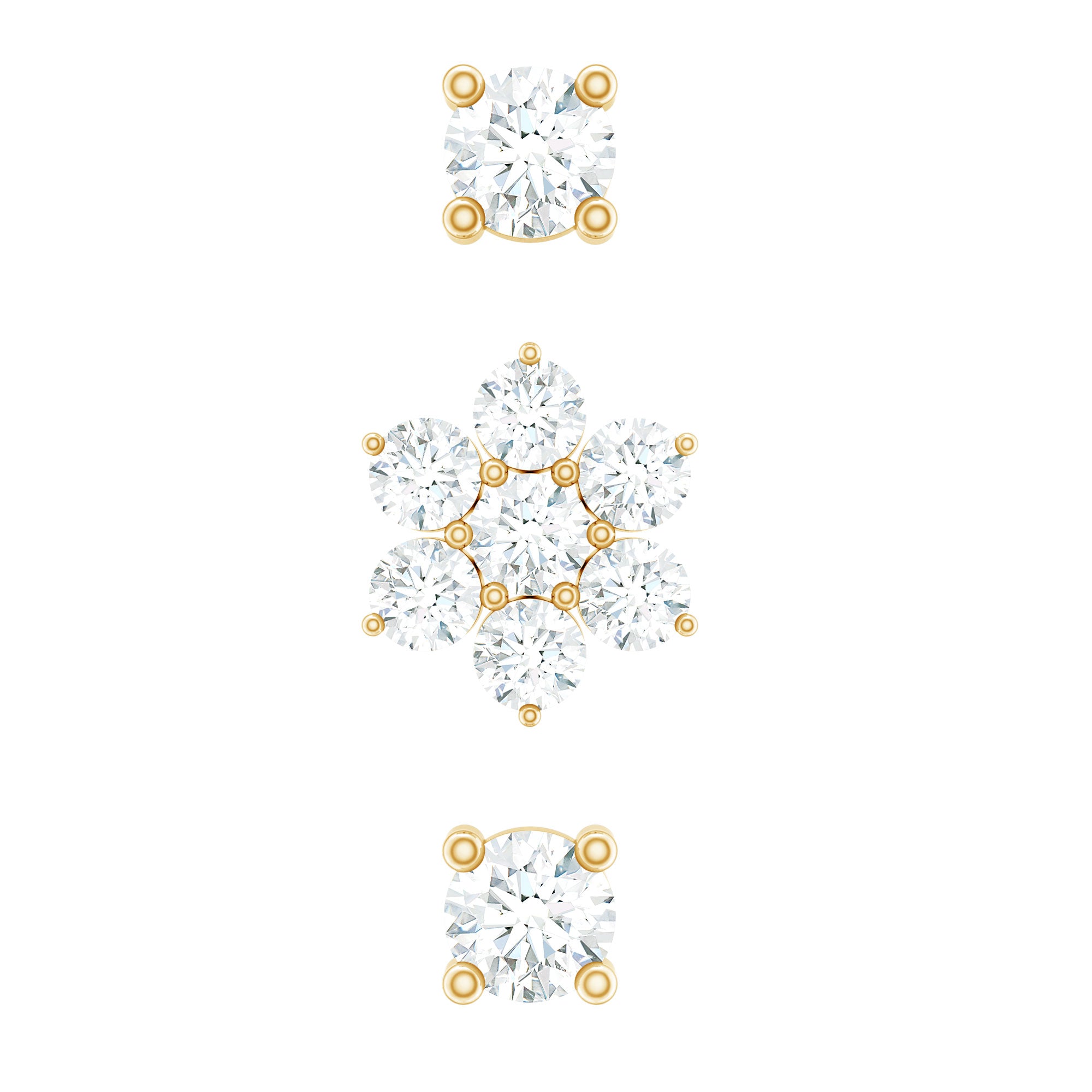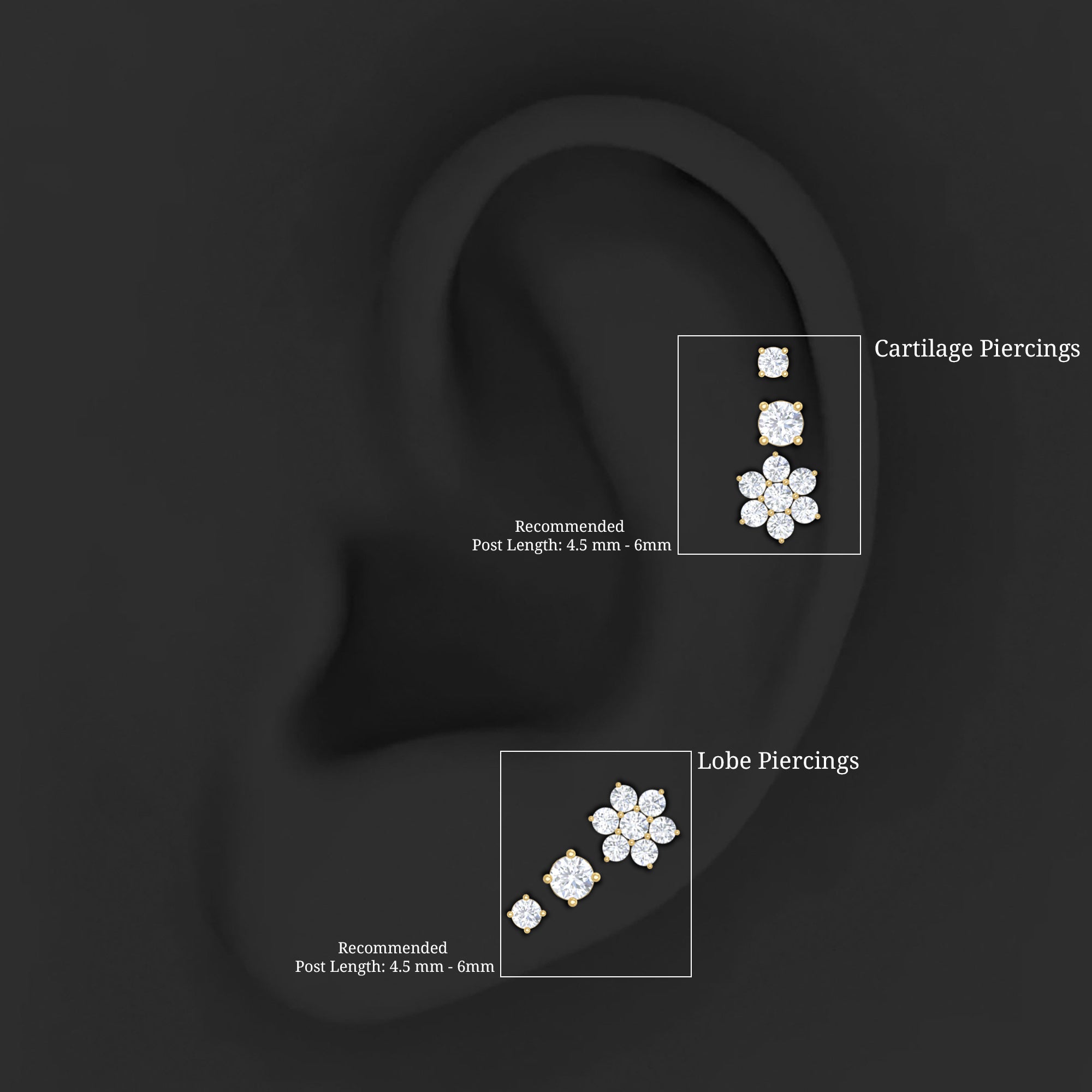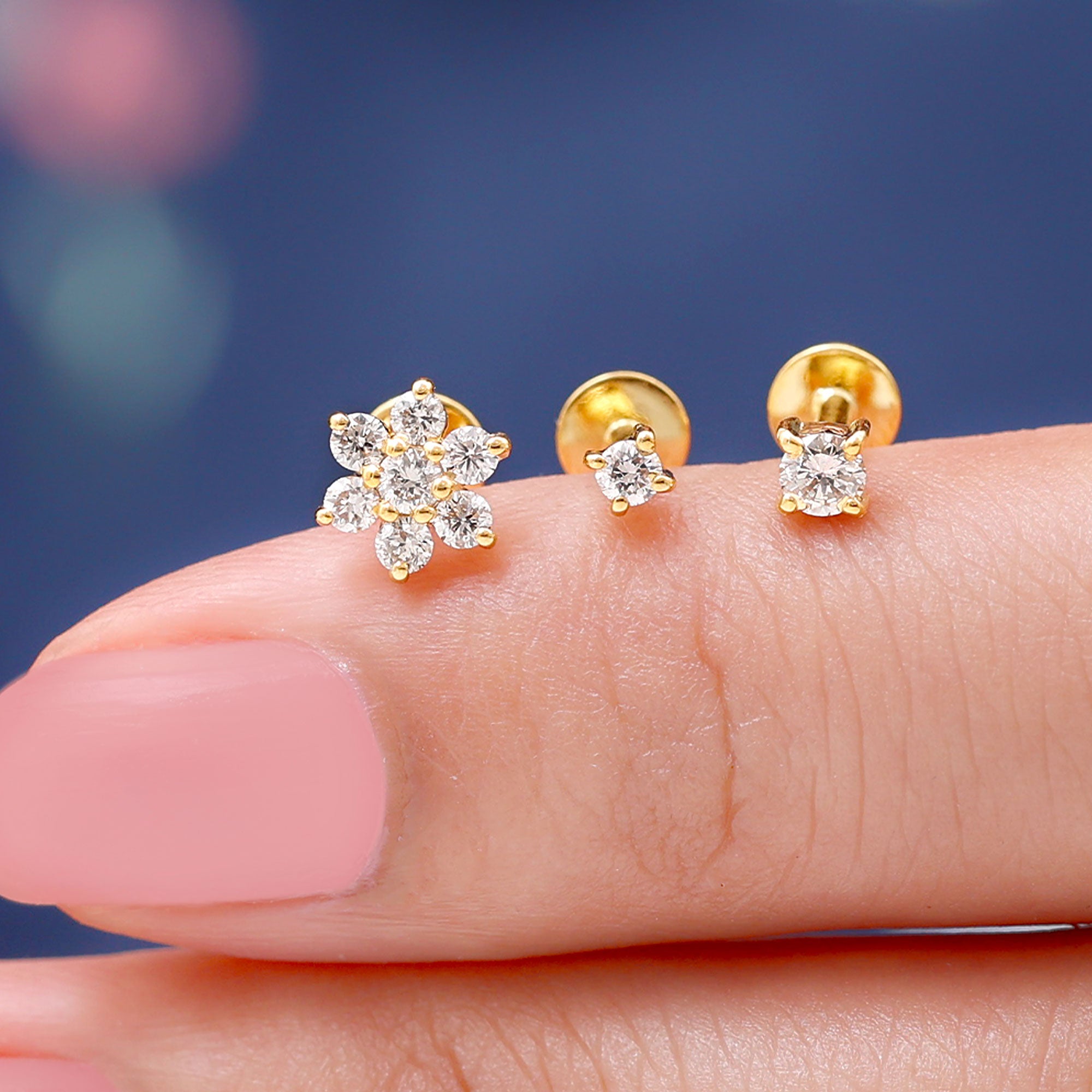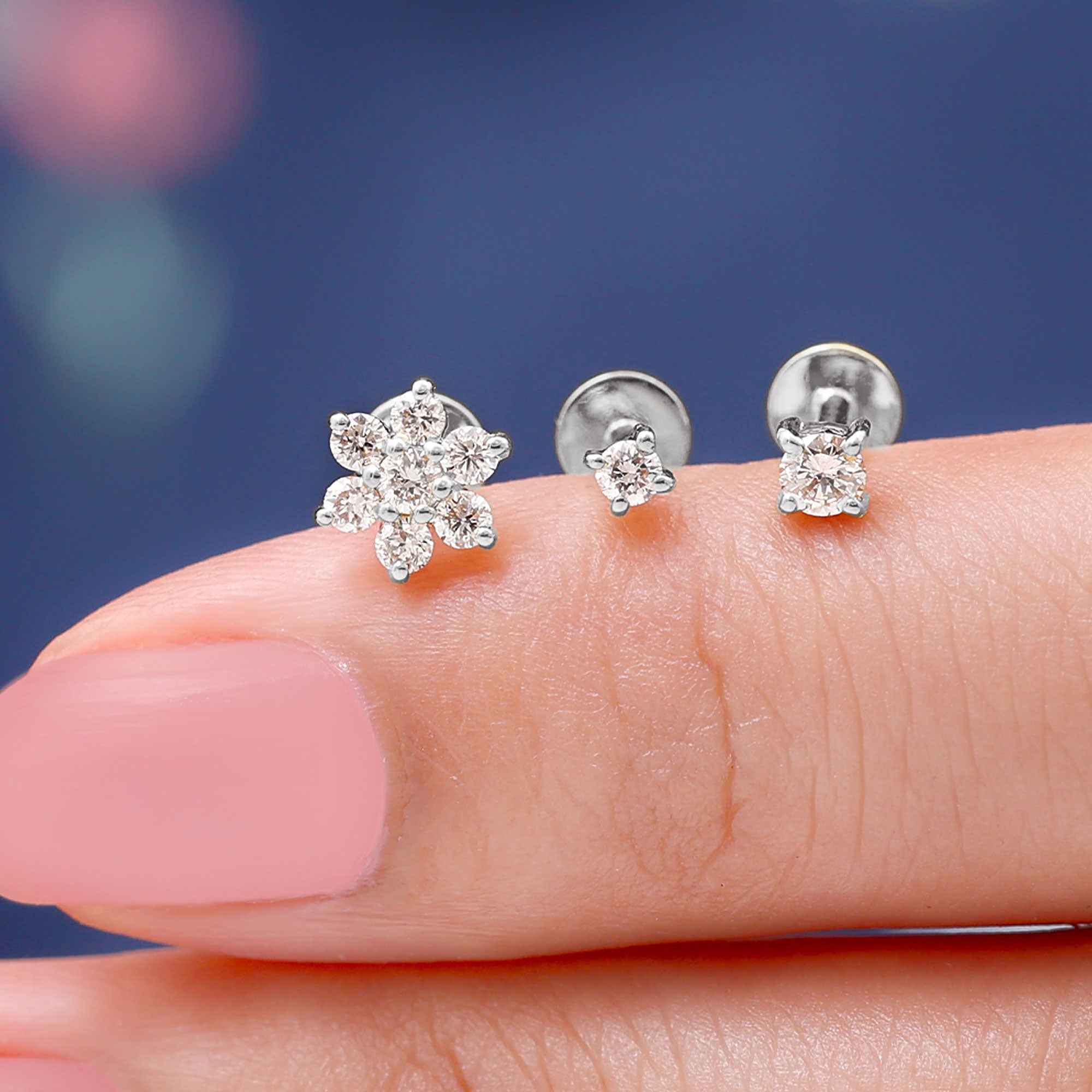 Create a stylish and coordinated ear look with this Flower Earring Set, designed for effortless mixing and matching. The set includes three beautifully crafted earrings - one delicate flower cluster stud and two simple solitaire studs. Each piece is adorned with round cut Moissanite stones, carefully placed in prong setting to enhance their sparkle and shine. Made from high-quality metal, this versatile Triple Earring Set is perfect for multiple piercings. You can wear them on your lobe, cartilage, helix, tragus, or conch to create a unique and layered style that suits your mood. Whether you prefer a minimal look or a more detailed ear stack, this Moissanite Earring Set offers endless styling options. Comfort and security are thoughtfully built into the design. Each earring features a flat back closure, making them easy to wear for long hours without irritation. The lightweight feel ensures they sit comfortably while staying firmly in place throughout the day.