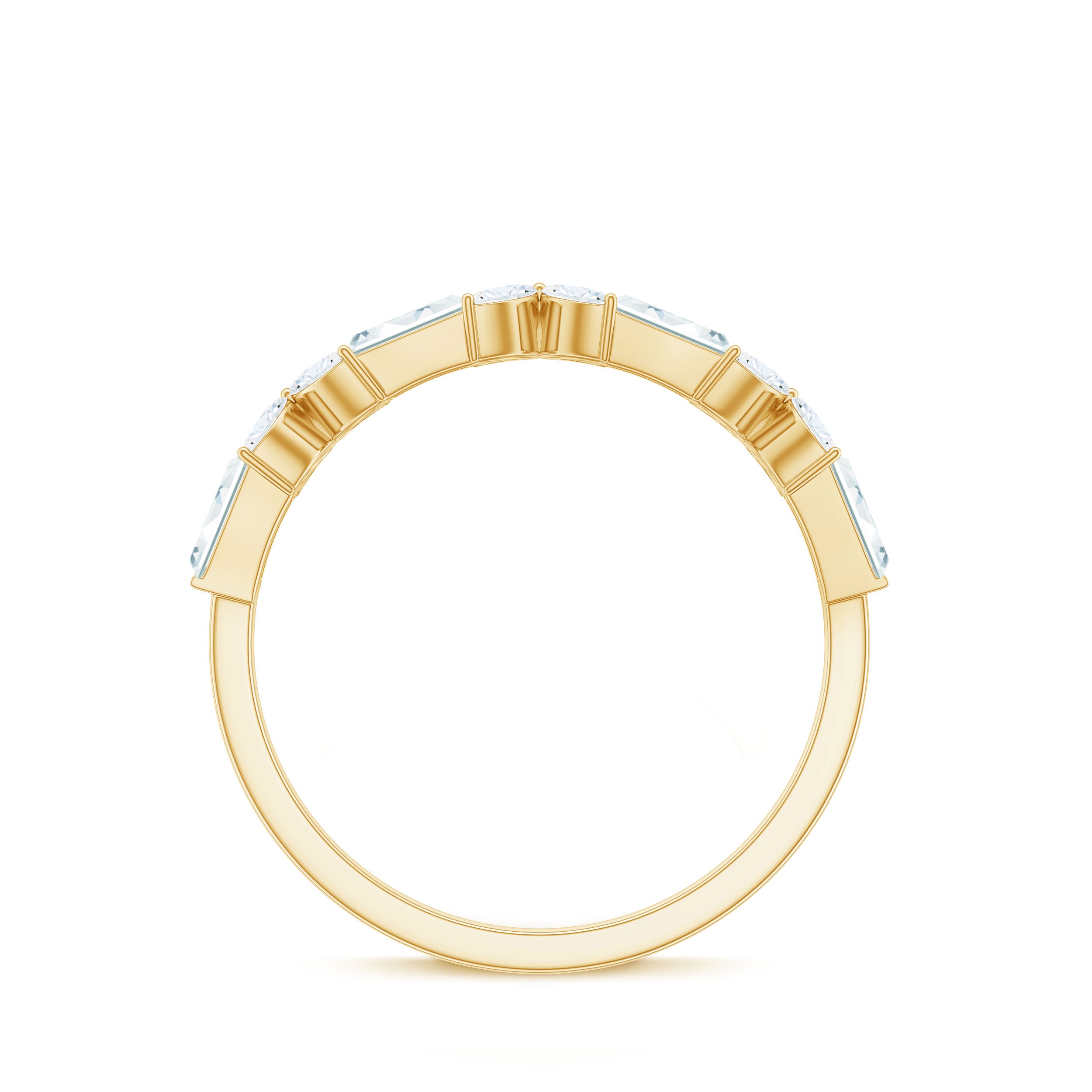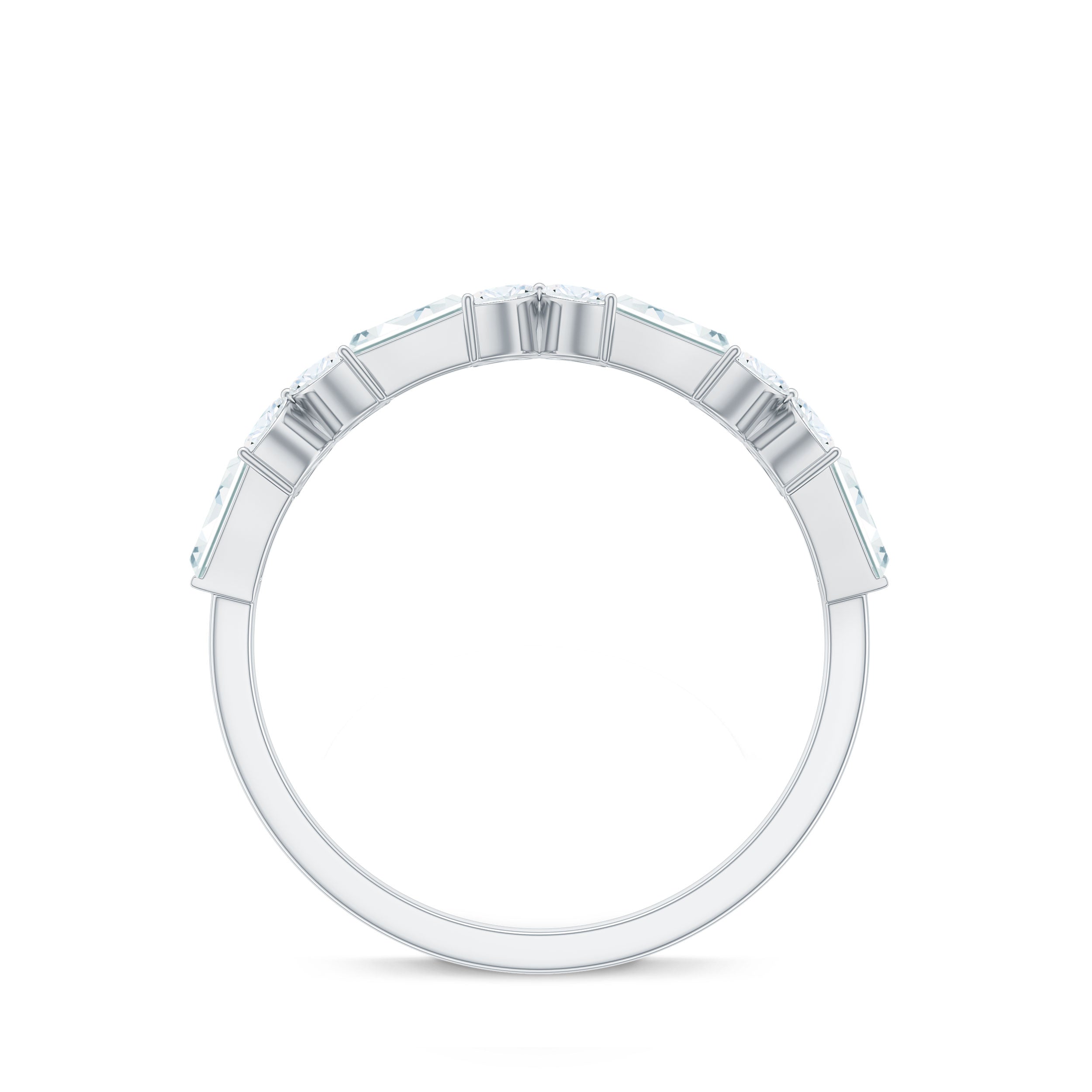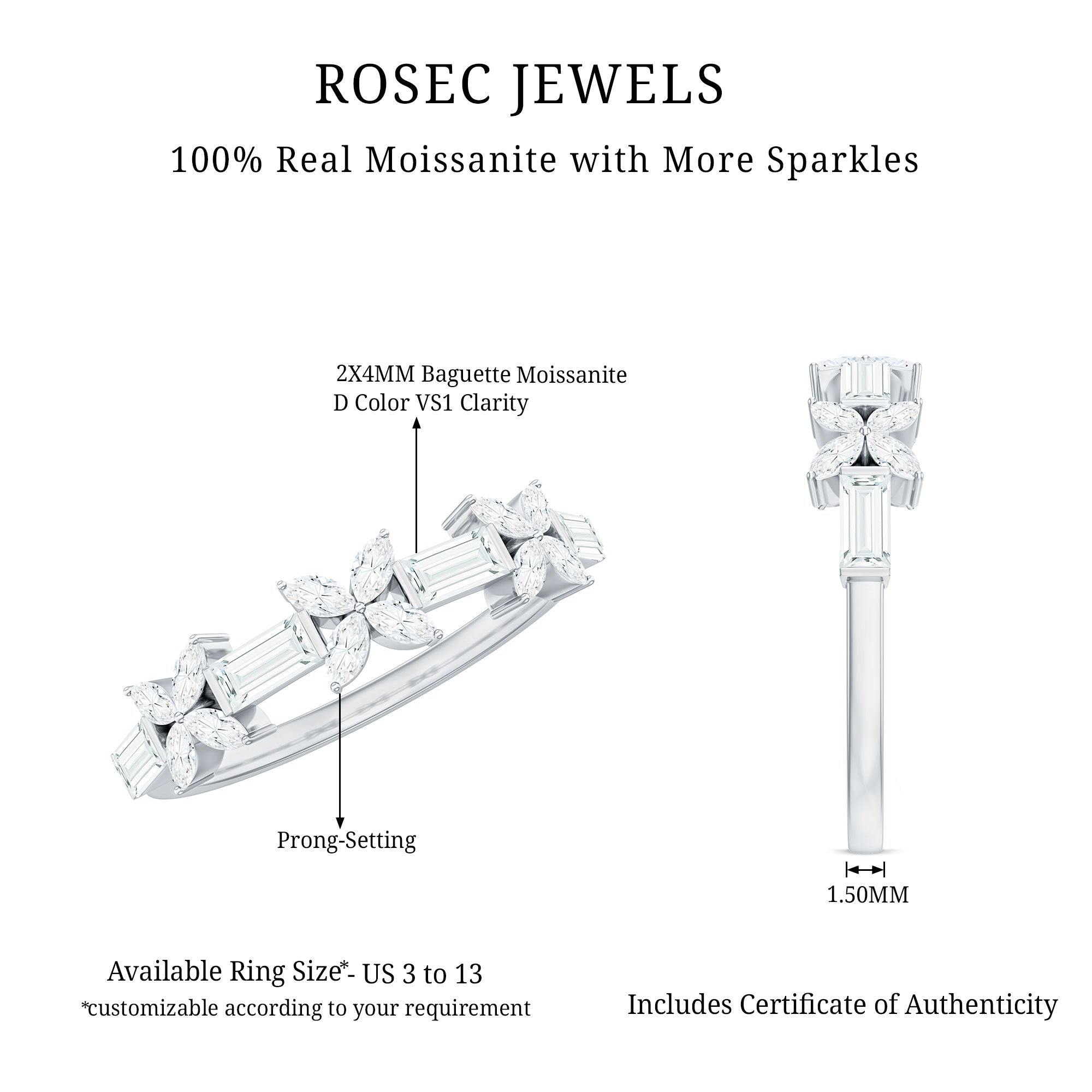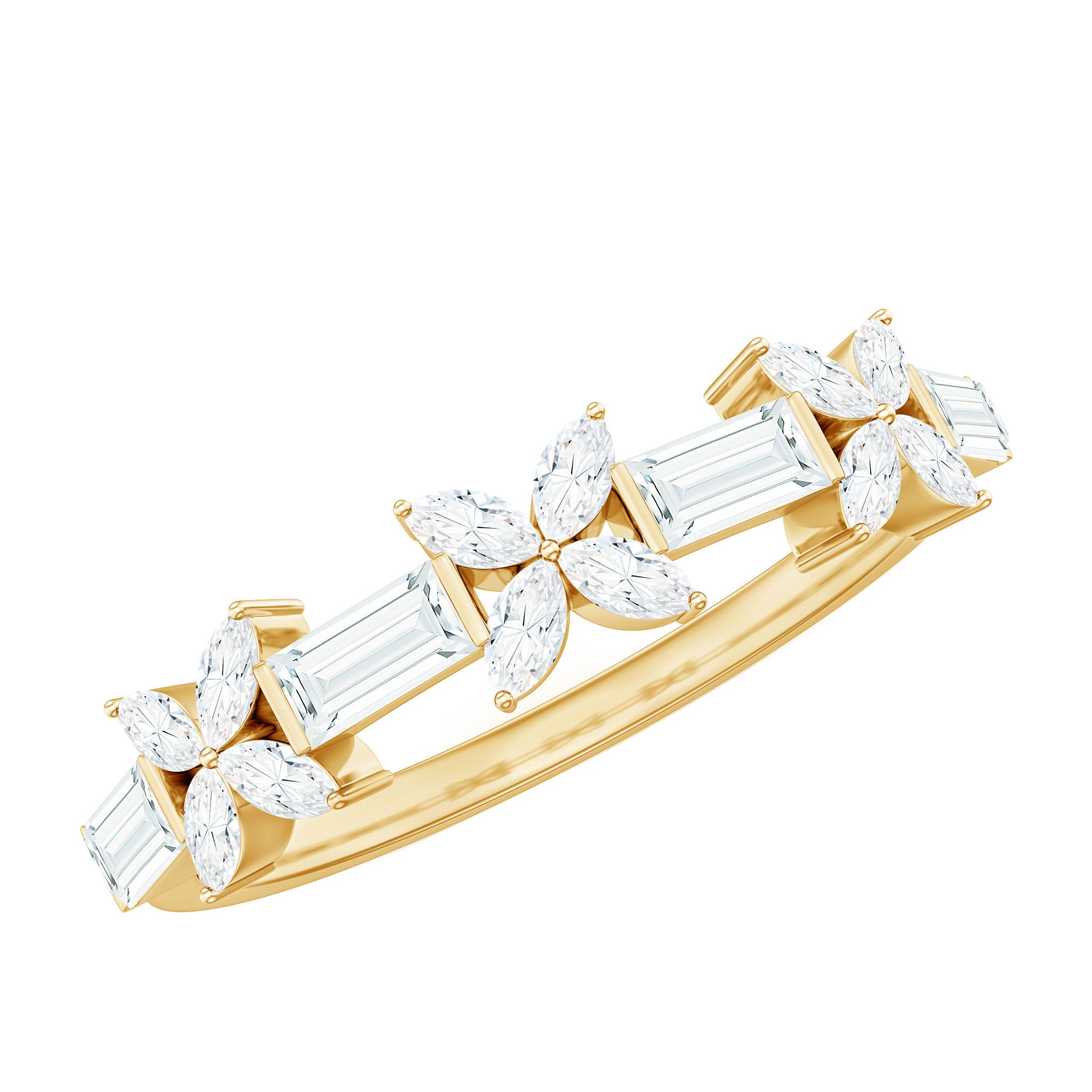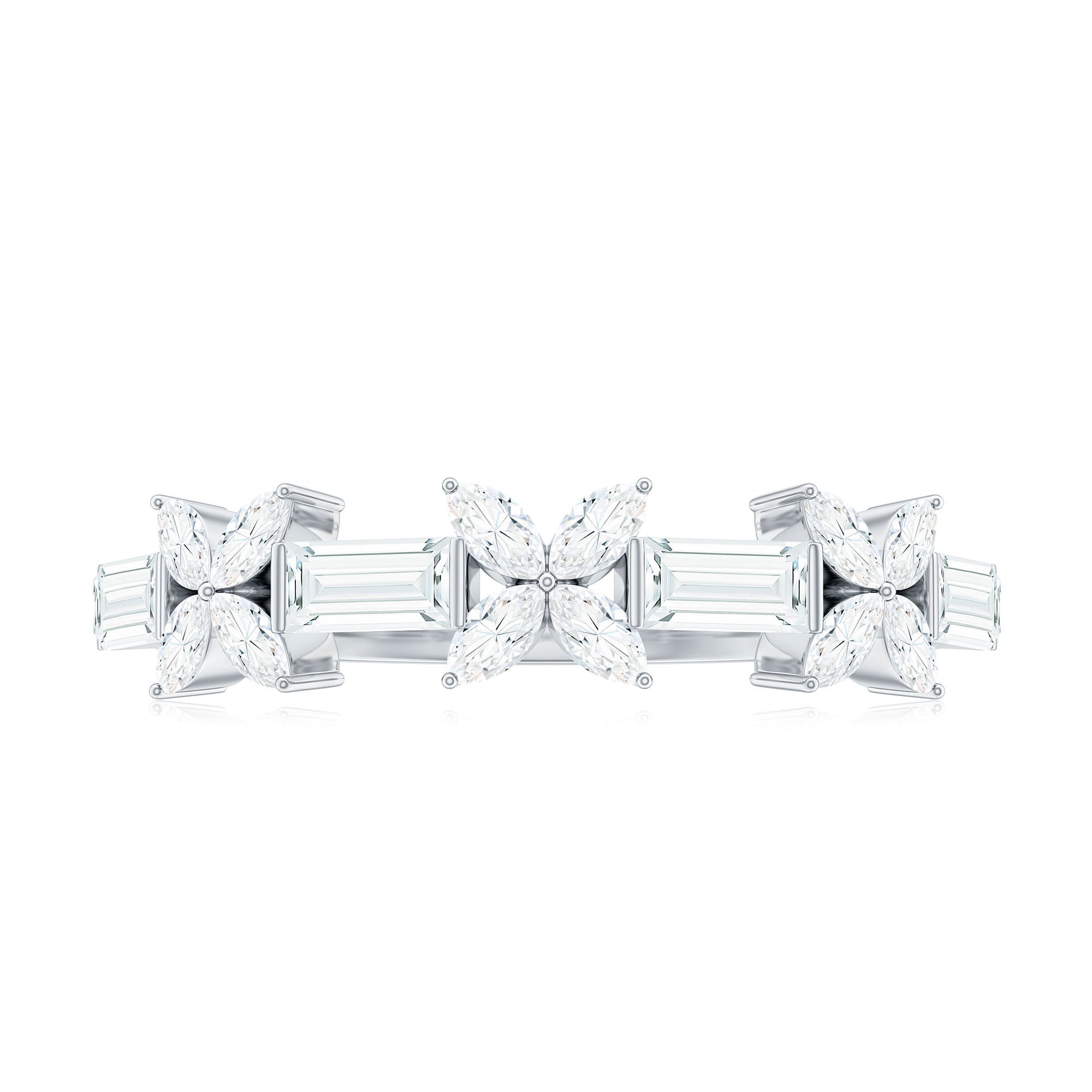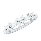 Bring a touch of nature to your jewelry collection with this beautiful Flower Wedding Band. Designed with elegance and meaning, this Half Eternity Ring features a unique mix of baguette and marquise cut moissanite stones, carefully arranged in a delicate floral pattern. Each flower is formed with four marquise stones, while the baguette stones sit between them, adding shine and balance to the overall design. The moissanite stones used in this Half Eternity Wedding Band are of top D-VS1 quality, offering brilliant sparkle and clarity. The stones are set securely using a mix of prong and bar setting, giving the Moissanite Eternity Ring a refined and polished finish while making sure the gems stay in place. This floral inspired Moissanite Wedding Band is perfect for women who love jewelry that is a little different yet timeless. Whether you are wearing it on your wedding day, as an anniversary gift, or simply as a beautiful everyday piece, it is designed to symbolize love, growth, and beauty. Available in a wide range of metal colors, metal types, and US ring sizes from 3 to 13, you can choose the perfect match for your style and preference. Its half eternity design also makes it comfortable to wear while still offering plenty of sparkle across the top of the band.