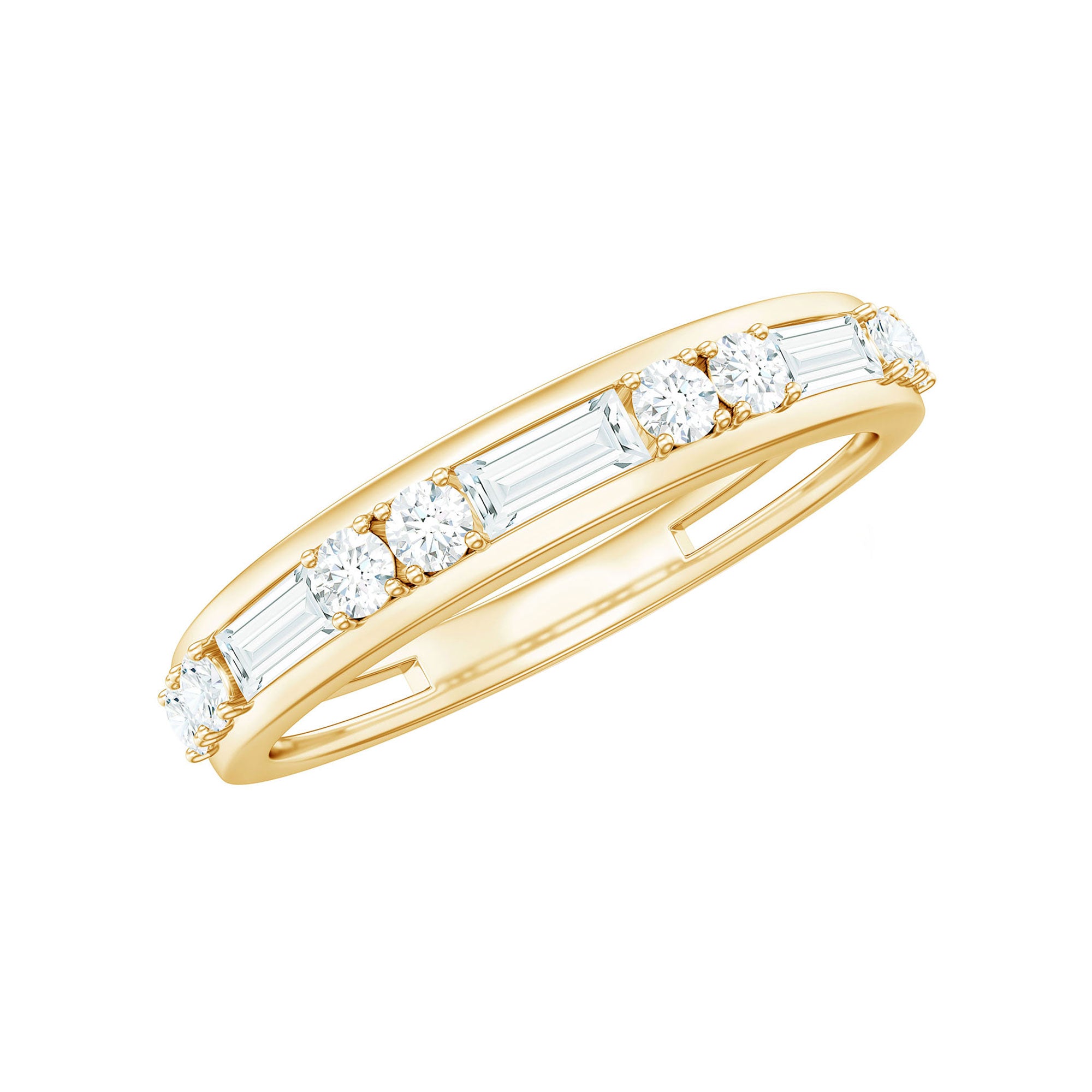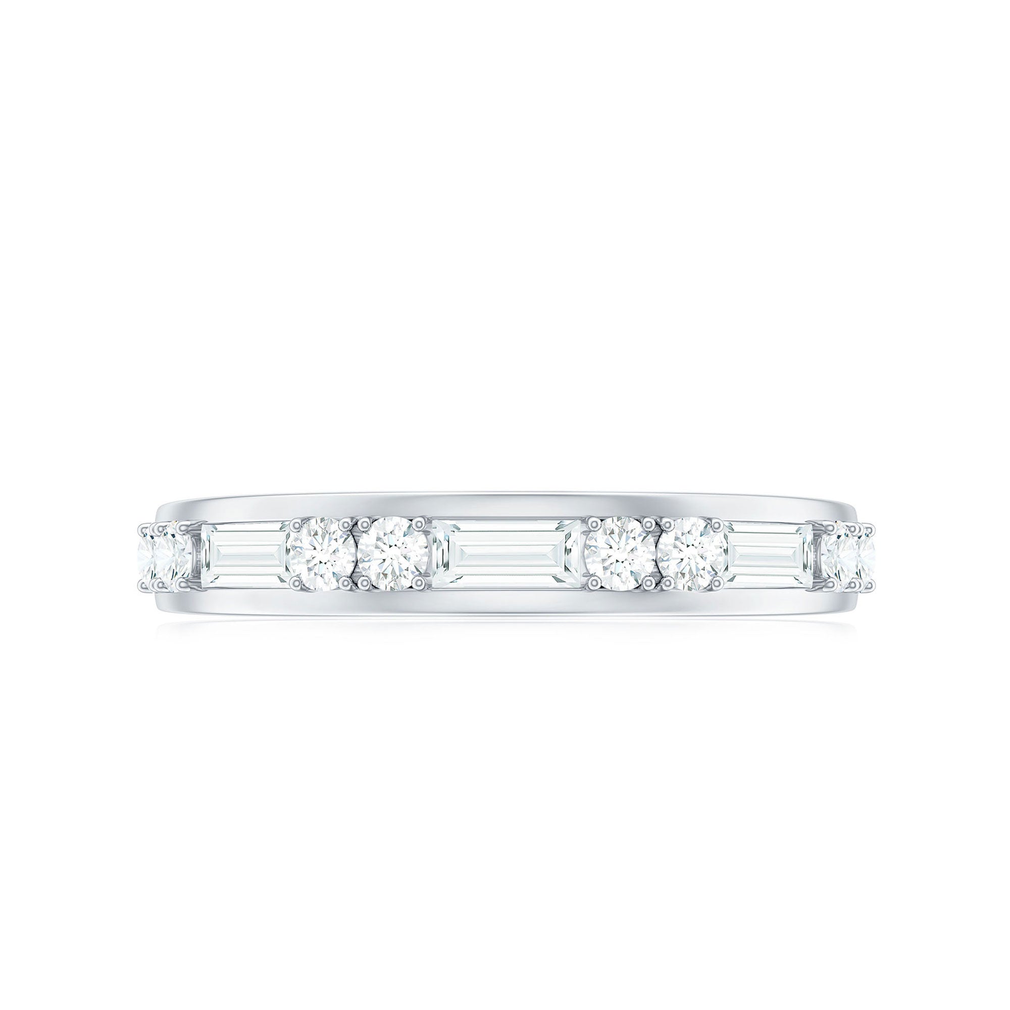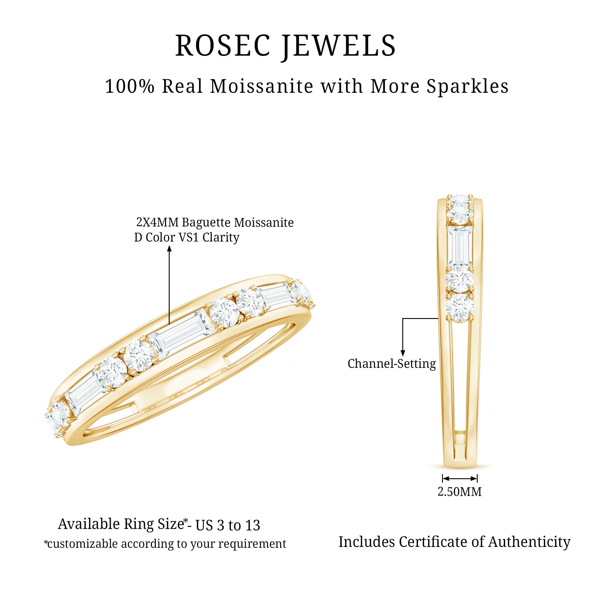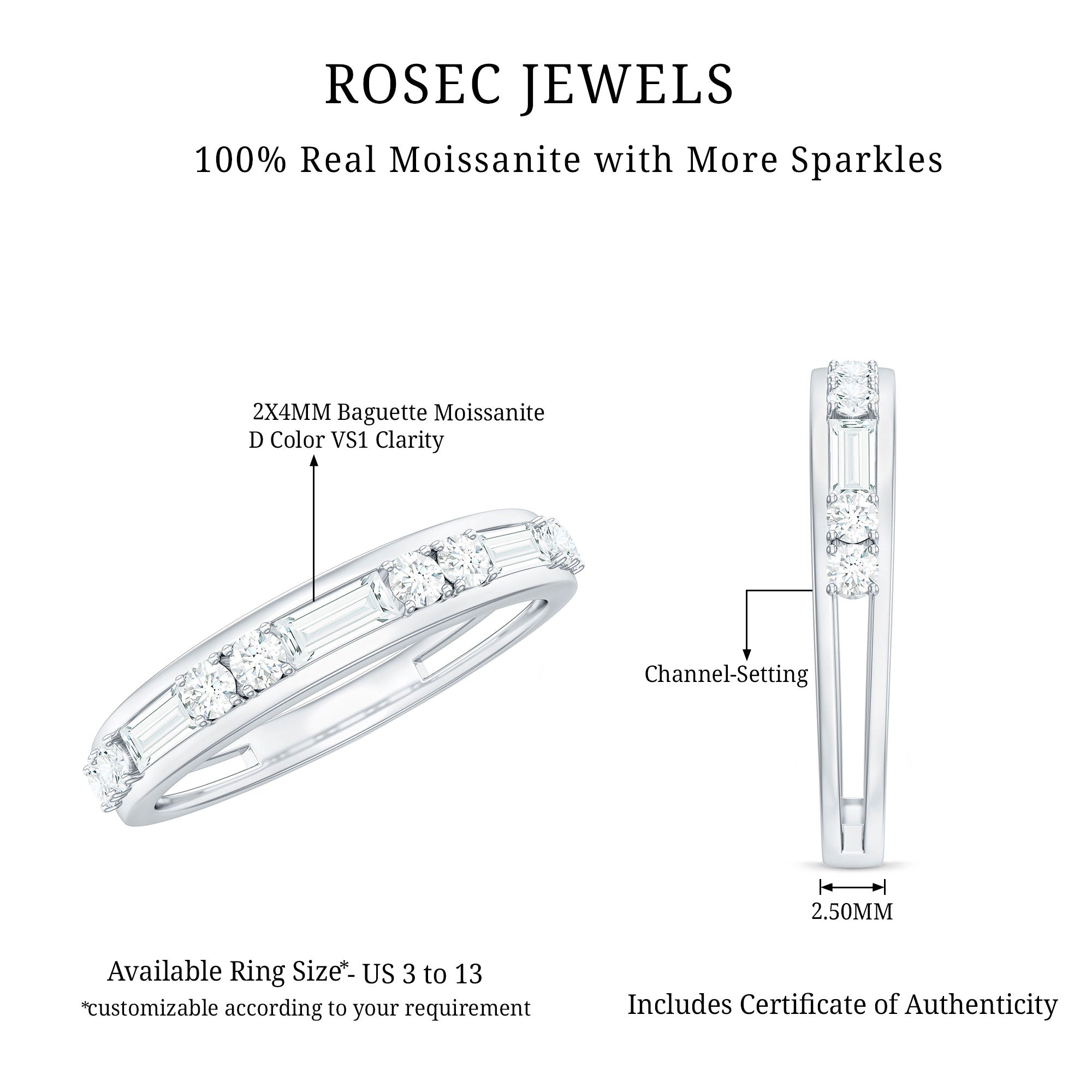 Rosec Jewels stunning Moissanite Half Eternity Ring is a perfect symbol of love and commitment, designed with a clean and modern style that suits everyday wear. The ring features a beautiful arrangement of sparkling moissanite stones in a half eternity design. It combines elegant baguette cut stones set horizontally (east-west style) with round cut stones, adding extra shine and charm. Crafted with D color and VS1 clarity moissanite stones, this Eternity Wedding Band offers brilliant sparkle. Its minimalist design makes it easy to wear alone for a simple look or stacked with other rings, including engagement rings, to create a unique style. Whether you want a ring for daily wear or a special occasion, this Wedding Anniversary Ring fits perfectly. This versatile piece is ideal for brides or anyone wanting a meaningful gift for weddings, anniversaries, or important milestones. The sleek design blends well with both modern and classic jewelry, making it a timeless addition to any collection. It also comes with a certificate of authenticity, ensuring the quality of the stones. Delivered in a lovely jewelry box, this Moissanite Stackable Ring is ready to be gifted or kept as a treasured keepsake. Its elegant yet simple design makes it a meaningful and stylish choice for anyone celebrating love and special moments.