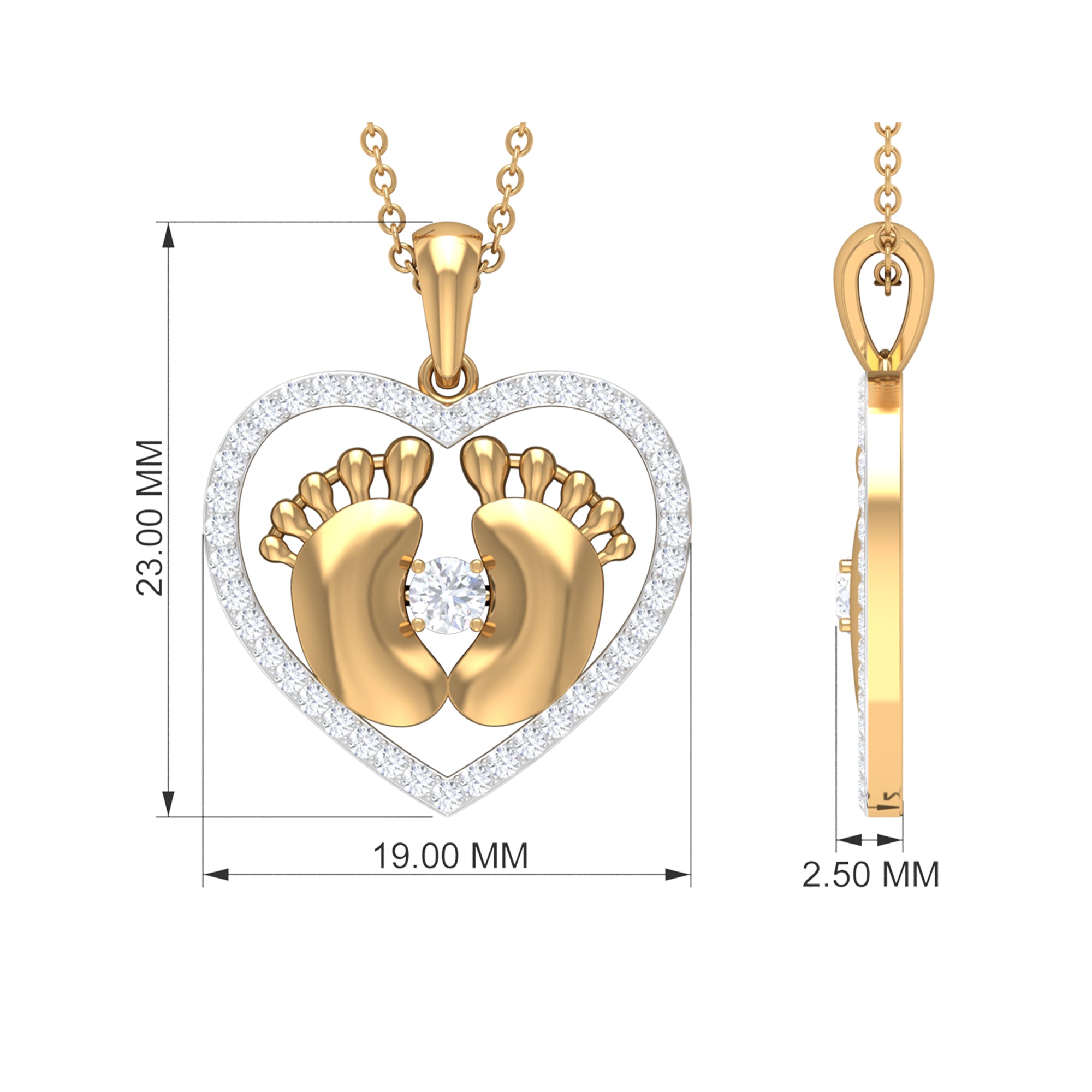 Celebrate Motherhood with this Moissanite Pendant. It features a unique design that includes a metallic baby foot placed in the Moissanite studded Heart frame. A 3 MM Moissanite placed at the center in Prong Setting. This Heart Pendant Necklace is perfect for being presented to a Mom-to-be or a new mom. The cute baby feet make the design of this pendant unique and behold the classic shine of D-VS1 Quality Moissanite. Get this pendant for the one who is going to experience motherhood soon. This Heart Moissanite Pendant will be delivered to you in a classic jewelry box with a certificate of authenticity.
