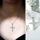Keep your belief close to your heart with this Moissanite Cross Pendant, crafted with 14K White Gold Plated Silver. The pendant features Round Shape Moissanite embedded on the metallic cross frame in Prong Setting. The Necklace is accentuated with a standard bail that dangles in a sturdy chain, beholding the shine of D-VS1 Quality Moissanite. This Christian Cross Necklace is the symbol of divinity, blessing, and grace, which can be presented to your special one on occasions such as Christmas, birthdays, and graduation.