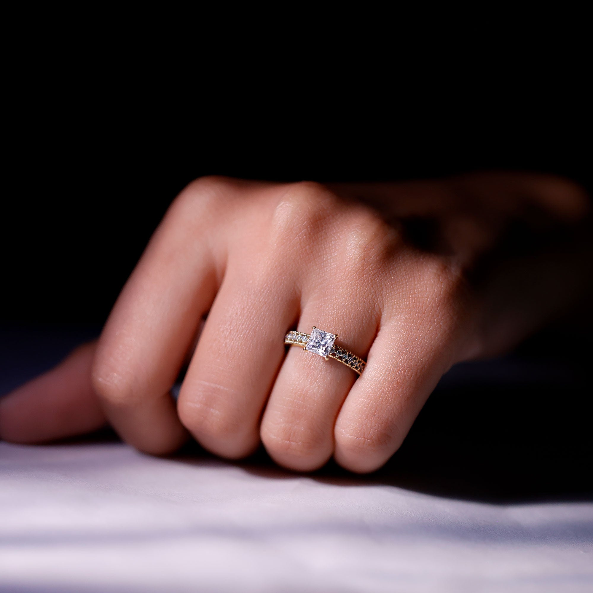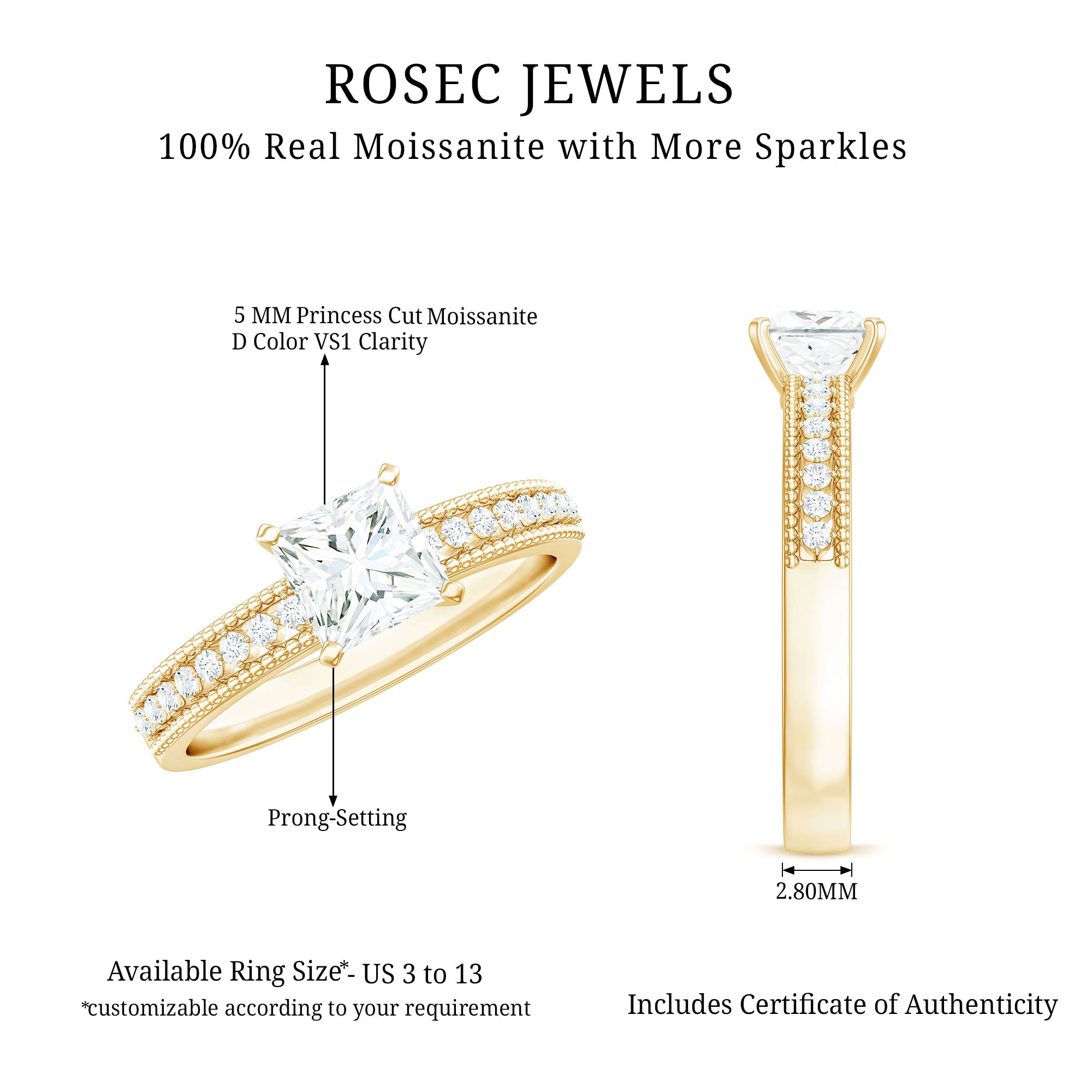 Add a touch of magic to your big day with this beautiful Princess Cut Moissanite Ring. Designed with timeless style in mind, this ring is perfect for making your special moments even more memorable. At the center is a sparkling 5 MM princess cut moissanite set in classic prong setting, shining brightly with every movement. The band adds even more charm with its detailed design, featuring small round stones along the shank for extra sparkle. Beaded accents line the band, giving the Square Engagement Ring a vintage-inspired feel that adds to its beauty. Every detail is carefully crafted to create a ring that feels elegant, romantic, and full of meaning. This Moissanite Engagement Ring is ideal for someone who loves both bold sparkle and classic elegance. Its clean lines and eye-catching center stone make it a timeless piece that will never go out of style. Whether you are beginning a new chapter or marking a special milestone, this Moissanite Solitaire Ring is a beautiful way to celebrate love and connection. With its graceful look and lasting shine, it is a piece you will treasure forever.