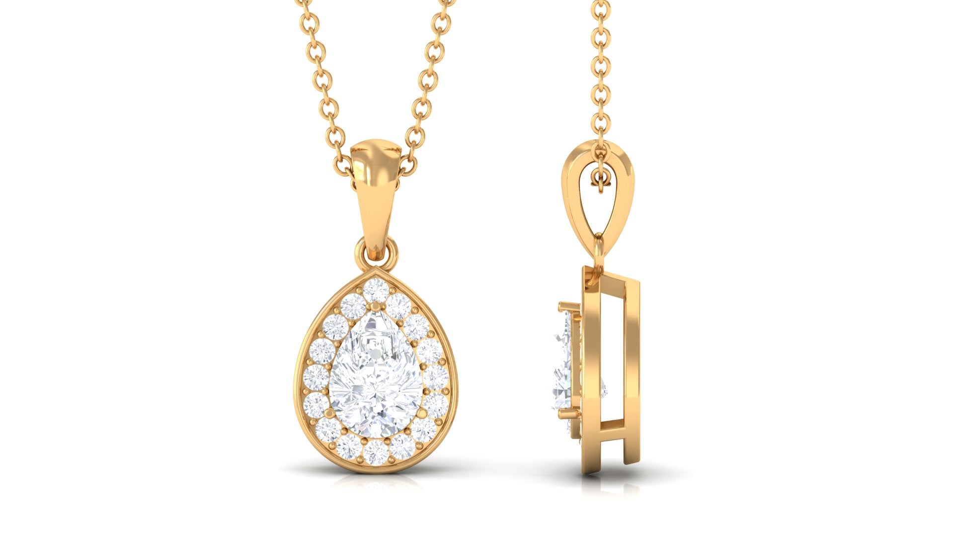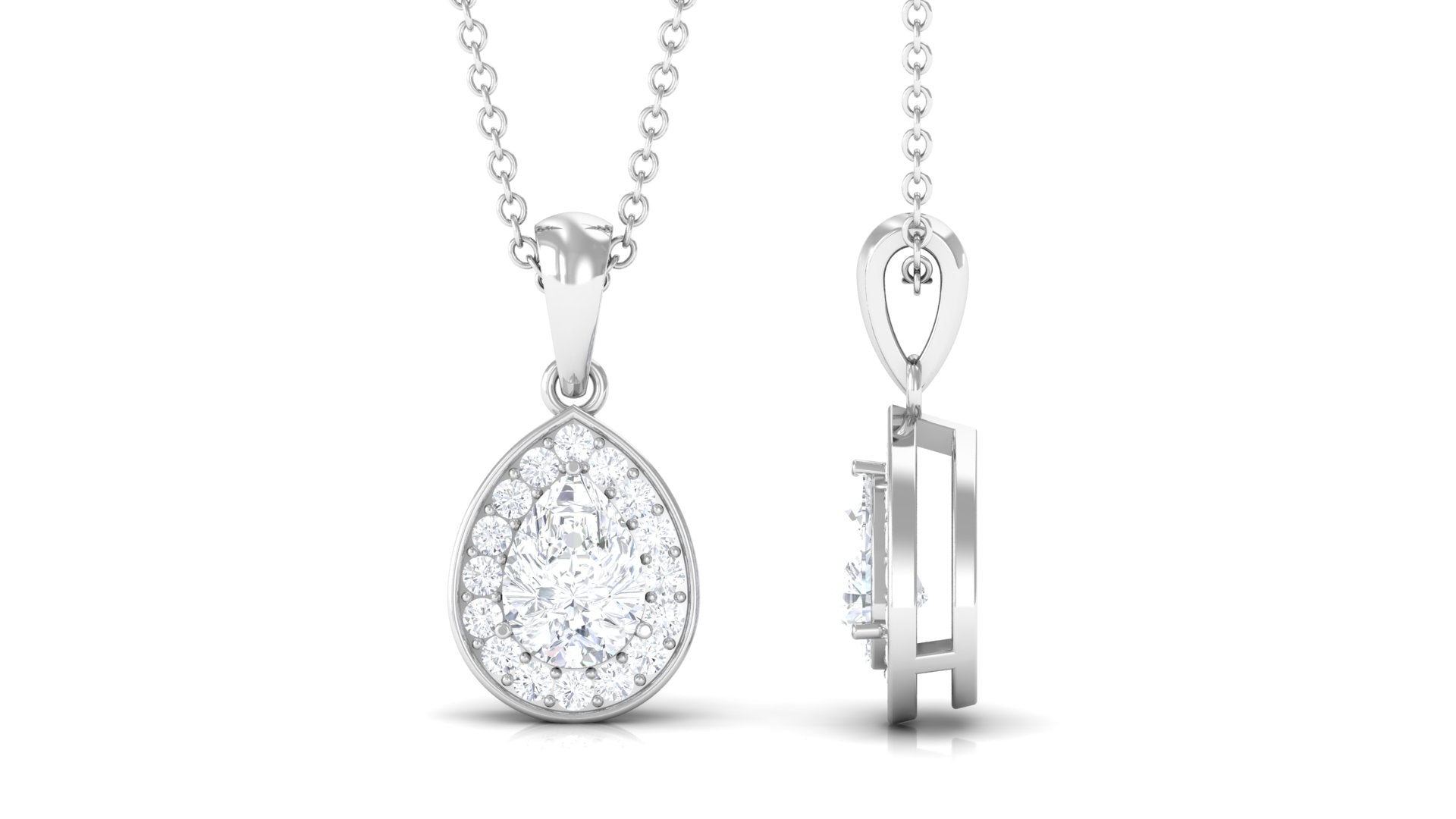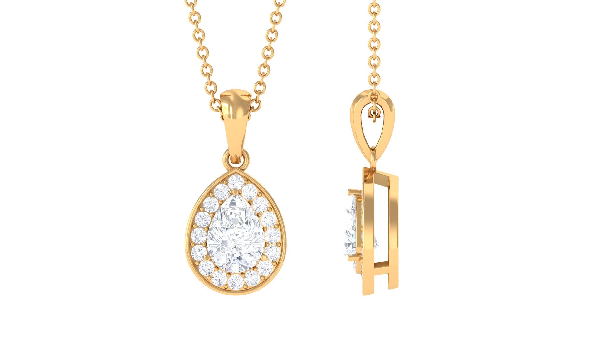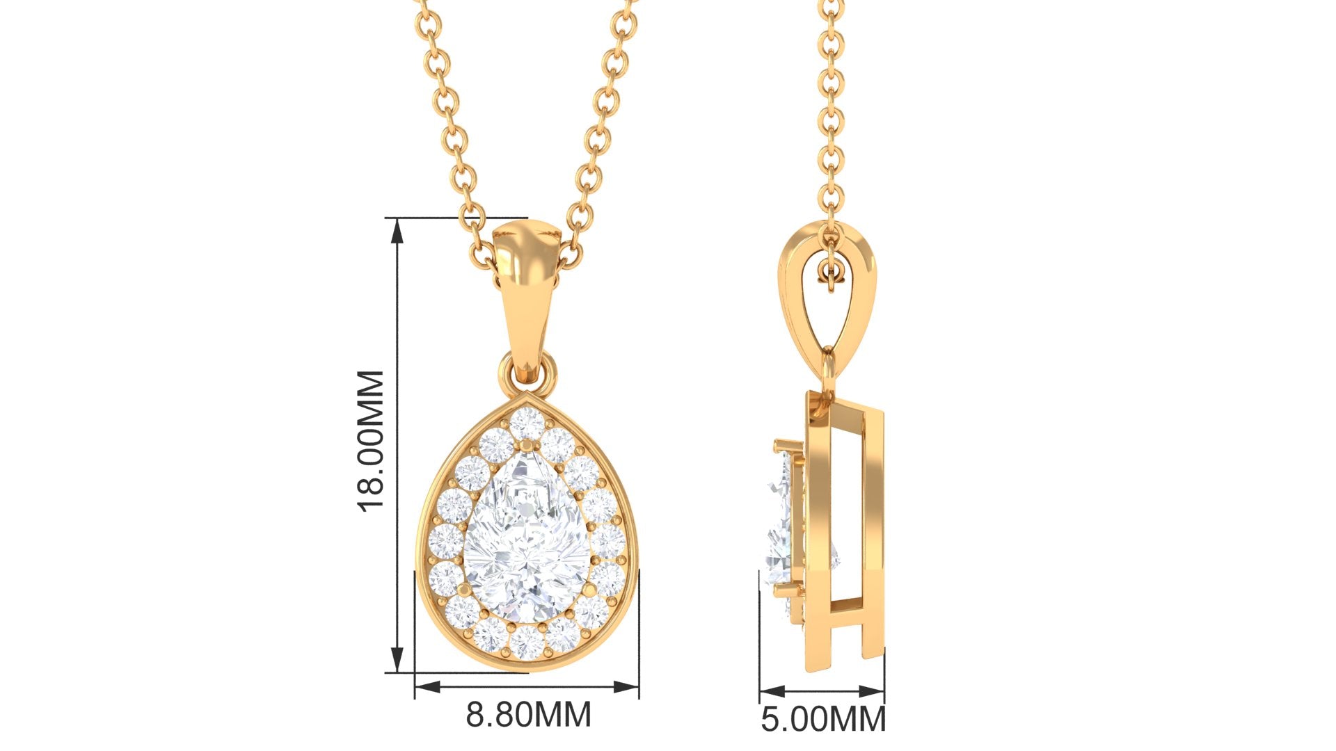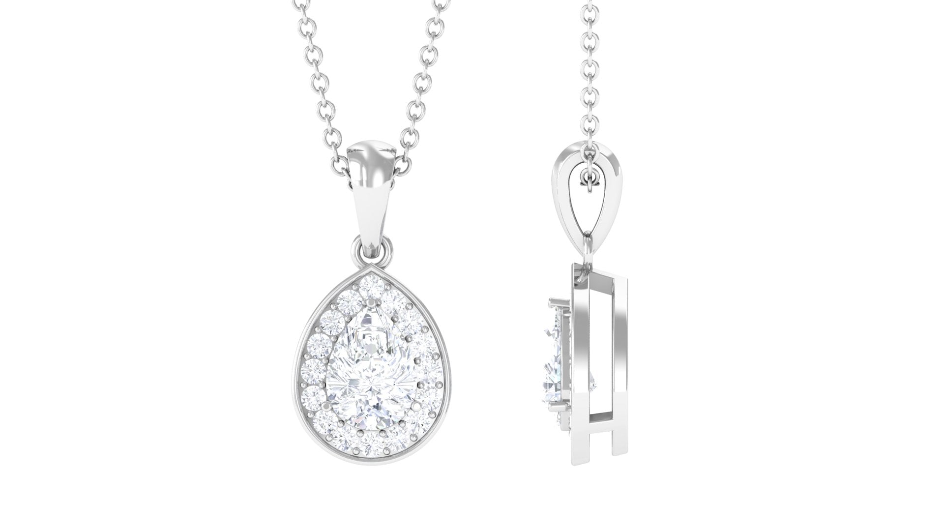 Make your look more regal when you wear this gorgeous Moissanite Pendant Necklace. Encrusted with the Pear Shape Moissanite in Prong Setting on this jewelry makes it a subtle jewelry for your everyday look. The Halo of Moissanite stones, lets it glitter your neckline in mere seconds. Making it the perfect addition to any jewelry collection. Coordinate this necklace with any ensemble for a stunning look.