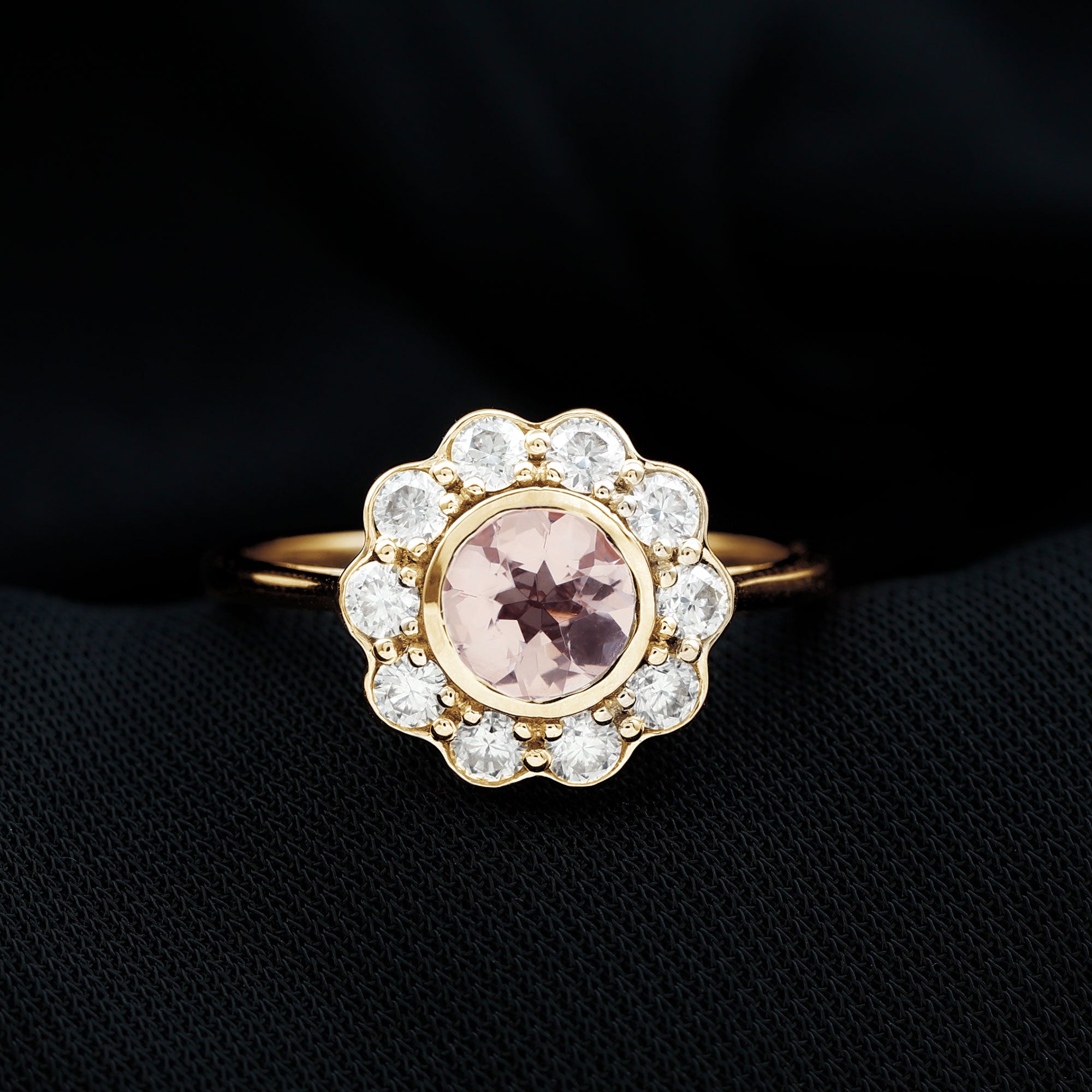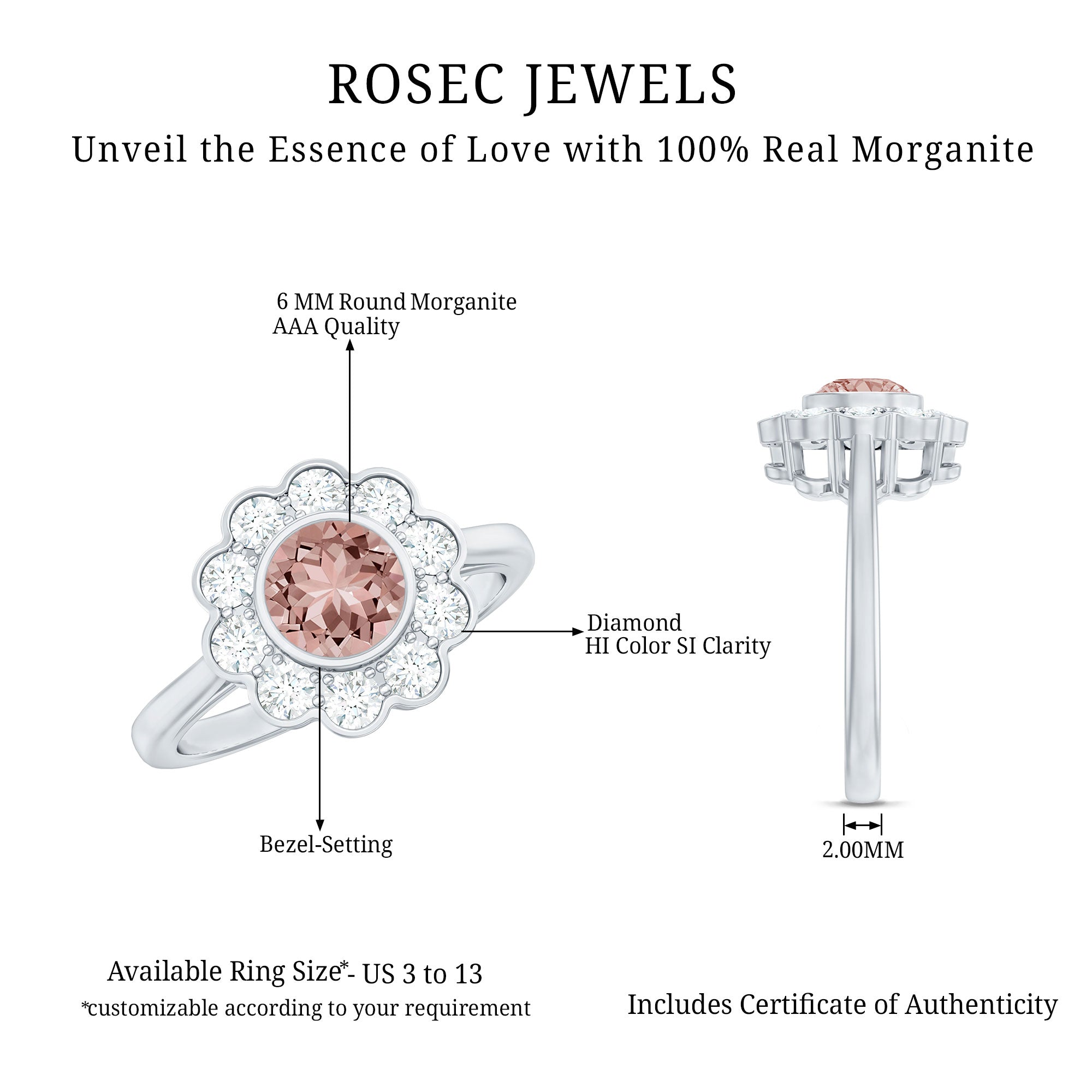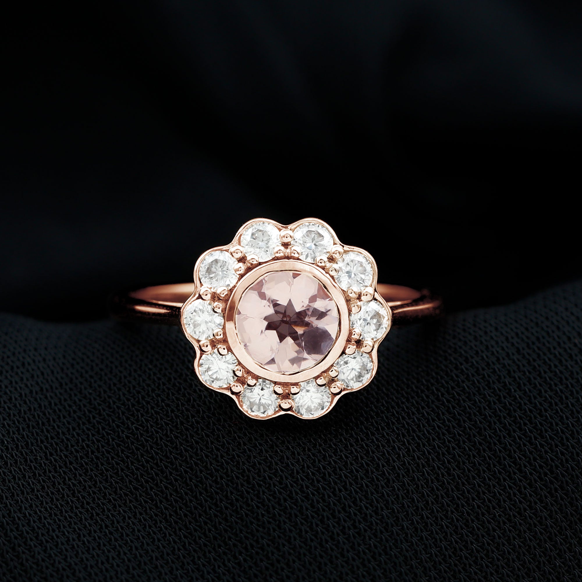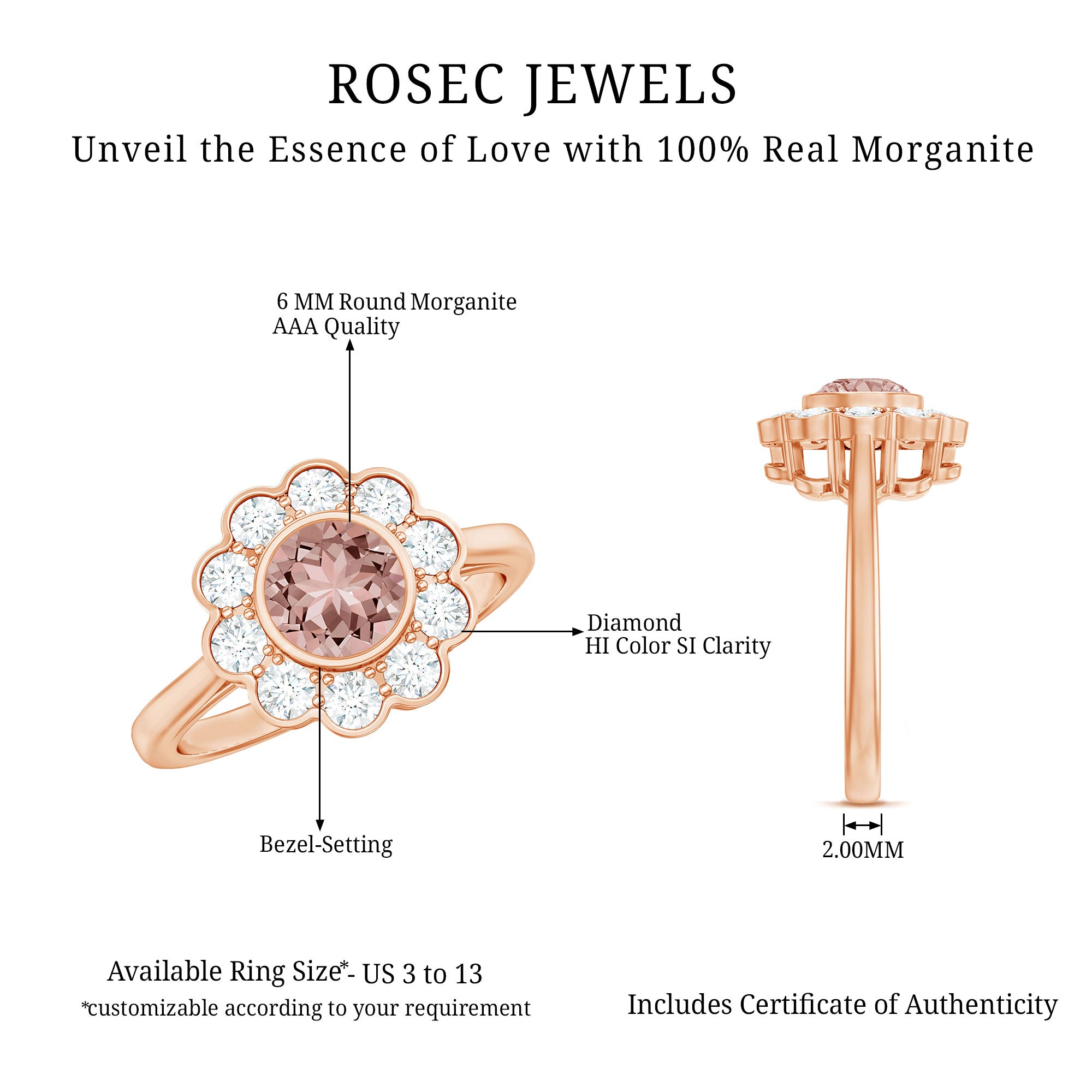 Embrace the beauty of nature with the Floral Engagement Ring featuring a Round Shape Morganite set in a secure bezel setting at the center. The dazzling Round Shape Diamond stones encasing the Morganite form the appearance of a delicate flower. Let the enchanting design of this ring bloom on your finger and celebrate your special moments with timeless style.