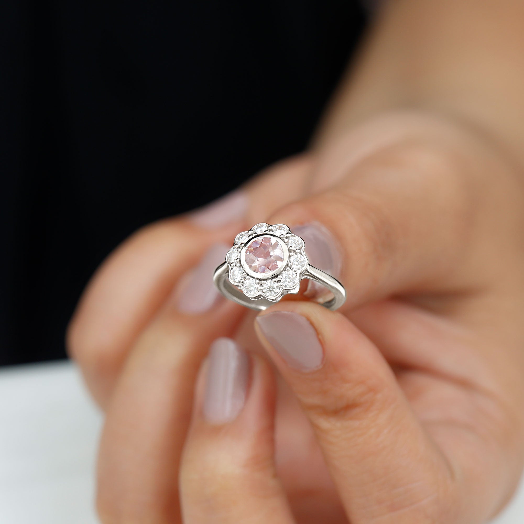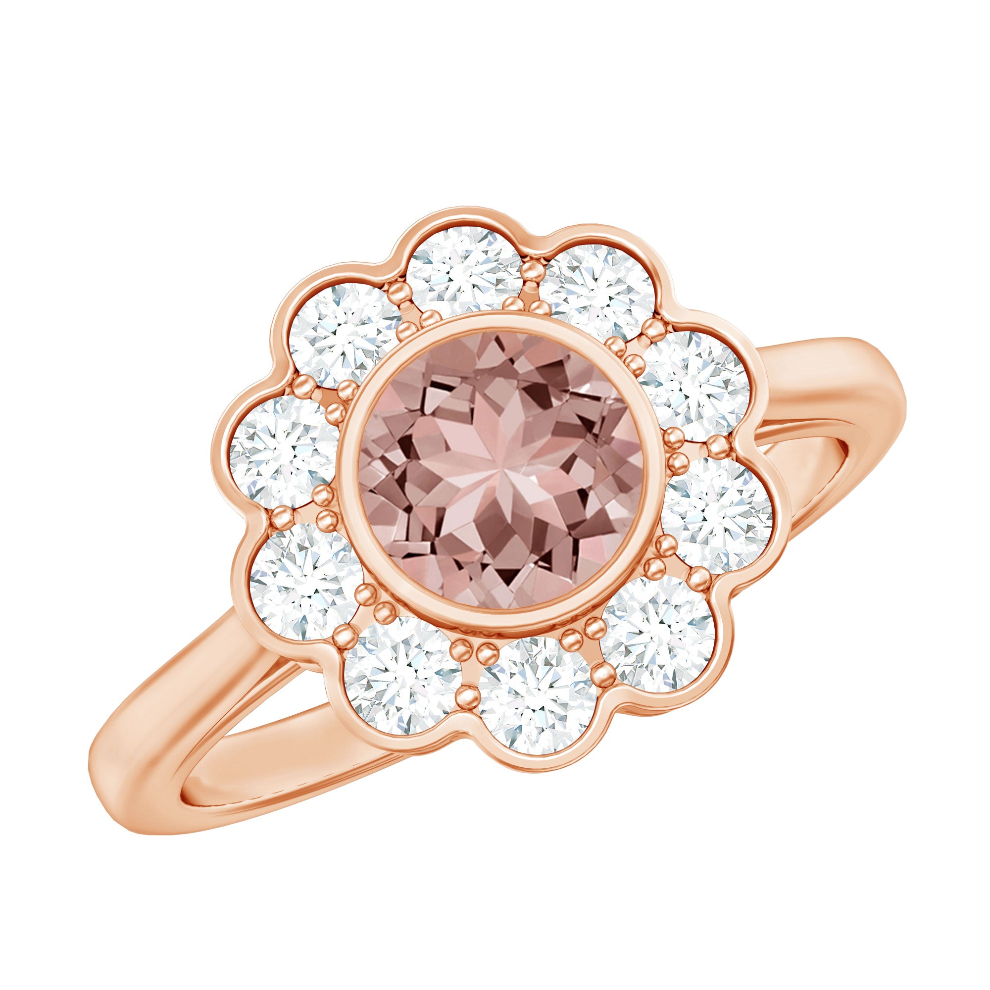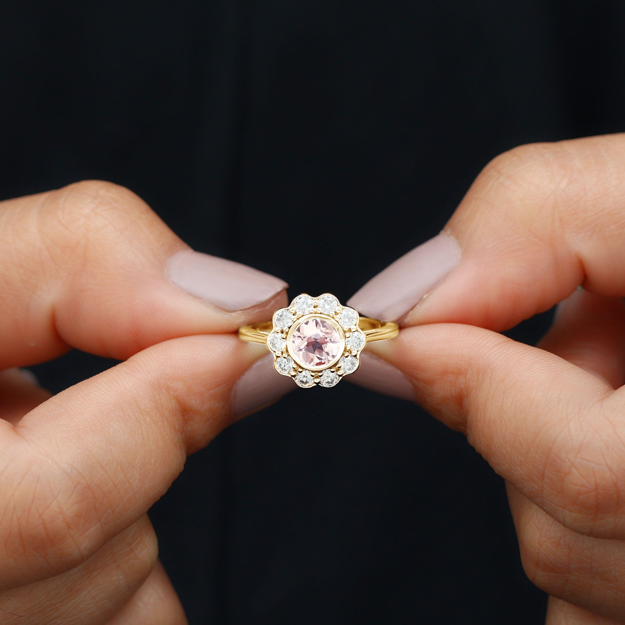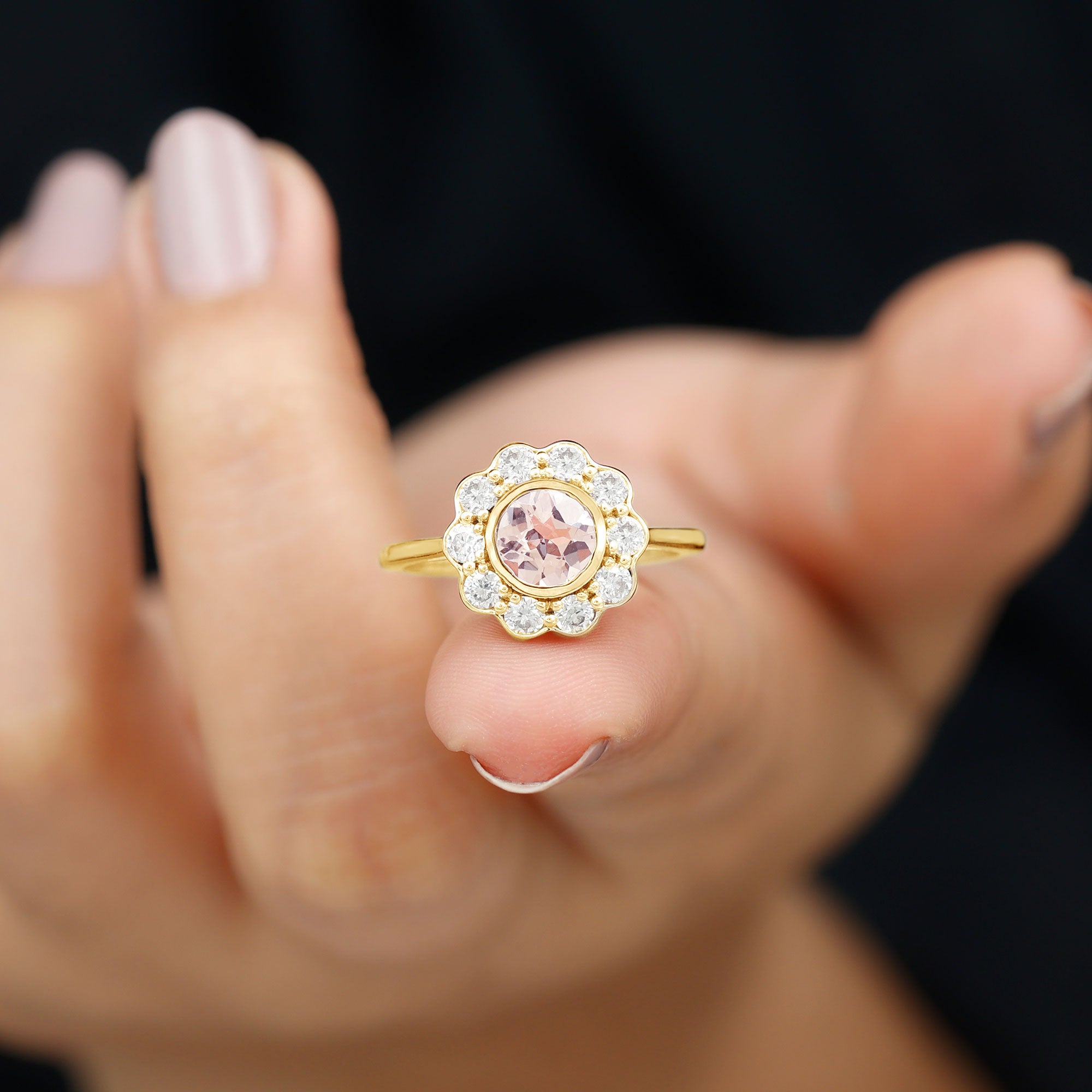 Embrace the beauty of nature with the Floral Engagement Ring featuring a Round Shape Morganite set in a secure bezel setting at the center. The dazzling Round Shape Diamond stones encasing the Morganite form the appearance of a delicate flower. Let the enchanting design of this ring bloom on your finger and celebrate your special moments with timeless style.
