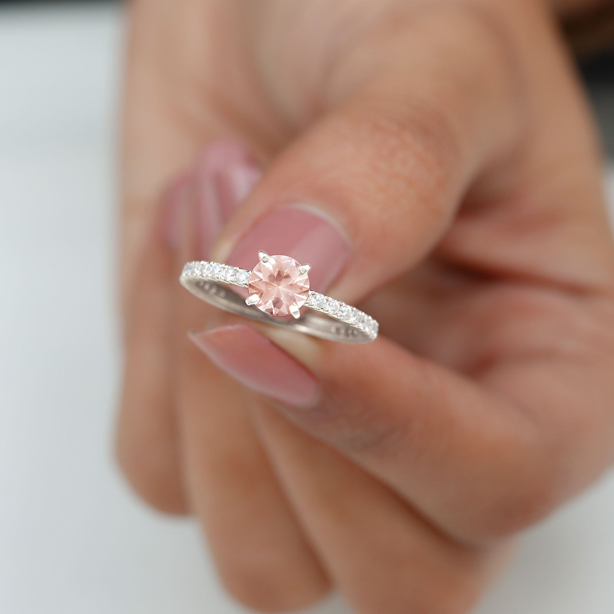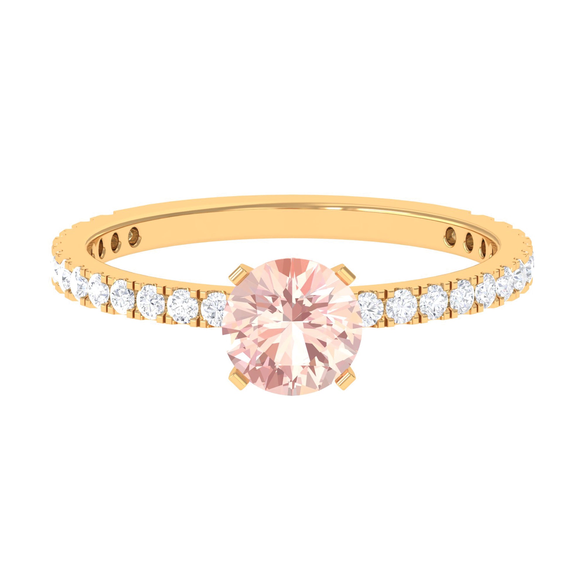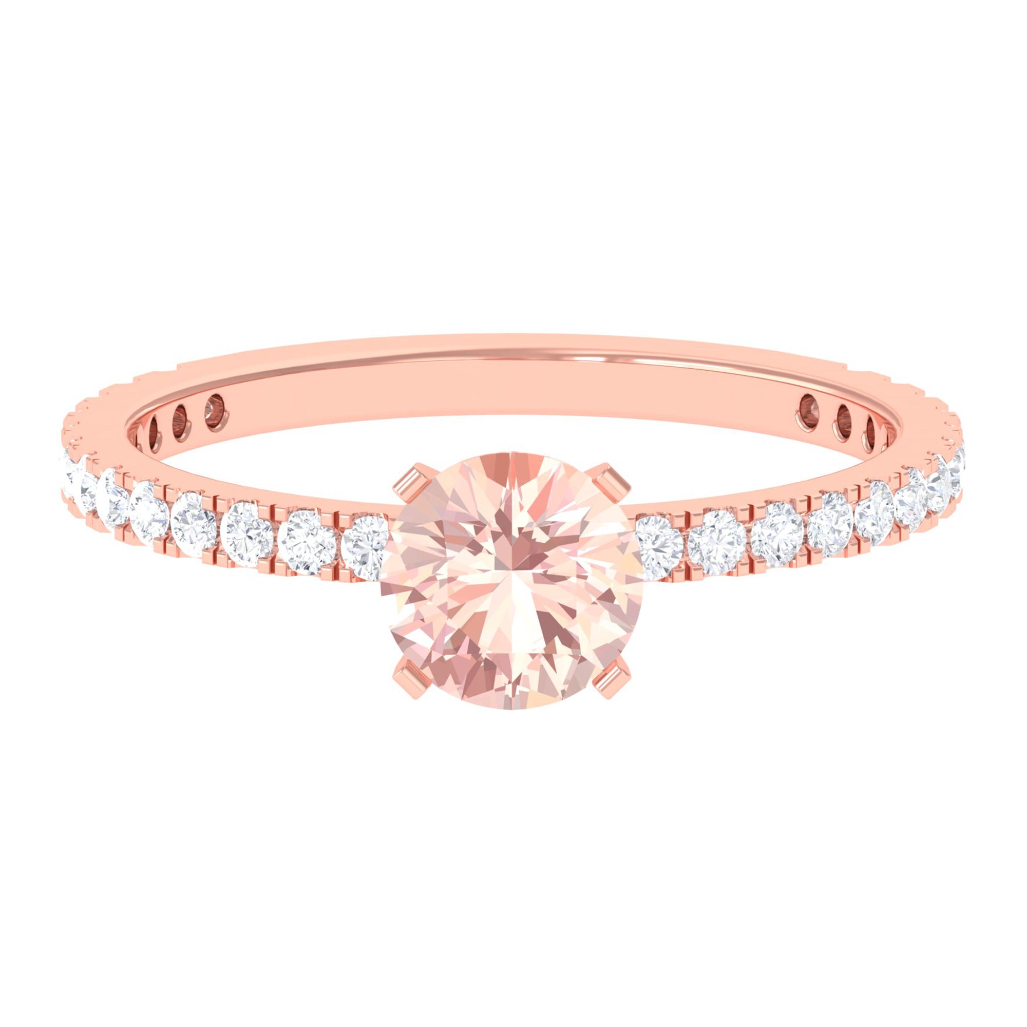 Irrespective of your outfit, the Morganite Ring ensures youll radiate on any occasion. This Solitaire Ring showcases a round morganite in a Peg Head Setting, complemented by round Diamond Stones that grace the shank in a French Pave Setting. Display your impeccable style by gifting this October Birthstone Ring as an anniversary present to your loved one, leaving a lasting impact.