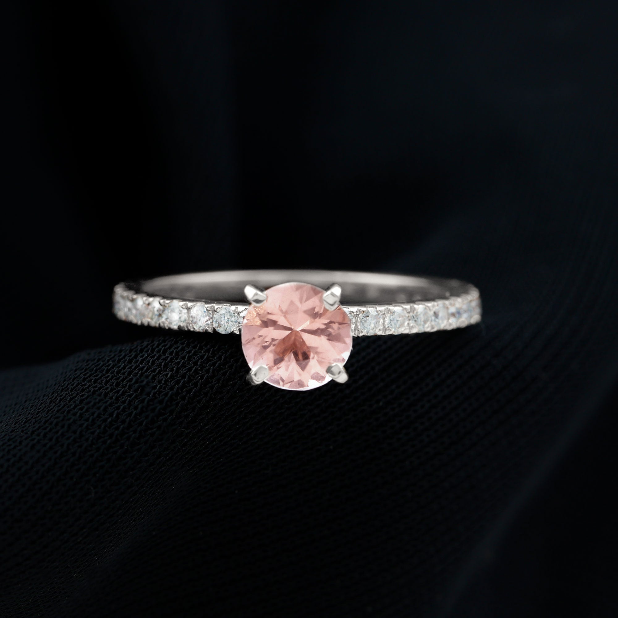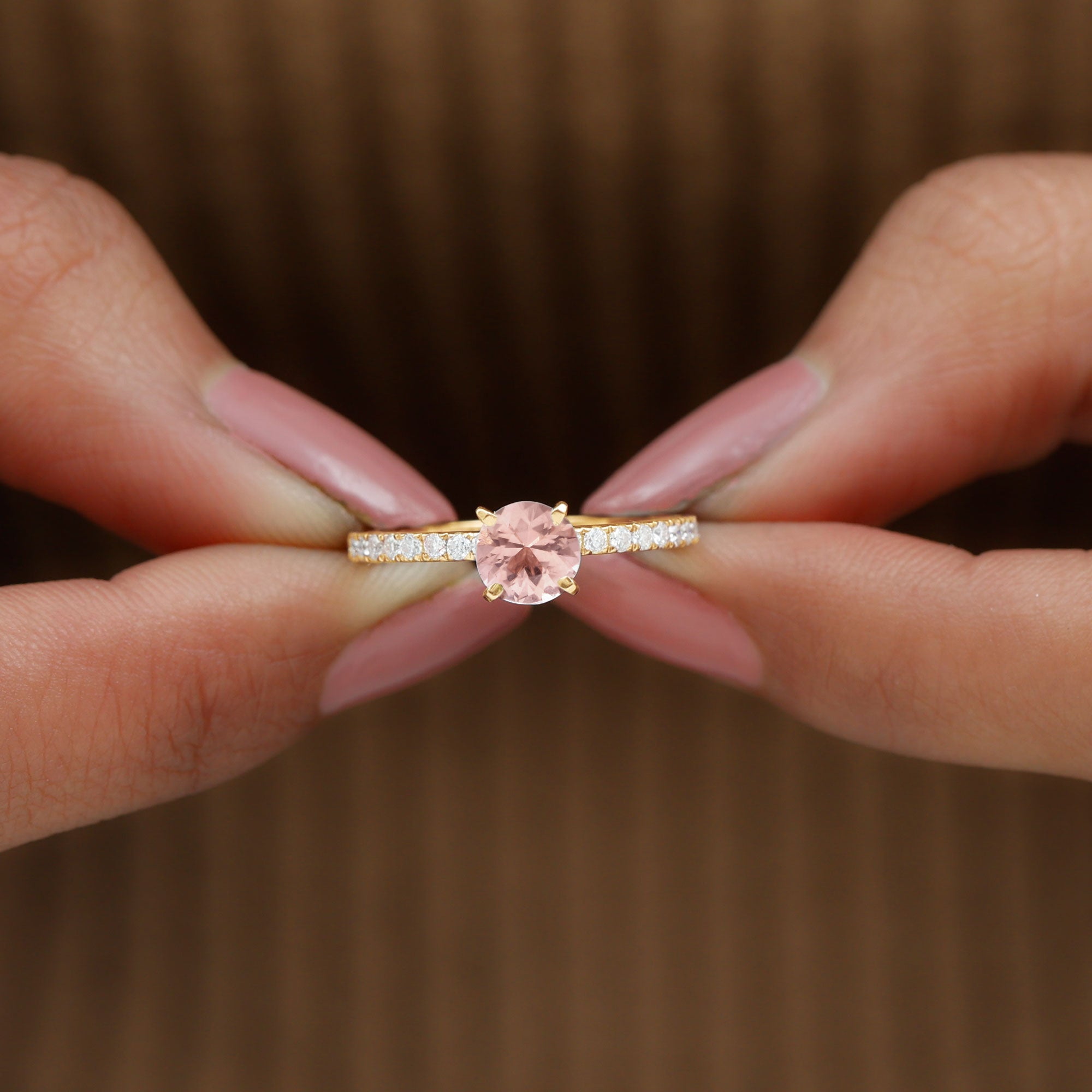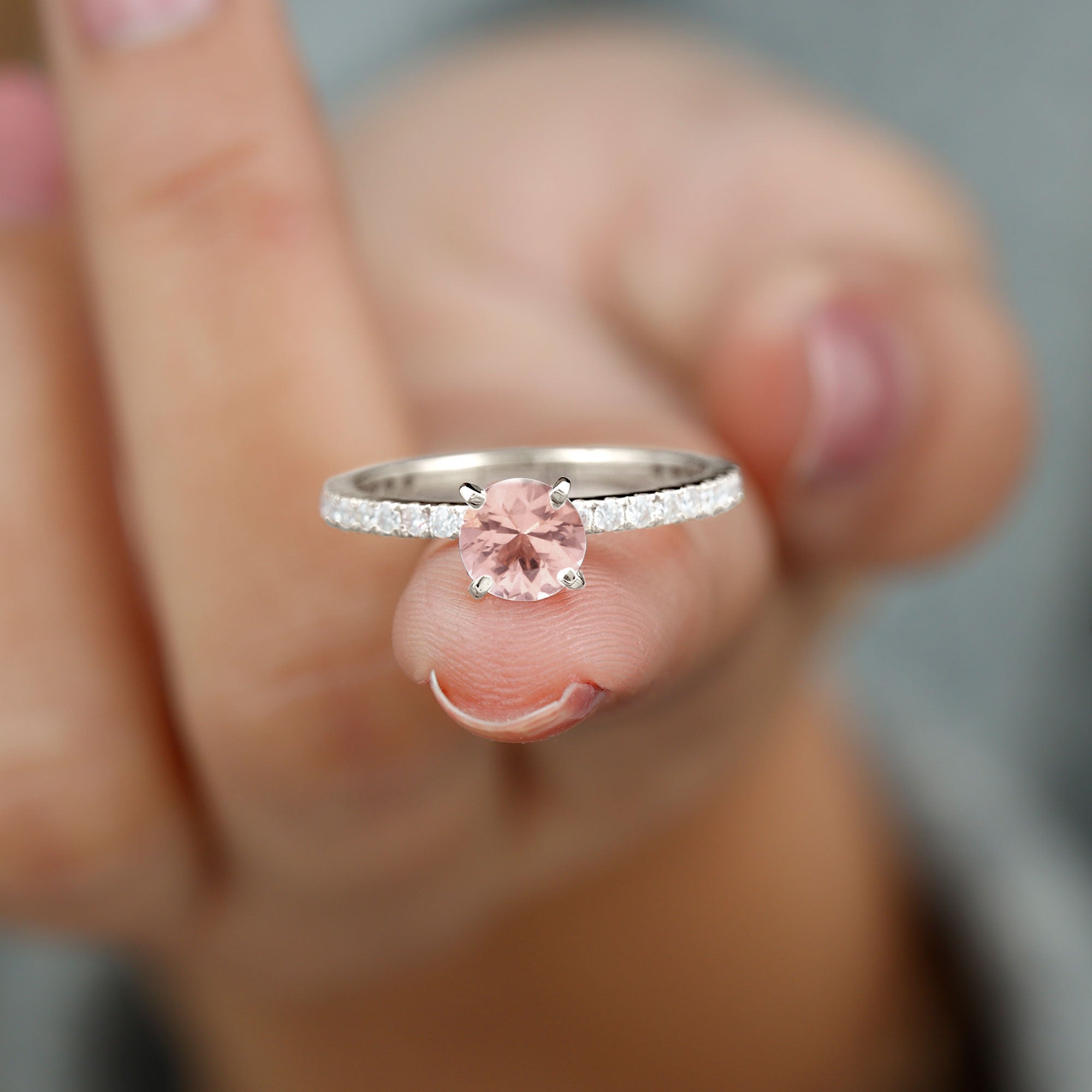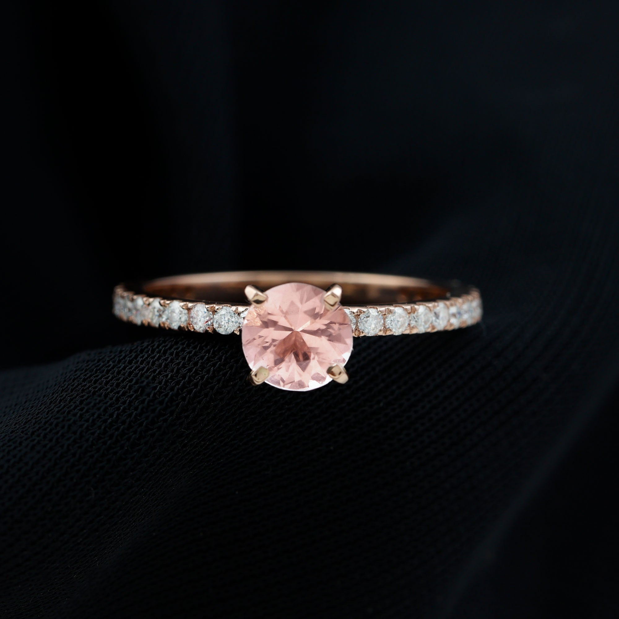 Irrespective of your outfit, the Morganite Ring ensures youll radiate on any occasion. This Solitaire Ring showcases a round morganite in a Peg Head Setting, complemented by round Diamond Stones that grace the shank in a French Pave Setting. Display your impeccable style by gifting this October Birthstone Ring as an anniversary present to your loved one, leaving a lasting impact.