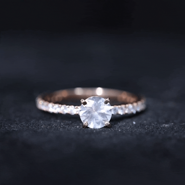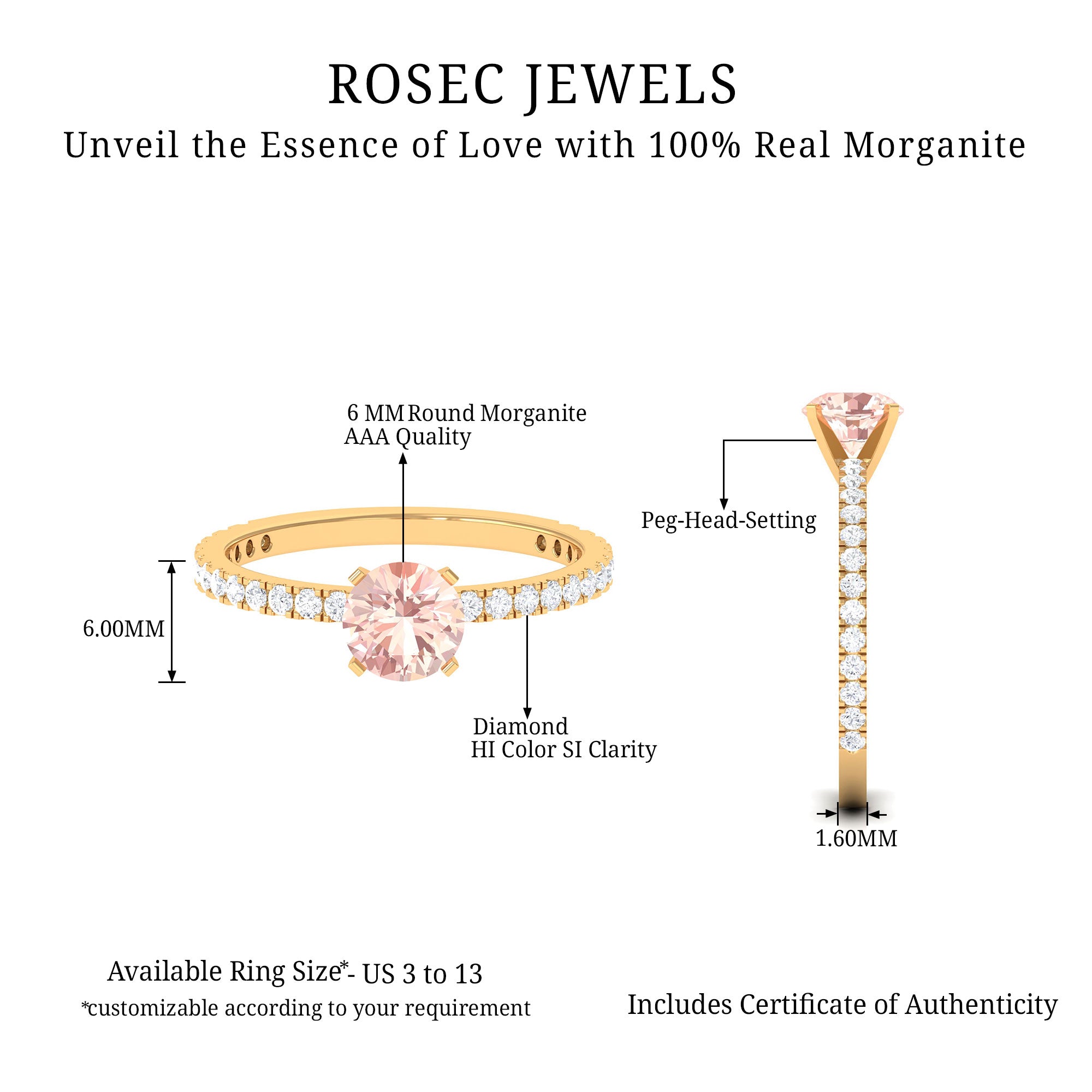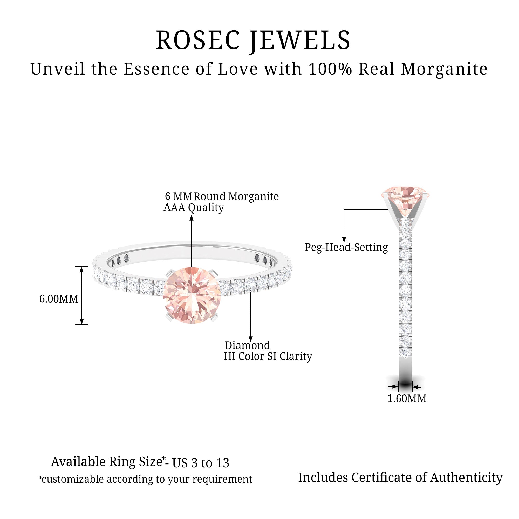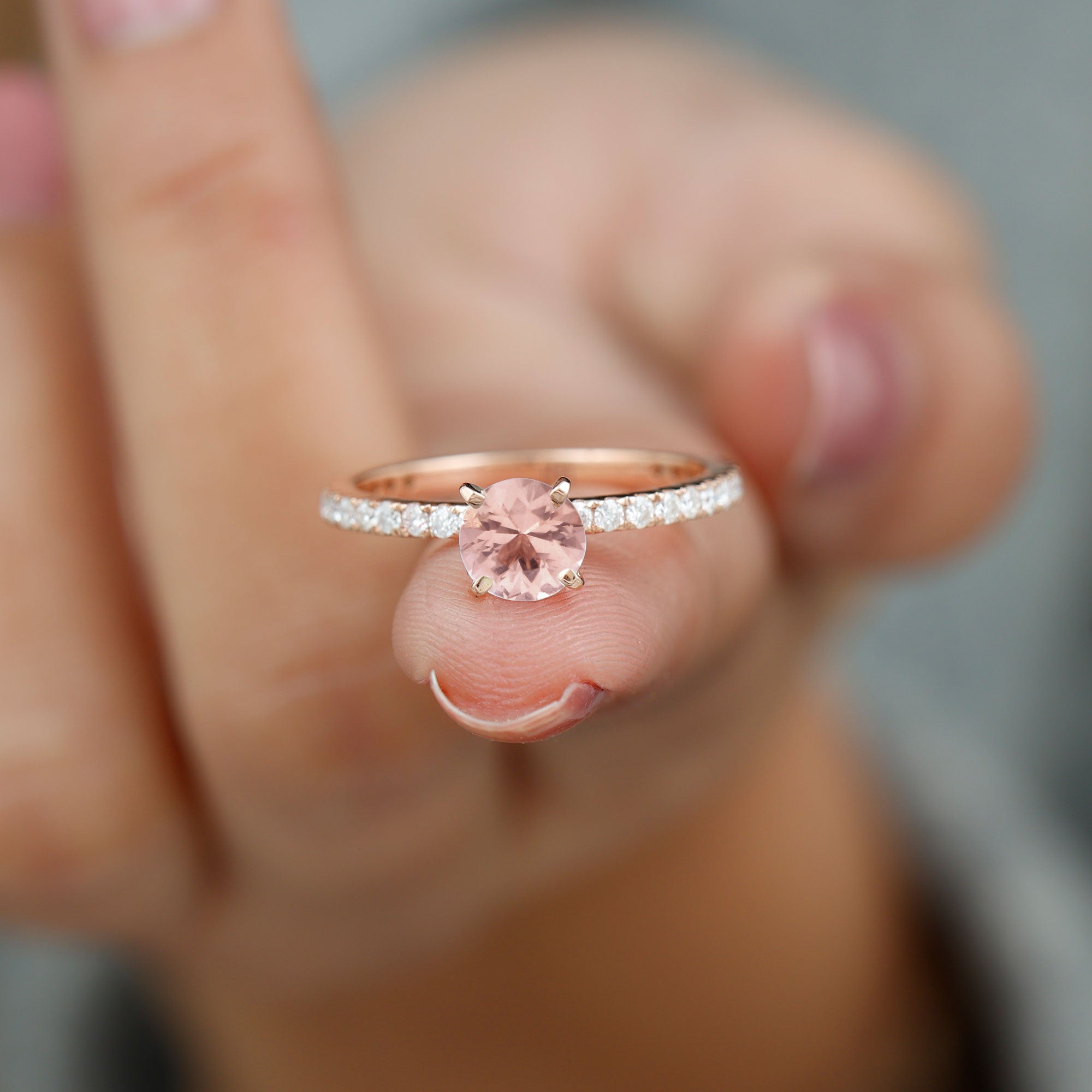 Irrespective of your outfit, the Morganite Ring ensures youll radiate on any occasion. This Solitaire Ring showcases a round morganite in a Peg Head Setting, complemented by round Diamond Stones that grace the shank in a French Pave Setting. Display your impeccable style by gifting this October Birthstone Ring as an anniversary present to your loved one, leaving a lasting impact.