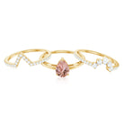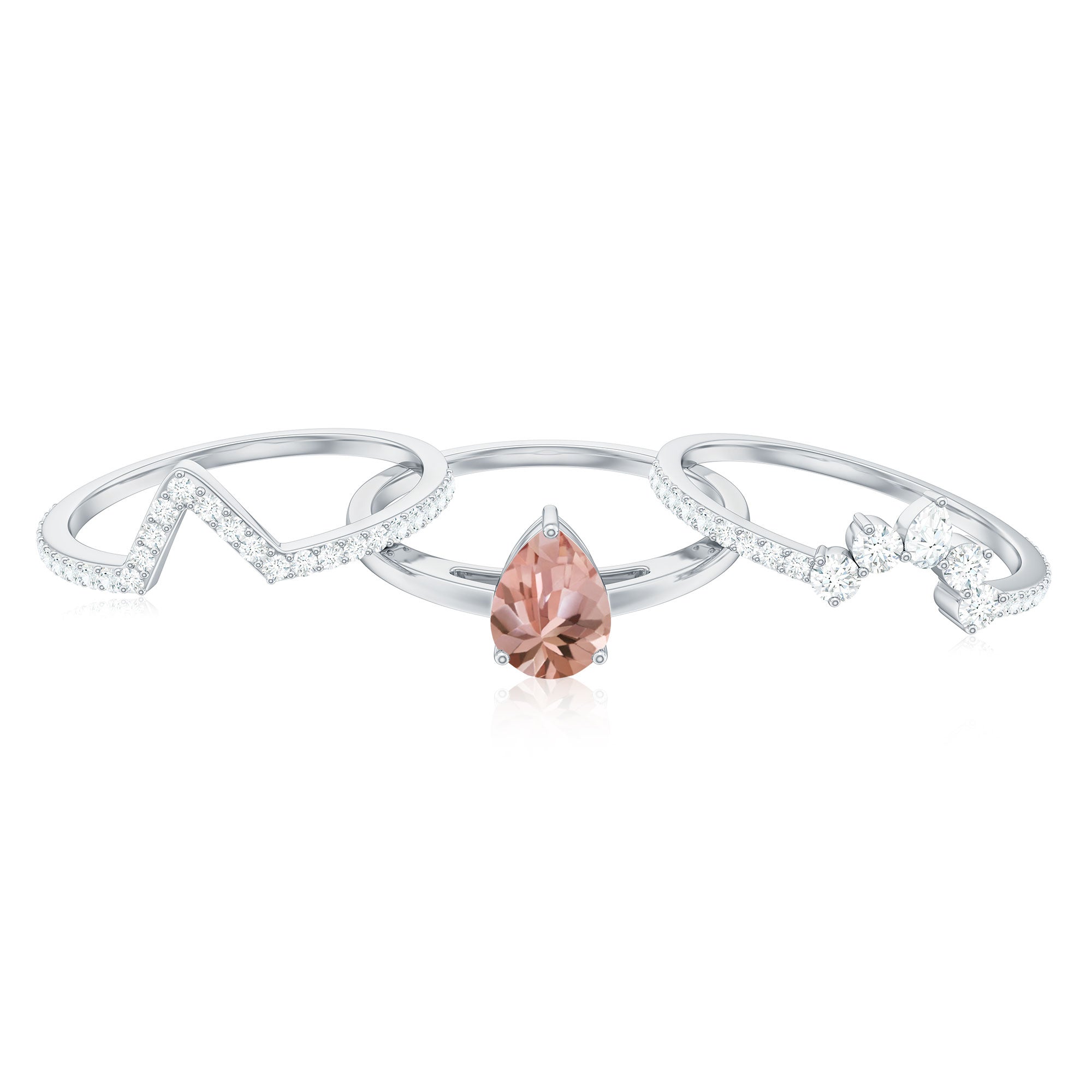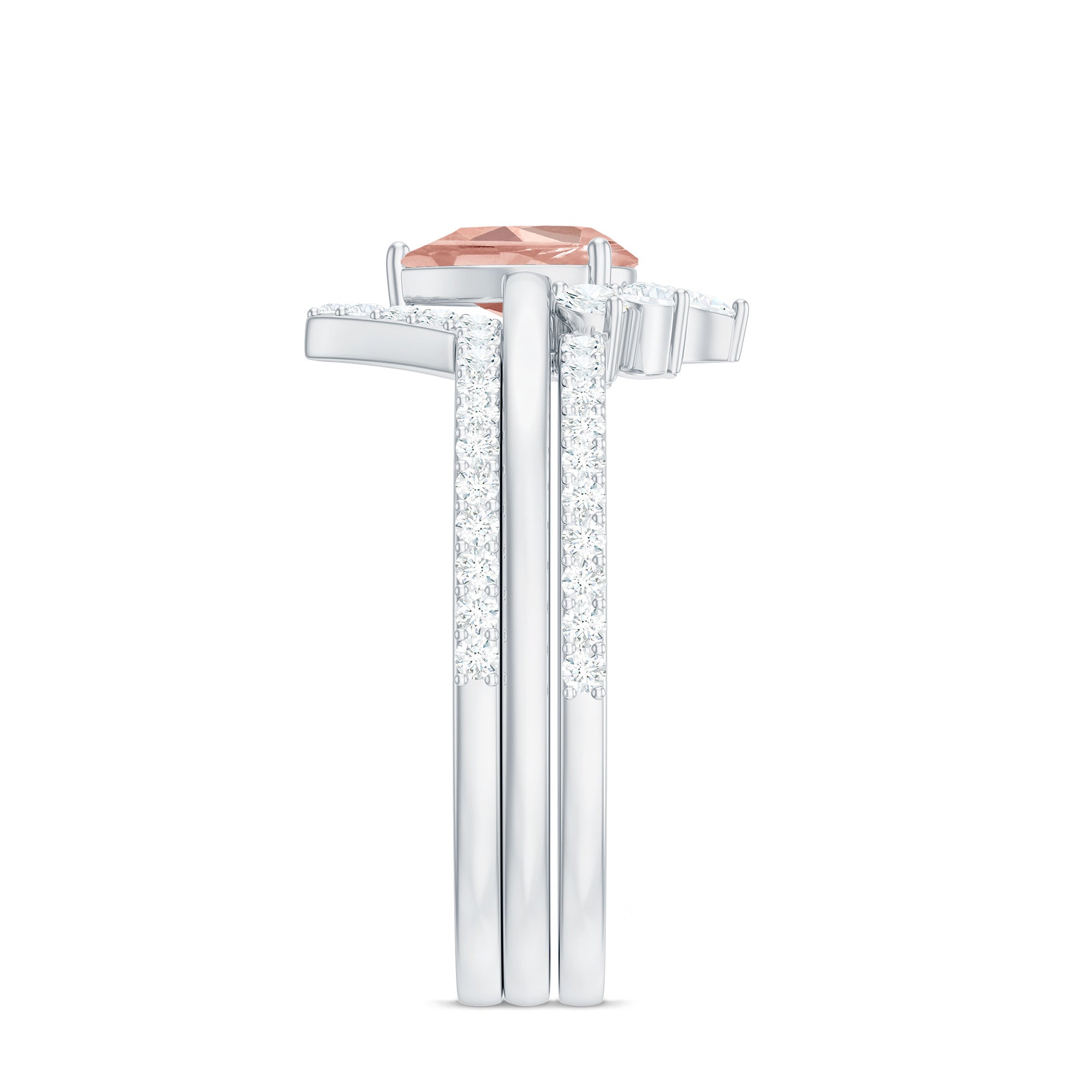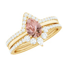 Make her big day even more memorable with this stunning Three Ring Set adorned with pear cut Morganite set as Solitaire in one ring with two enhancer featuring round Diamond stones. This Bridal Ring Set is a splendid choice for any woman, exuding elegance and sophistication. Surprise your lady with this exquisite Diamond ring set and let it be a cherished piece shell treasure forever, representing the beauty of your love on her big day.