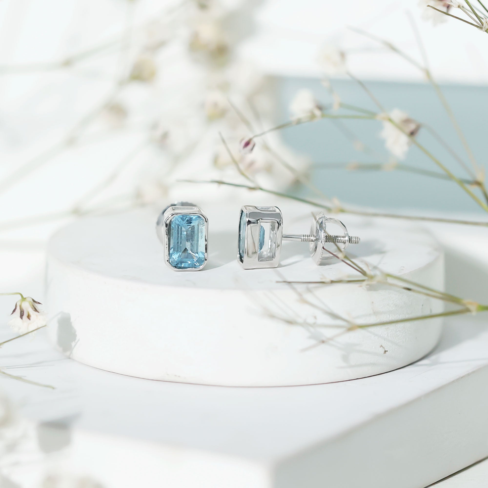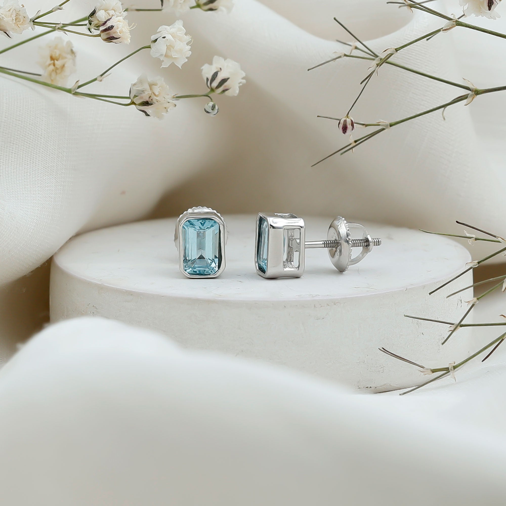 Looking for a perfect day-to-day jewelry, weve got your back with these Aquamarine Stud Earrings, precisely crafted with 14K White Gold Plated Silver. The big earrings feature a 4X6 MM Emerald Cut Aquamarine secured in Bezel Setting. These Emerald Cut Earrings can be a perfect option to be styled with formal looks that give a vibrant hue to the gemstone. These Earrings with Screw on Backs stays on place throughout the day. The Solitaire Earrings will be delivered to you in a premium quality packaging with the certificate of authenticity.